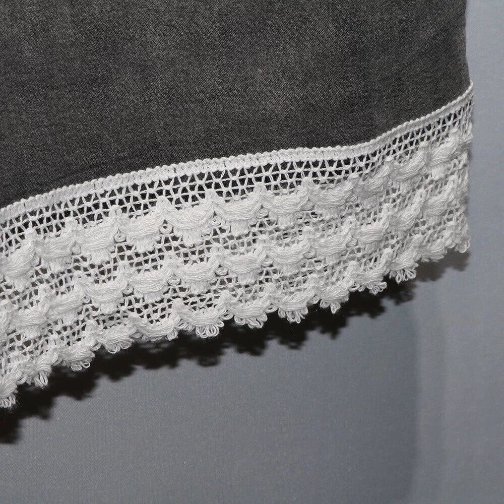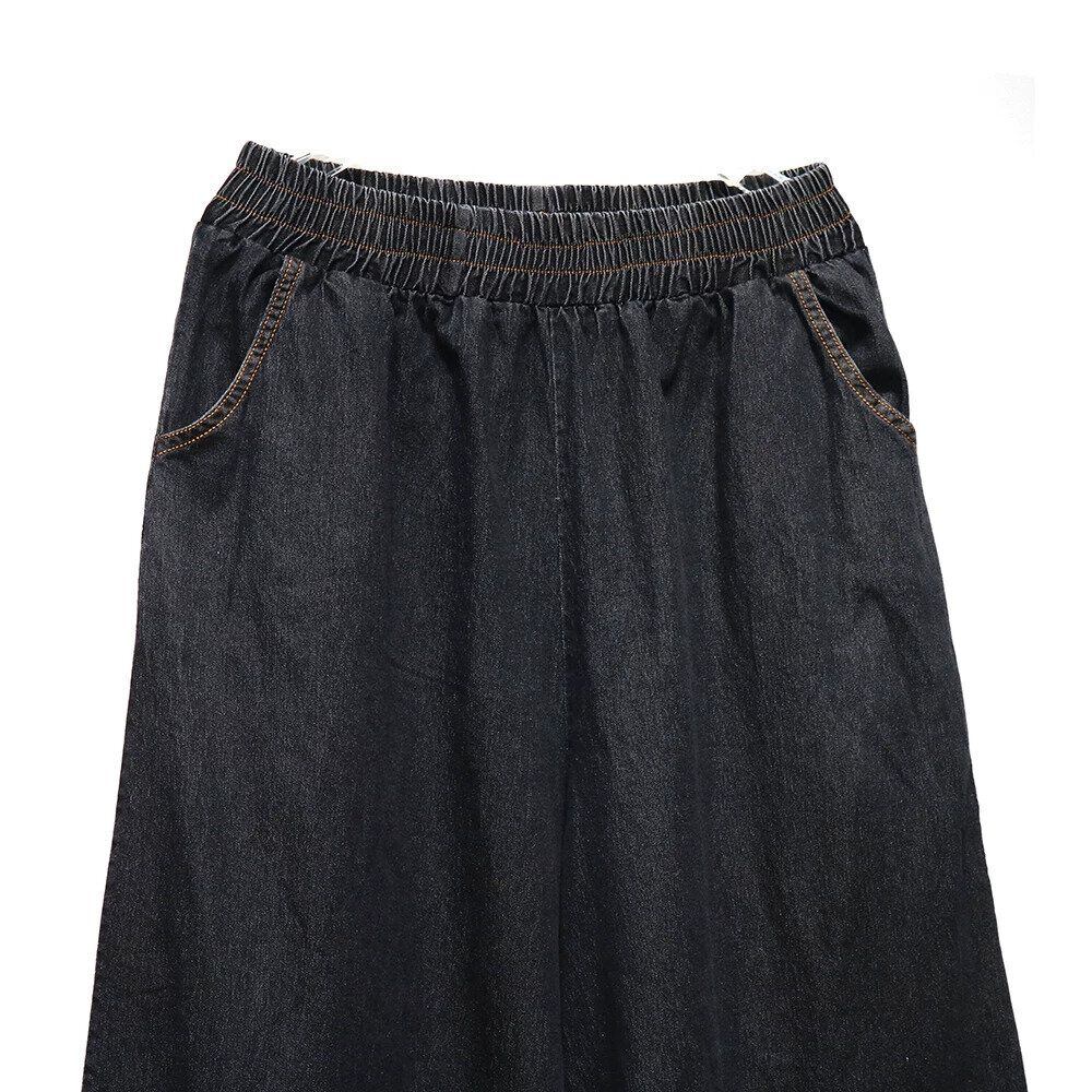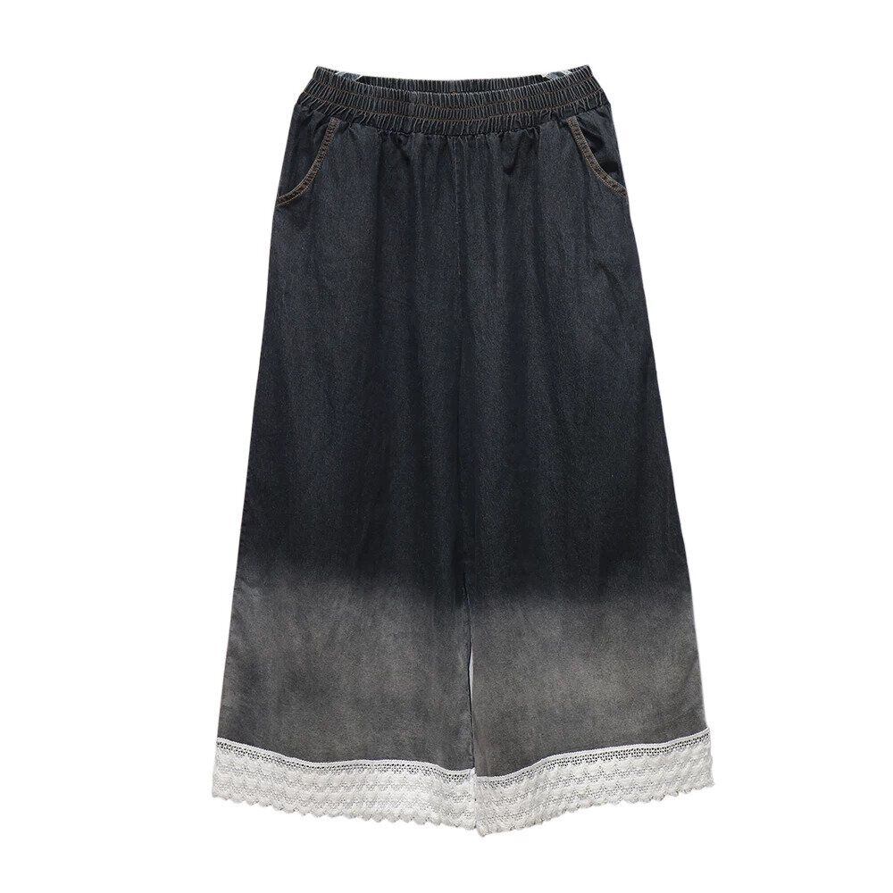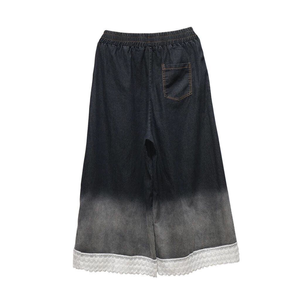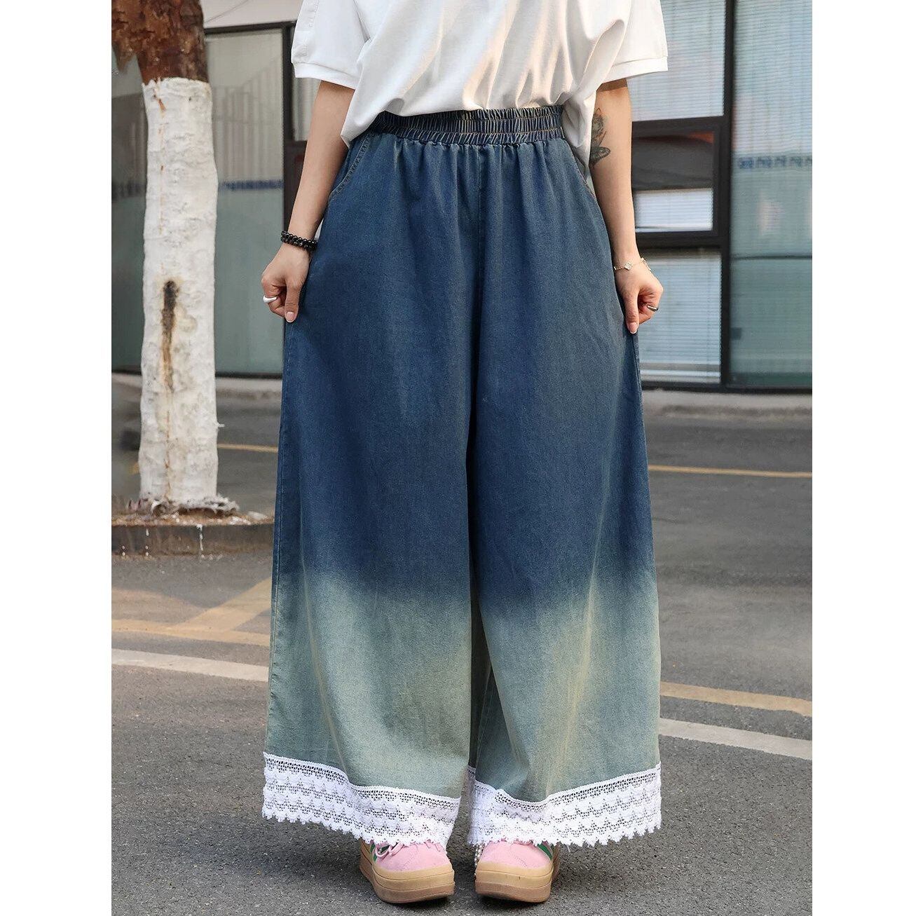 グラデーションや裾のレースがお洒落な、ワイドレッグ・デニムパンツです。ウエストはゴムなので、着脱が簡単で履き心地が良いです。ロングスカートのようなAラインのシルエットが魅力的なアイテムです。色は2色から選べます。