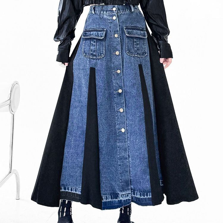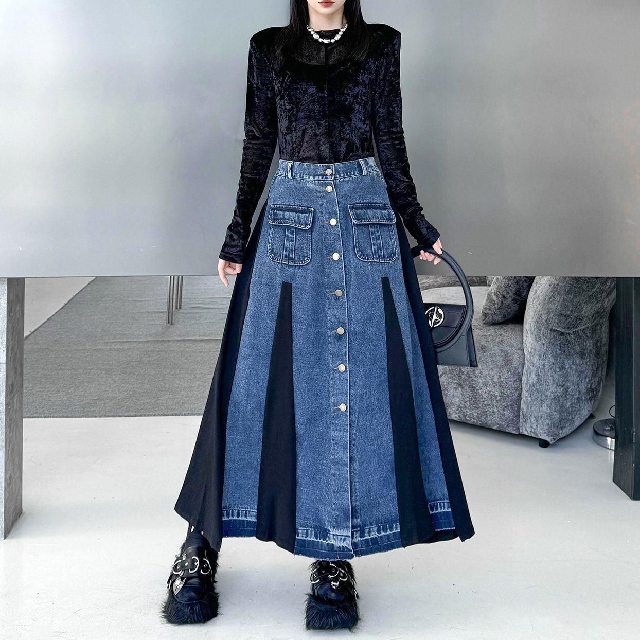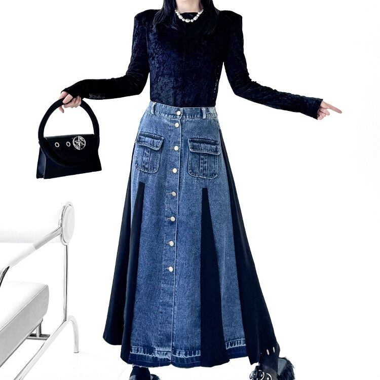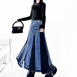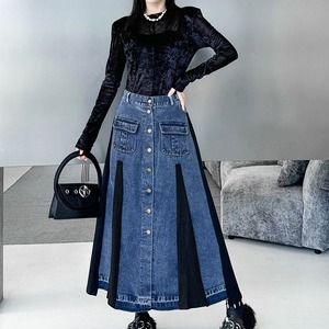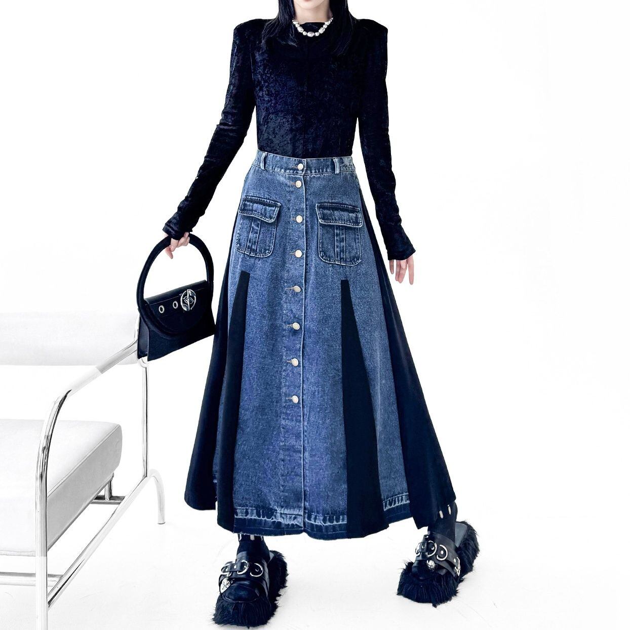 BLACK STITCH A-LINE LONG DENIM SKIRT 1color M-16273