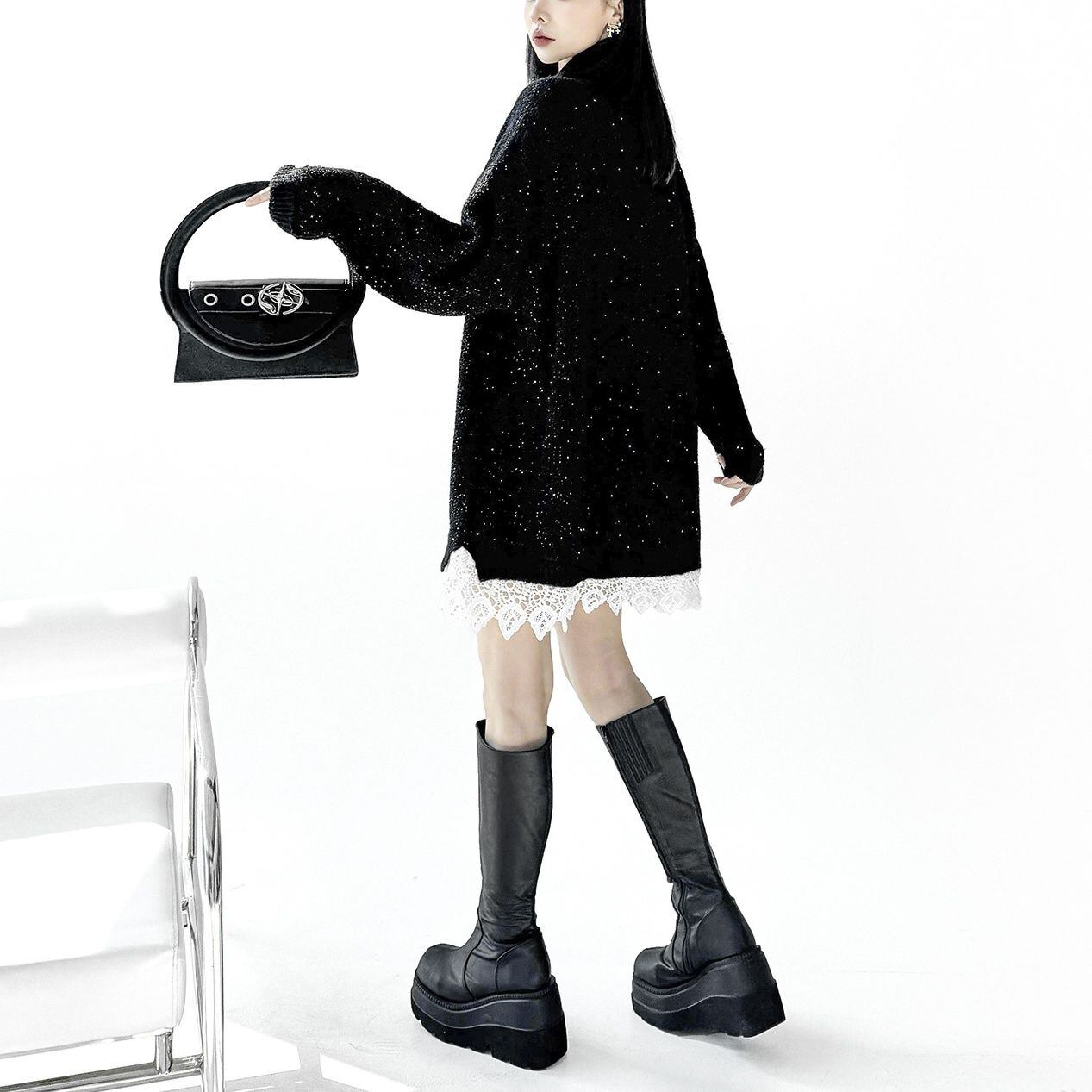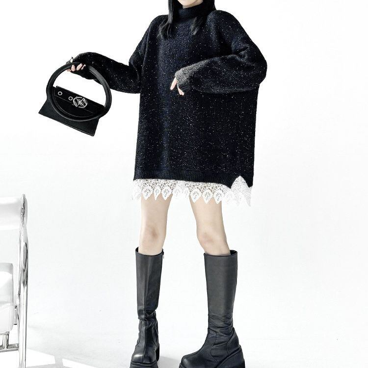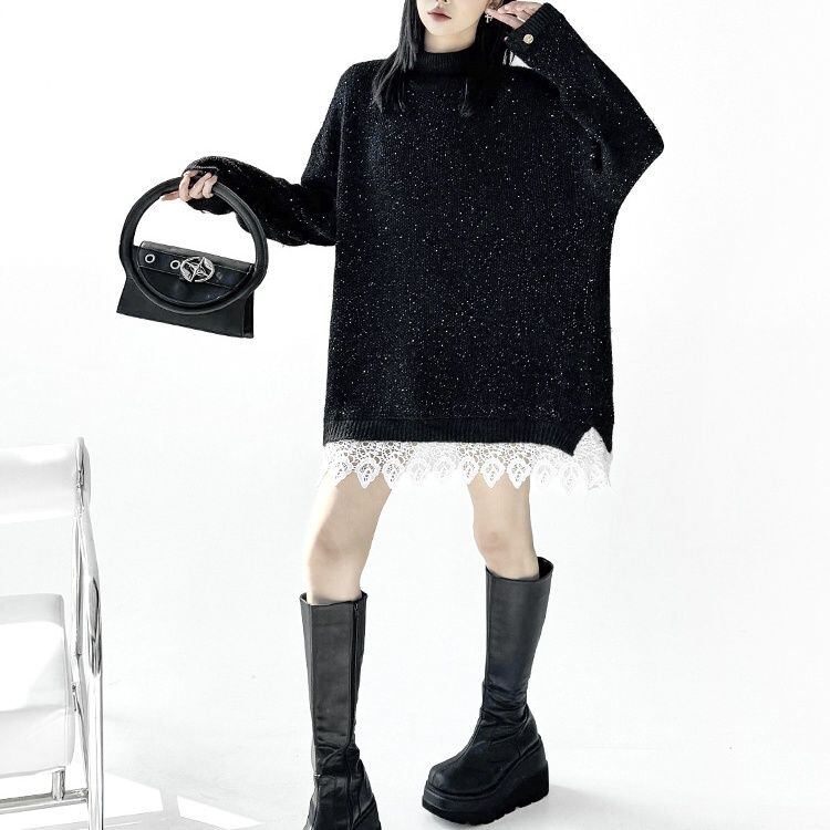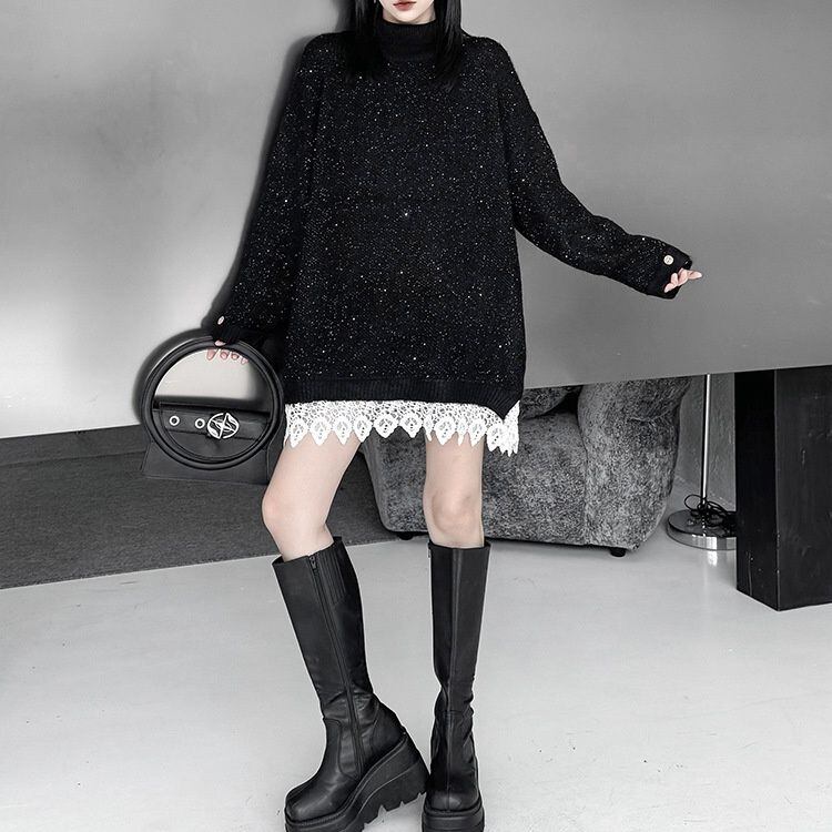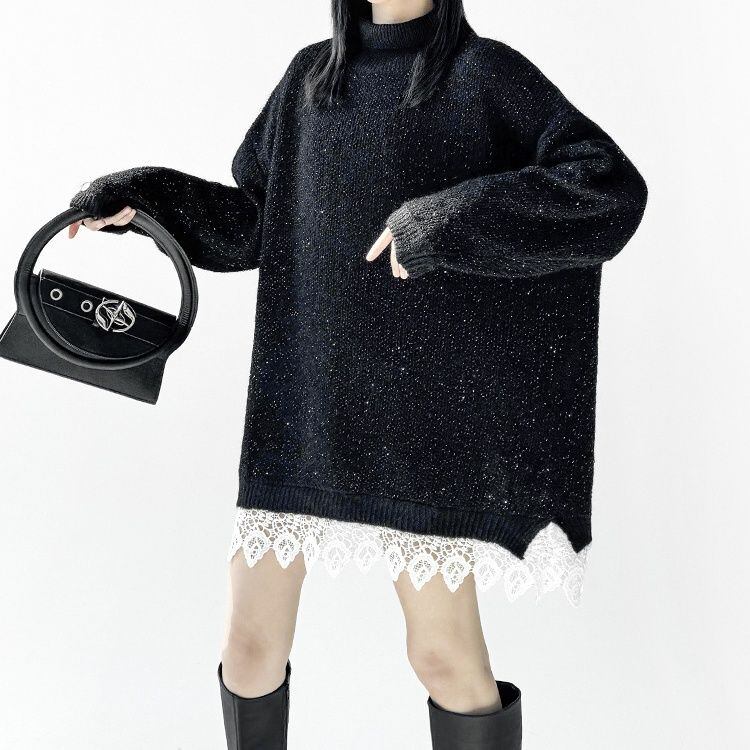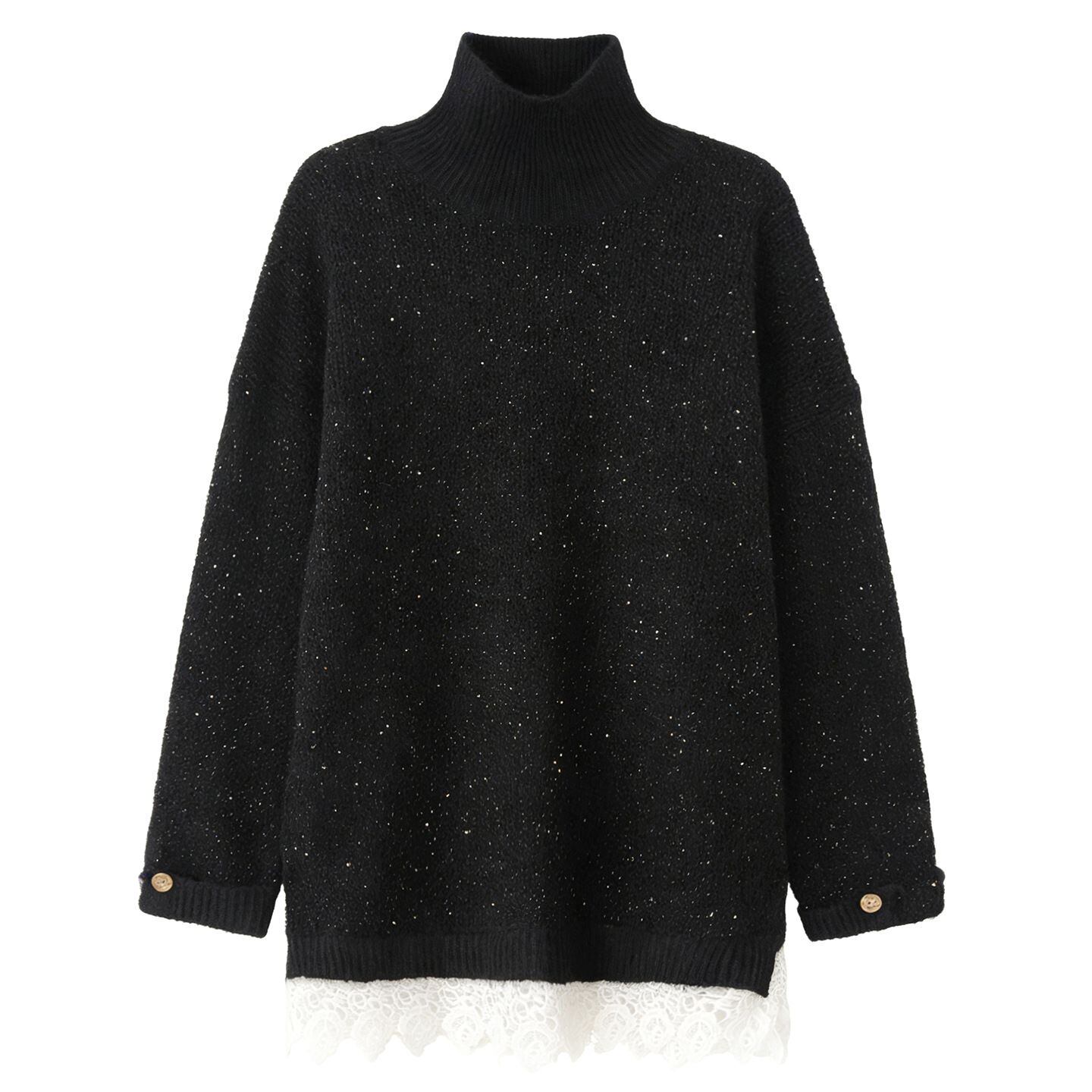 ブラックに小さなスパンコールが輝く、タートルネック・長袖・チュニック丈のプルオーバーニットです。裾には白いレース飾りがついて、ガーリーさをプラスしています。ゆったりとしたシルエットで、ミニ丈のワンピースとしても使えるキュートなアイテムです。