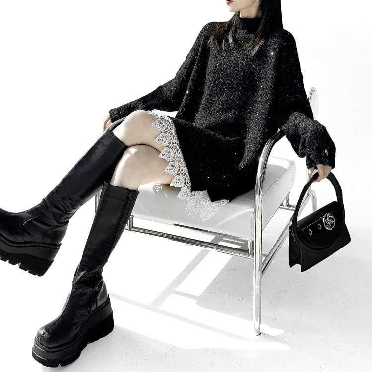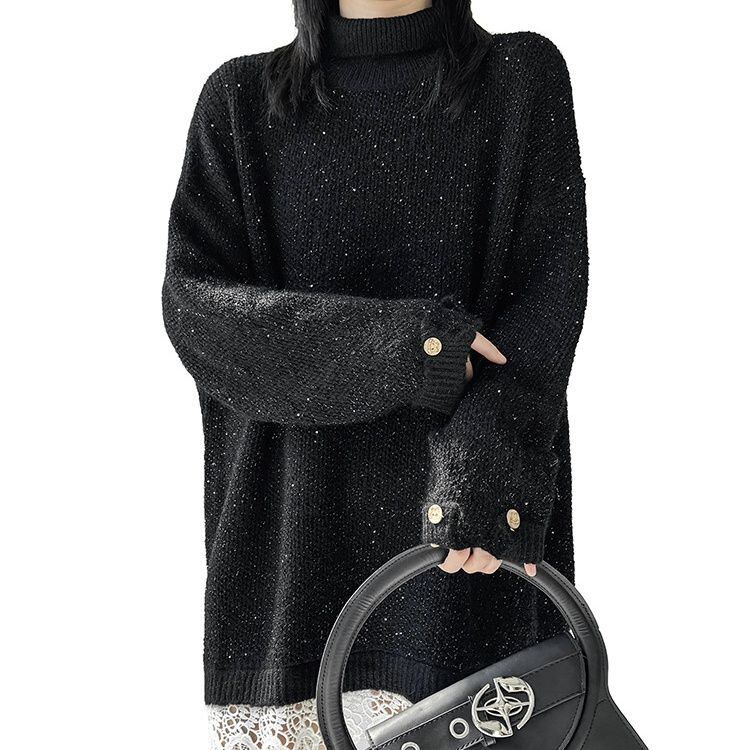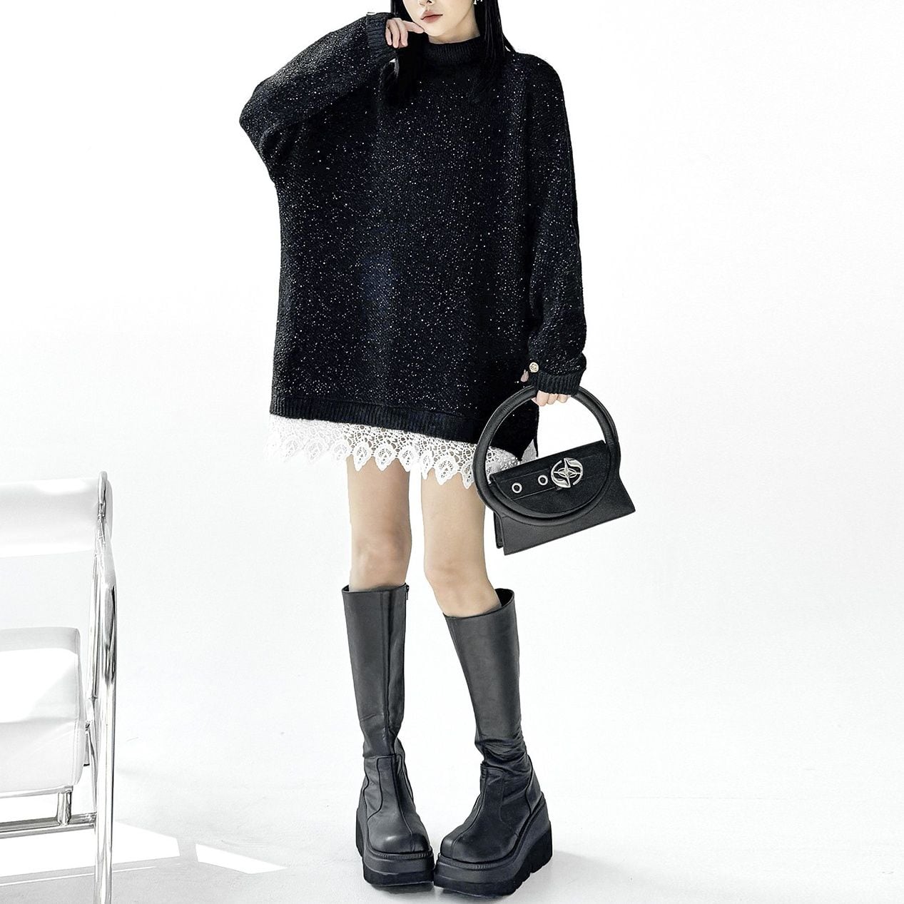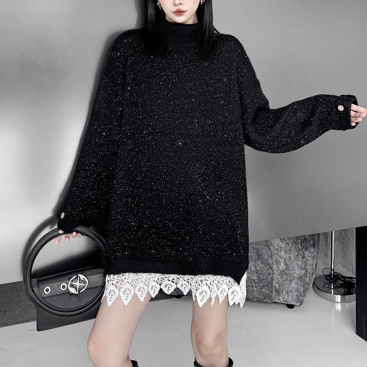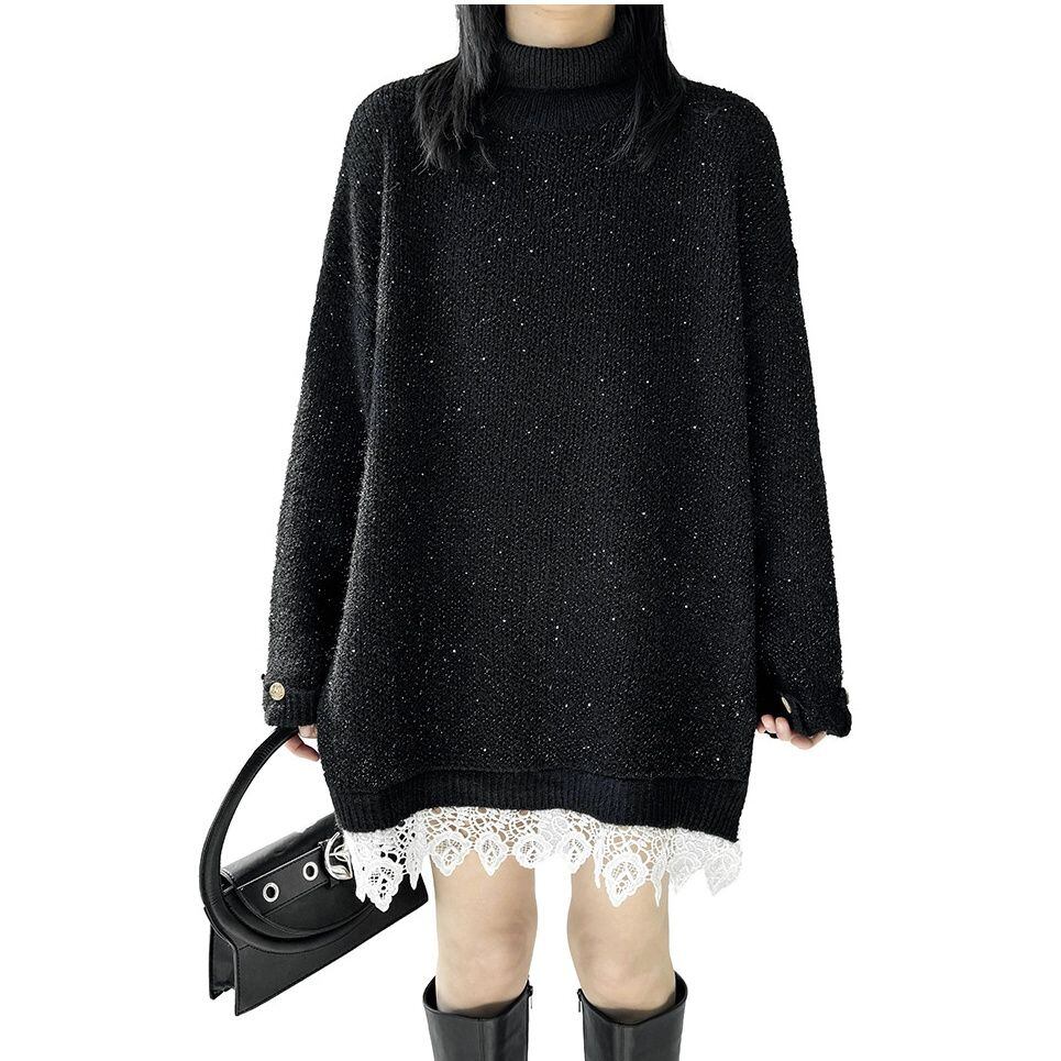 BLACK SEQUINS LACED HEM TURTLE NECK PULLOVER KNIT 1color M-16277