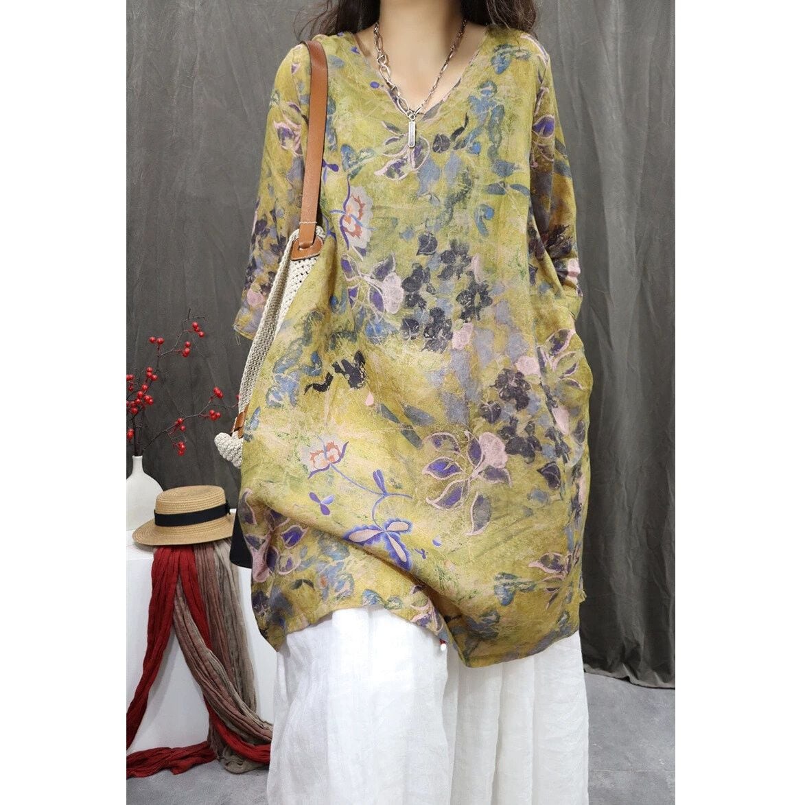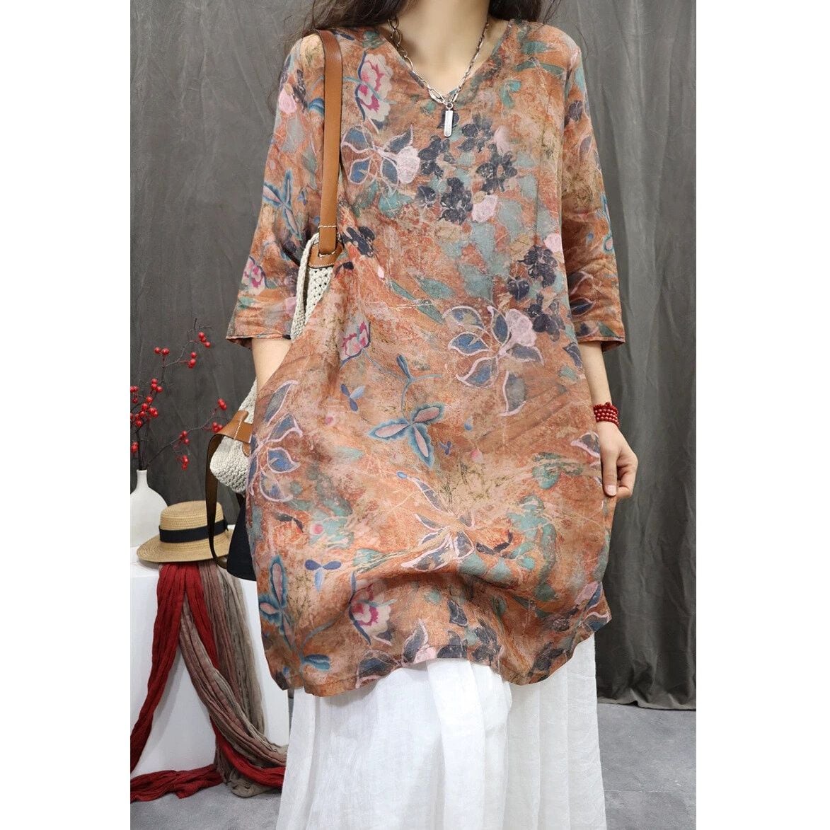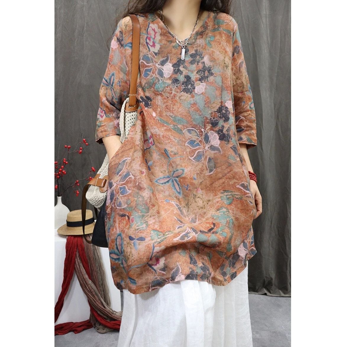 レトロな花柄がおしゃれな、Vネック・7分袖・チュニック丈のプルオーバーシャツです。ゆったりとしたシルエットがボディラインをカバーする、コーディネートの主役になる目を惹くアイテムです。色は3色から選べます。 SIZE:※測り方によって2-3cmの差が生じる場合がございます。 【M】バスト108cm 肩幅39cm 袖丈40.5cm 着丈88cm 【L】バスト112cm 肩幅40cm 袖丈41cm 着丈89cm 【XL】バスト116cm 肩幅41cm 袖丈41.5cm 着丈90cm 【2XL】バスト120cm 肩幅42cm 袖丈42cm 着丈91cm COLOR:Pink、Yellow、Brown 素材:ポリエステル、その他 モデル着用サイズ:L モデル情報:身長161cm 体重49kg STYLE CALENDAR:春◎ 夏◎ 秋〇 冬△ お届けについて こちらの商品は海外店舗より直接発送となる為、 ご決済から到着までは、多くの場合【10日-2週間前後】でお届けしております。 ※在庫状況や輸送の混雑により、4週間前後かかる場合がございます。 注意事項 ・商品在庫切れにより注文キャンセルとさせていただく恐れもございますので、予めご了承くださいませ。 ・仕入れ工場を変えることがあるため、記載サイズと若干異なる場合がございます。 ・商品の色味は、お手持ちのスマートフォンの画面によって実物と若干異なる場合がございます。 ・イメージ違いやサイズ交換等、お客さまご都合による交換・返品はご遠慮ください。 送料について 全国一律580円(沖縄県は1,500円) ※10,000円以上のご注文で沖縄県を含む全国送料無料。 お支払い方法について ・クレジットカード決済(VISA/Mastercard/JCB/アメリカン・エクスプレス/ Diners Club) ・Amazon Pay ・PayPay ・コンビニ決済/Pay-easy ※前払いのお支払い方法 ・Pay ID あと払い(コンビニ払い、口座振替) ※あと払いのお支払い方法 ・キャリア決済(d払い/au PAY(auかんたん決済)/ソフトバンク・ワイモバイルまとめて支払い) 管理番号:M-16283