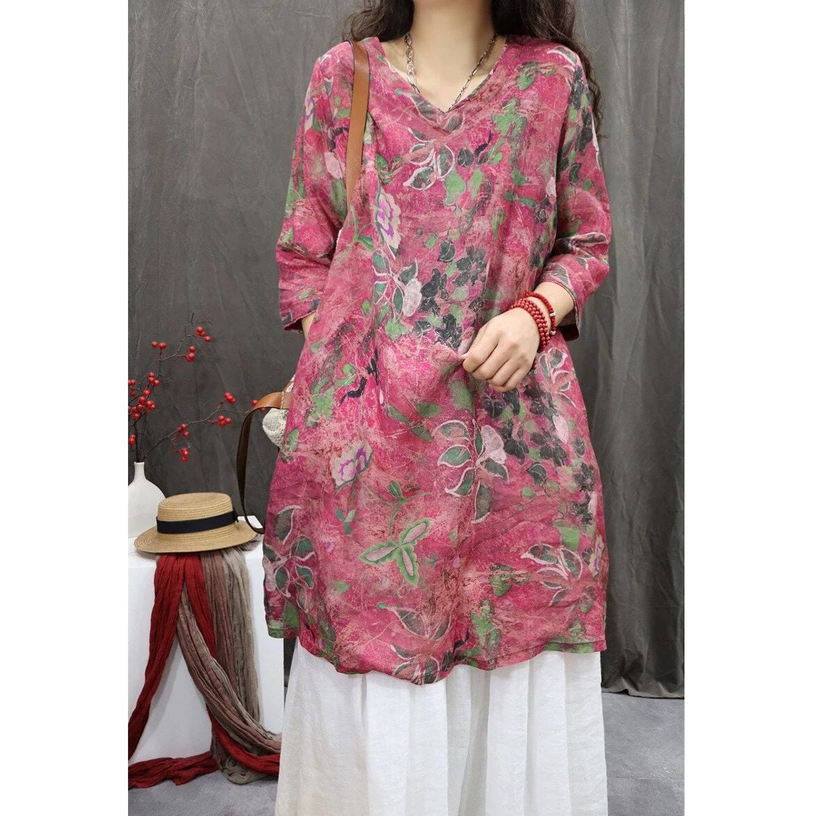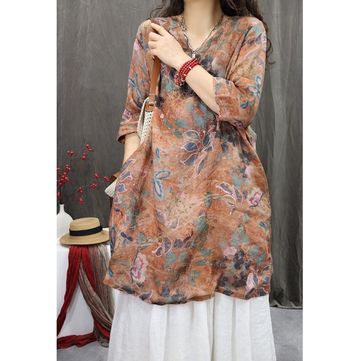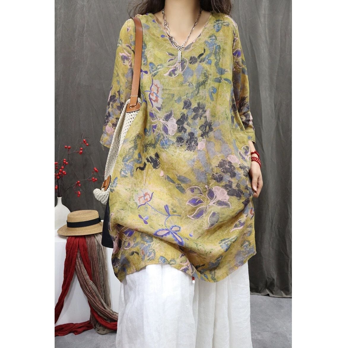 レトロな花柄がおしゃれな、Vネック・7分袖・チュニック丈のプルオーバーシャツです。ゆったりとしたシルエットがボディラインをカバーする、コーディネートの主役になる目を惹くアイテムです。色は3色から選べます。 SIZE:※測り方によって2-3cmの差が生じる場合がございます。 【M】バスト108cm 肩幅39cm 袖丈40.5cm 着丈88cm 【L】バスト112cm 肩幅40cm 袖丈41cm 着丈89cm 【XL】バスト116cm 肩幅41cm 袖丈41.5cm 着丈90cm 【2XL】バスト120cm 肩幅42cm 袖丈42cm 着丈91cm COLOR:Pink、Yellow、Brown 素材:ポリエステル、その他 モデル着用サイズ:L モデル情報:身長161cm 体重49kg STYLE CALENDAR:春◎ 夏◎ 秋〇 冬△ お届けについて こちらの商品は海外店舗より直接発送となる為、 ご決済から到着までは、多くの場合【10日-2週間前後】でお届けしております。 ※在庫状況や輸送の混雑により、4週間前後かかる場合がございます。 注意事項 ・商品在庫切れにより注文キャンセルとさせていただく恐れもございますので、予めご了承くださいませ。 ・仕入れ工場を変えることがあるため、記載サイズと若干異なる場合がございます。 ・商品の色味は、お手持ちのスマートフォンの画面によって実物と若干異なる場合がございます。 ・イメージ違いやサイズ交換等、お客さまご都合による交換・返品はご遠慮ください。 送料について 全国一律580円(沖縄県は1,500円) ※10,000円以上のご注文で沖縄県を含む全国送料無料。 お支払い方法について ・クレジットカード決済(VISA/Mastercard/JCB/アメリカン・エクスプレス/ Diners Club) ・Amazon Pay ・PayPay ・コンビニ決済/Pay-easy ※前払いのお支払い方法 ・Pay ID あと払い(コンビニ払い、口座振替) ※あと払いのお支払い方法 ・キャリア決済(d払い/au PAY(auかんたん決済)/ソフトバンク・ワイモバイルまとめて支払い) 管理番号:M-16283
