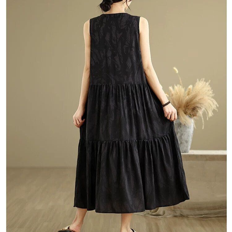 BLACK ROUND NECK SLEEVELESS A-LINE LONG DRESS 1color M-16302
