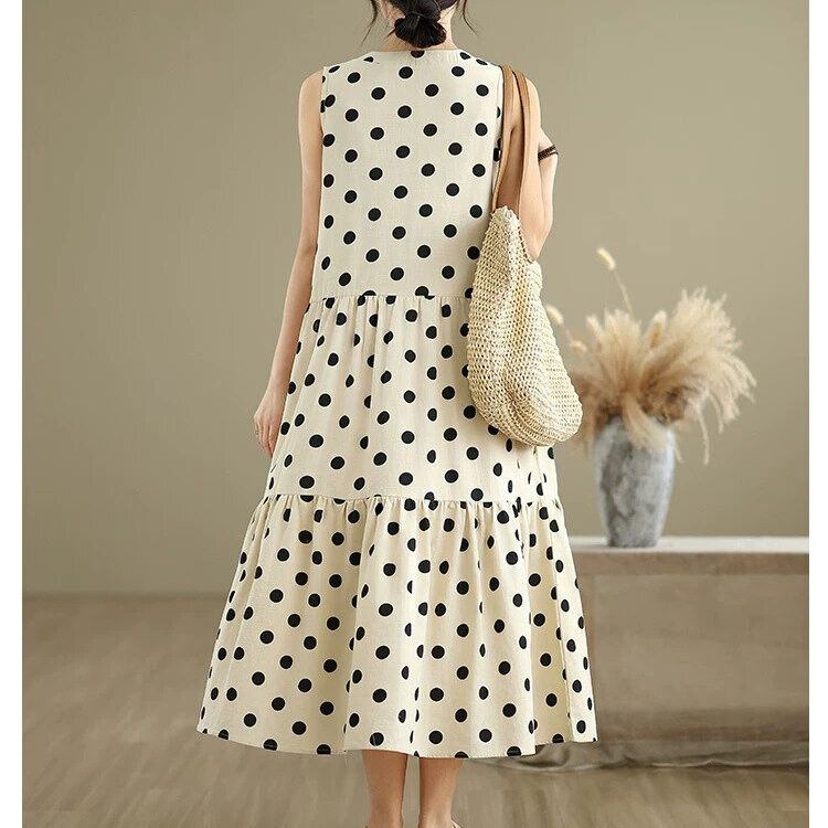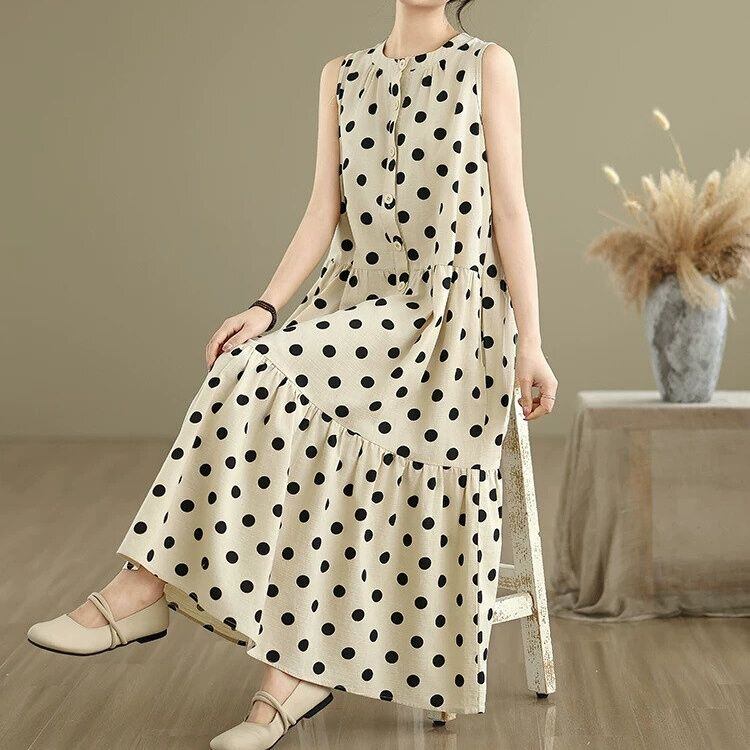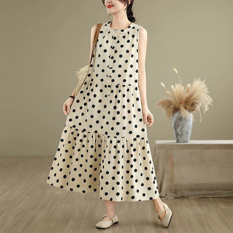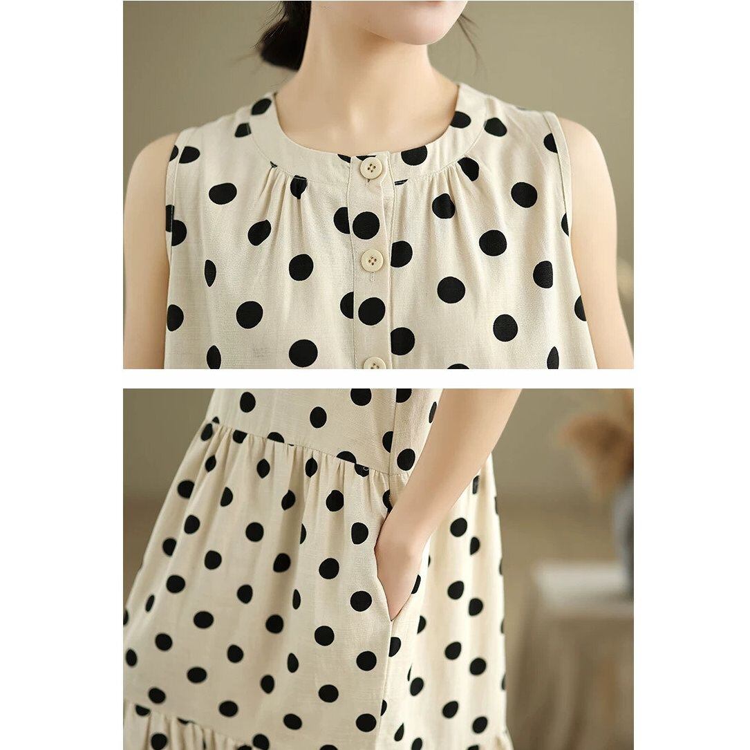 DOT ROUND NECK SLEEVELESS A-LINE LONG SHIRT DRESS 1color M-16304