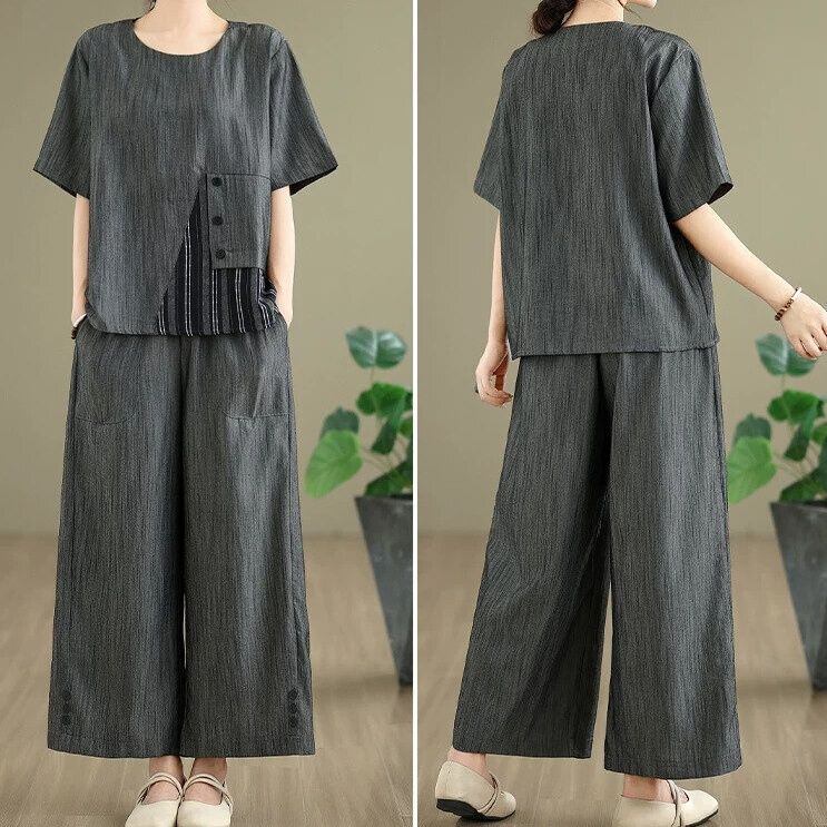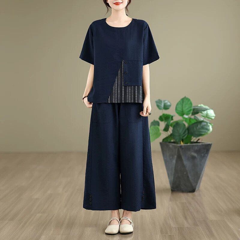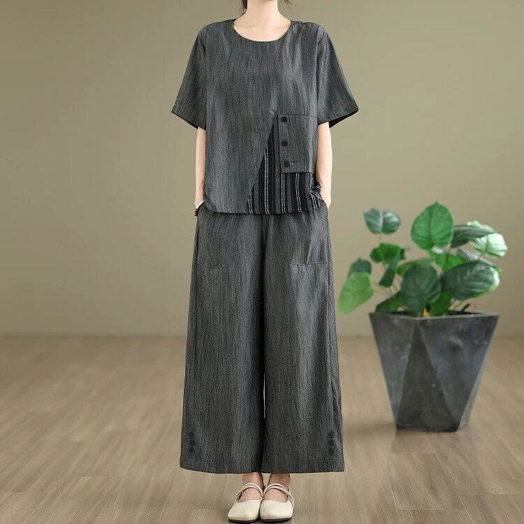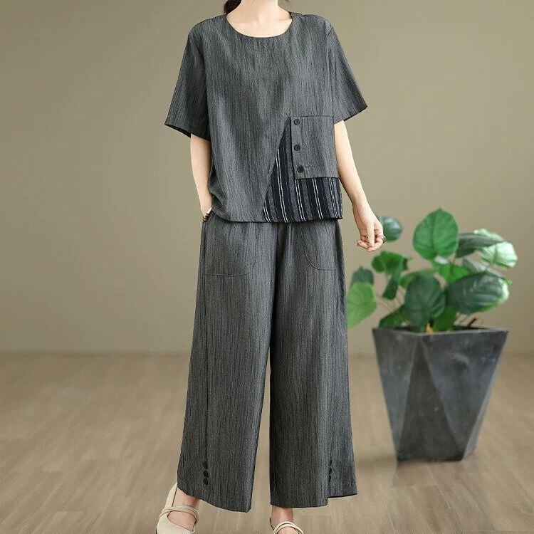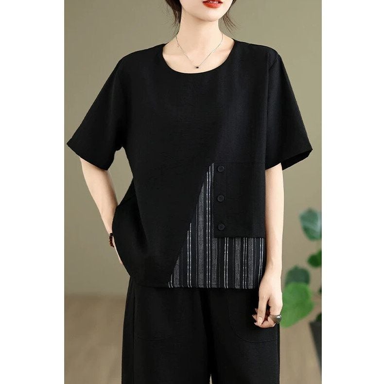 ※こちらの商品はトップスとボトムスのツーピース(セットアップ)商品になります。 レトロなストライプ素材のスティッチやボタン飾りがアクセントになったラウンドネックのデザインTシャツと、ワイドレッグ・クロップドパンツのセットアップです。パンツはウエストがゴムのAラインシルエットで、履き心地がいいです。色は3色から選べます。 SIZE:※測り方によって2-3cmの差が生じる場合がございます。 【M】バスト108cm 肩幅41cm 袖丈24cm 着丈60cm ヒップ108cm ウエスト102cm 裾幅43cm パンツ丈87cm 【L】バスト112cm 肩幅42cm 袖丈24cm 着丈61cm ヒップ112cm ウエスト106cm 裾幅44cm パンツ丈87cm 【XL】バスト116cm 肩幅43cm 袖丈24cm 着丈62cm ヒップ116cm ウエスト110cm 裾幅45cm パンツ丈87cm 【2XL】バスト120cm 肩幅44cm 袖丈24cm 着丈63cm ヒップ120cm ウエスト114cm 裾幅46cm パンツ丈87cm COLOR:Gray、Navy、Black 素材:ポリエステル、その他 モデル着用サイズ:L モデル情報:身長161cm 体重49kg STYLE CALENDAR:春〇 夏◎ 秋〇 冬△ お届けについて こちらの商品は海外店舗より直接発送となる為、 ご決済から到着までは、多くの場合【10日-2週間前後】でお届けしております。 ※在庫状況や輸送の混雑により、4週間前後かかる場合がございます。 注意事項 ・商品在庫切れにより注文キャンセルとさせていただく恐れもございますので、予めご了承くださいませ。 ・仕入れ工場を変えることがあるため、記載サイズと若干異なる場合がございます。 ・商品の色味は、お手持ちのスマートフォンの画面によって実物と若干異なる場合がございます。 ・イメージ違いやサイズ交換等、お客さまご都合による交換・返品はご遠慮ください。 送料について 全国一律580円(沖縄県は1,500円) ※10,000円以上のご注文で沖縄県を含む全国送料無料。 お支払い方法について ・クレジットカード決済(VISA/Mastercard/JCB/アメリカン・エクスプレス/ Diners Club) ・Amazon Pay ・PayPay ・コンビニ決済/Pay-easy ※前払いのお支払い方法 ・Pay ID あと払い(コンビニ払い、口座振替) ※あと払いのお支払い方法 ・キャリア決済(d払い/au PAY(auかんたん決済)/ソフトバンク・ワイモバイルまとめて支払い) 管理番号:M-16306