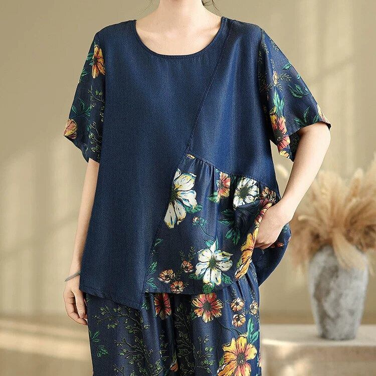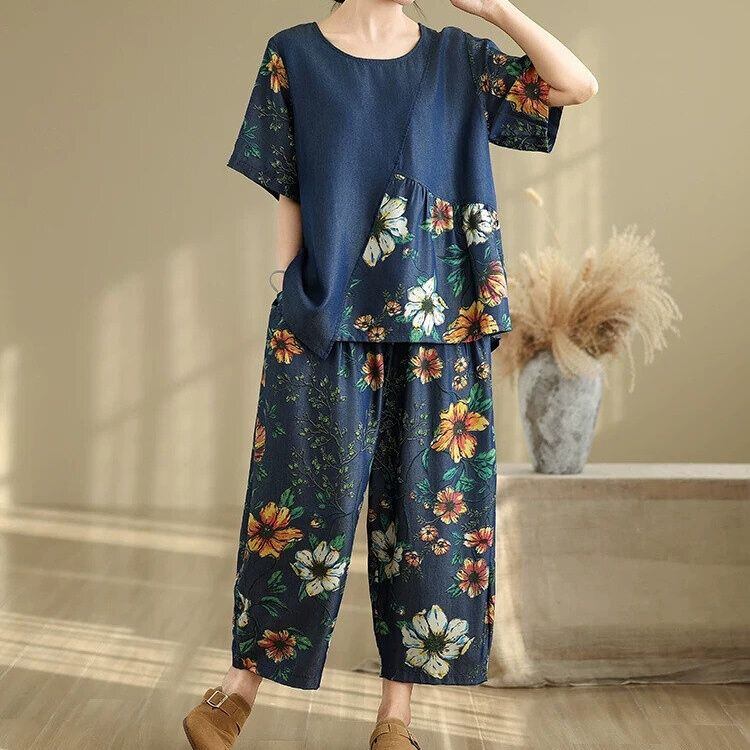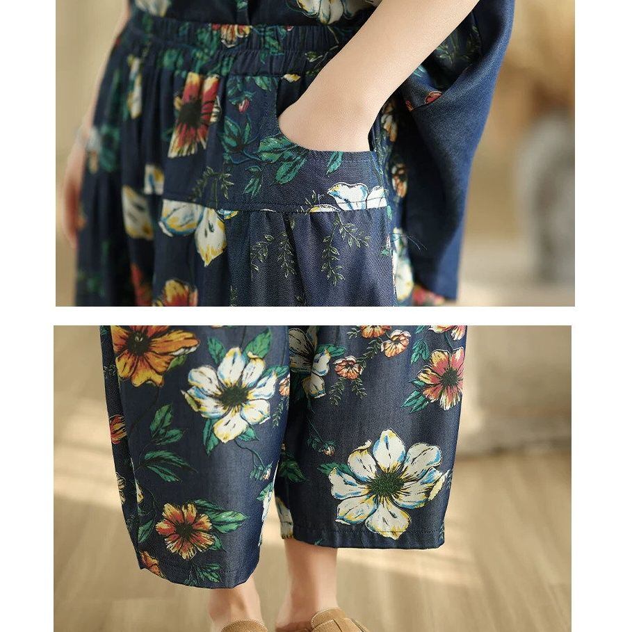 FLOWER PRINT PATCH DESIGN T-SHIRT & WIDE LEG CROPPED PANTS SET 2pieces 1color M-16308