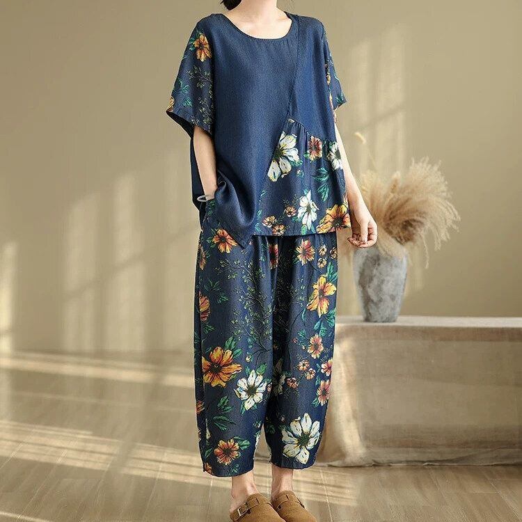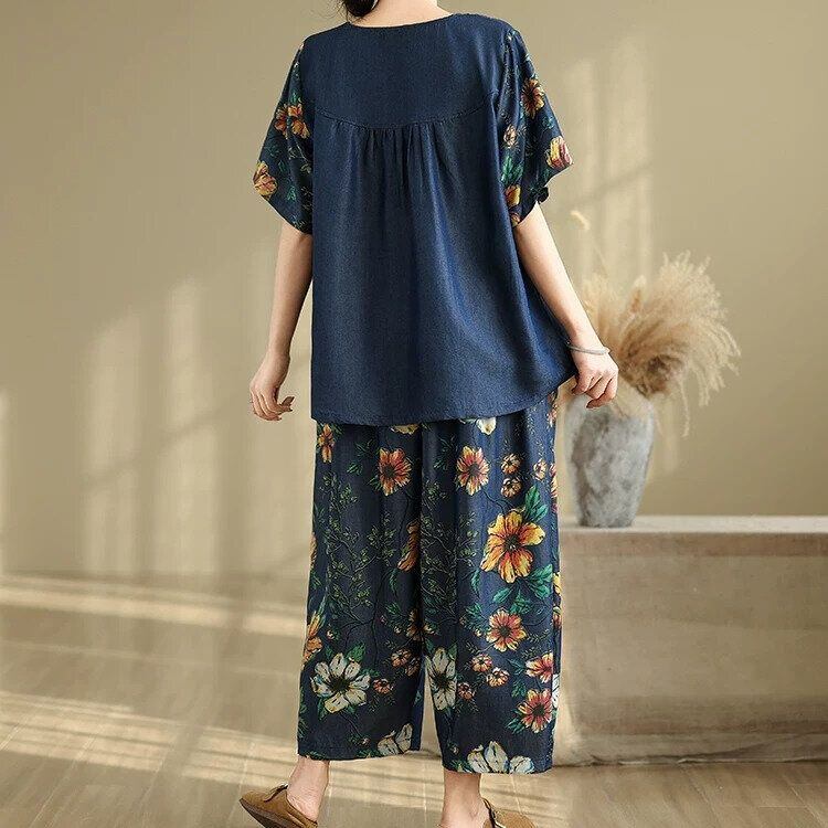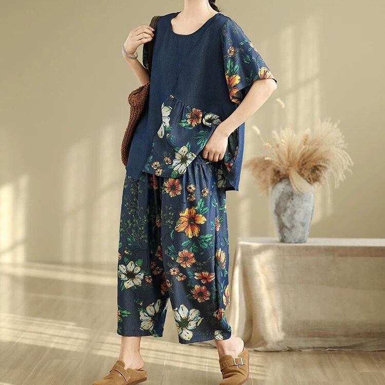 ネイビー地に鮮やかな花柄スティッチが目を惹くボートネックのデザインTシャツと、ワイドレッグ・クロップドパンツのセットアップです。上下ともにゆったりとしたシルエットが魅力的な、リラックスした印象のカジュアルアイテムです。