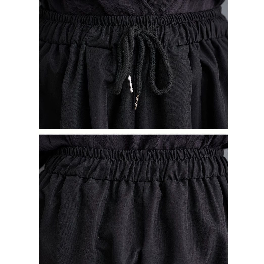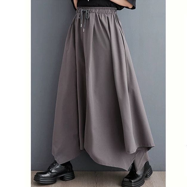 単色の滑らかな素材でできた、Aラインのワイドレッグ・クロップドパンツです。ウエストはゴムプラスドローストリングで、履き心地がいいです。スカートのようなシルエットにイレギュラーな裾のラインが魅力的な、コーディネートしやすいアイテムです。色はブラックとグレーの2色から選べます。