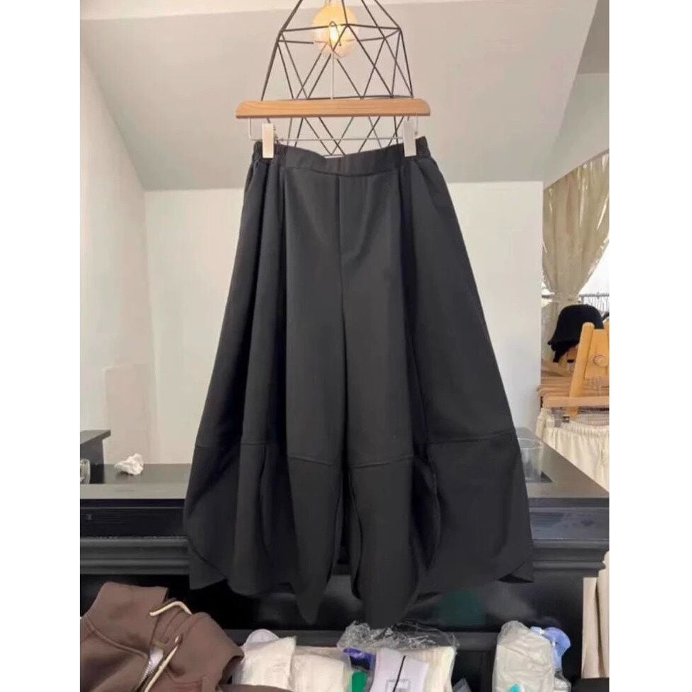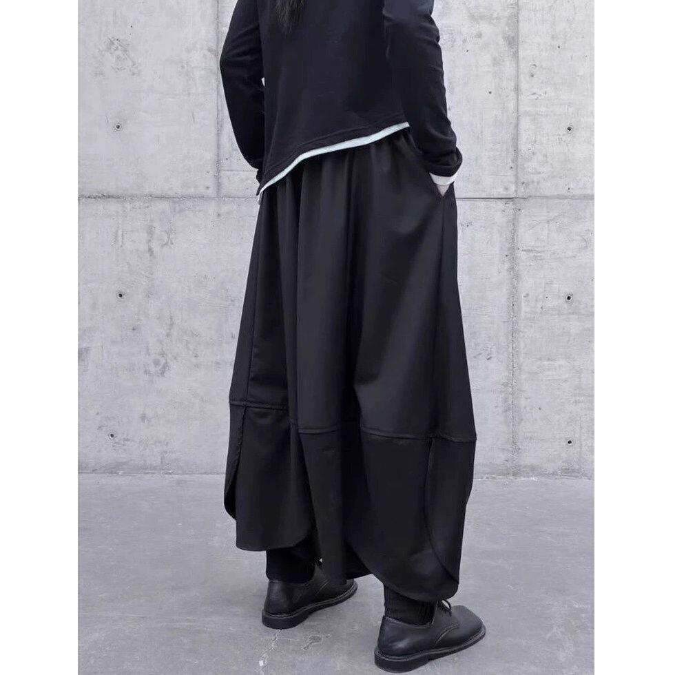 ブラックの単色素材でできた、ワイドレッグ・クロップドパンツです。ウエストは後ろ半分がゴムなので、見た目はスッキリなのに履き心地が良いです。ランタンのようないびつなシルエットが目を惹く、モードな印象のアイテムです。