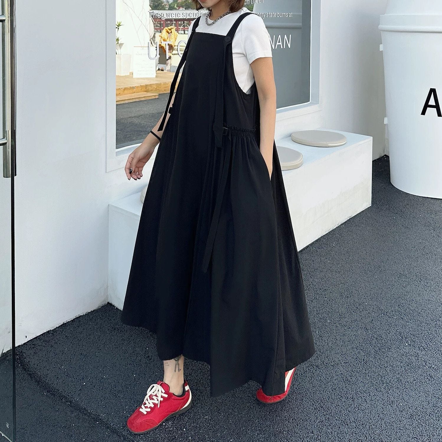 SOLID A-LINE LONG STRAP JUMPER DRESS 2colors M-16340