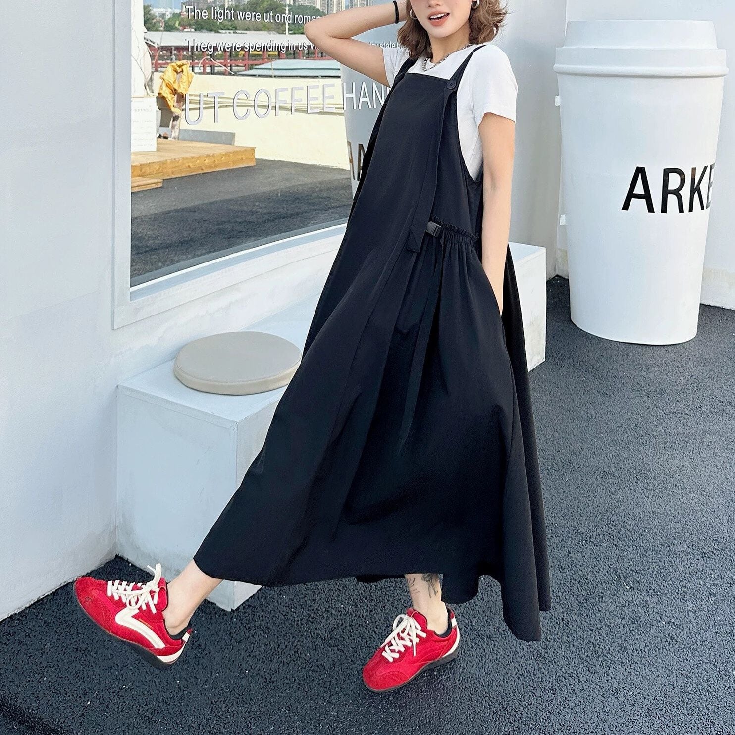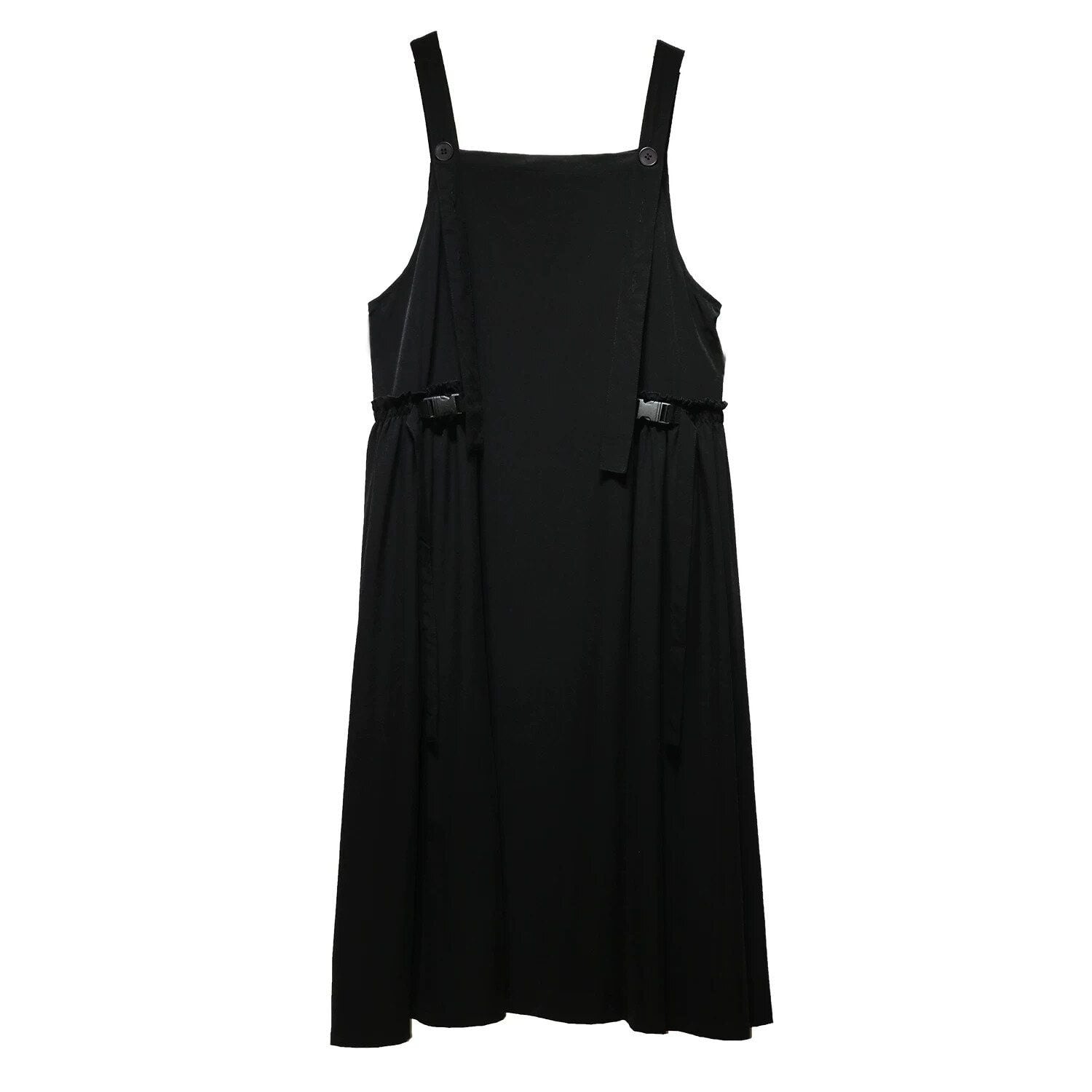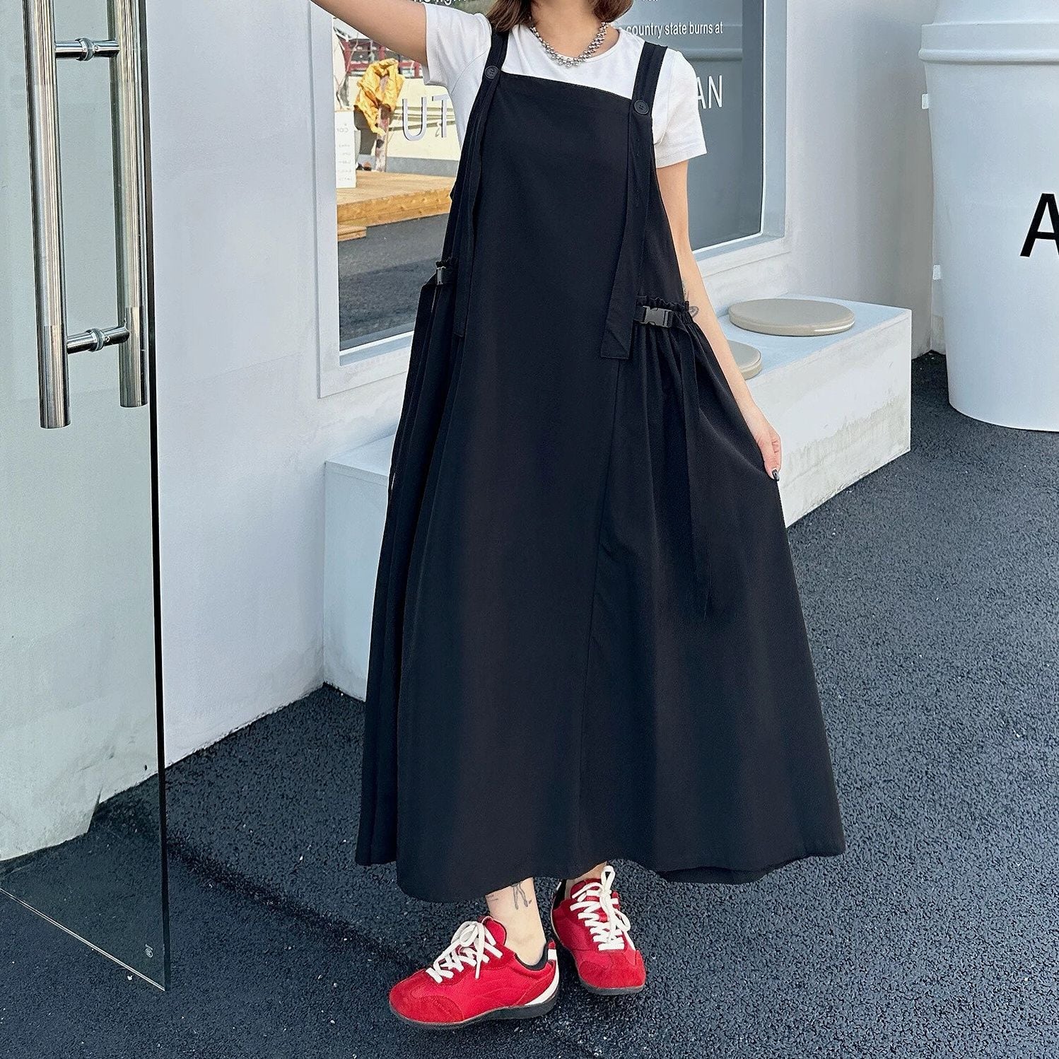 大きく広がるAラインのシルエットが魅力的な、単色・ロング丈のジャンパースカートです。ショルダーストラップはボタンで長さを調節できます。バックルのついたサイドのデザインがおしゃれな、コーディネートしやすいカジュアルアイテムです。ブラックとアーミーグリーンの2色から選べます。