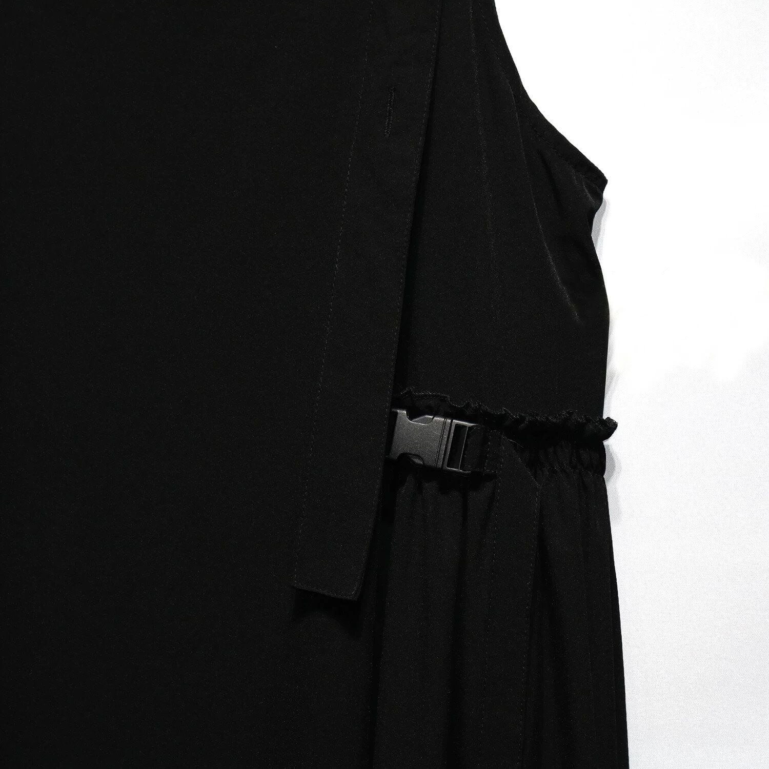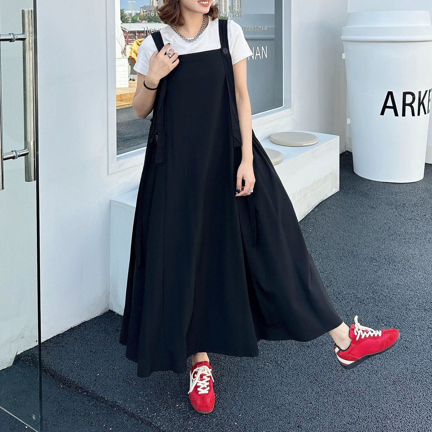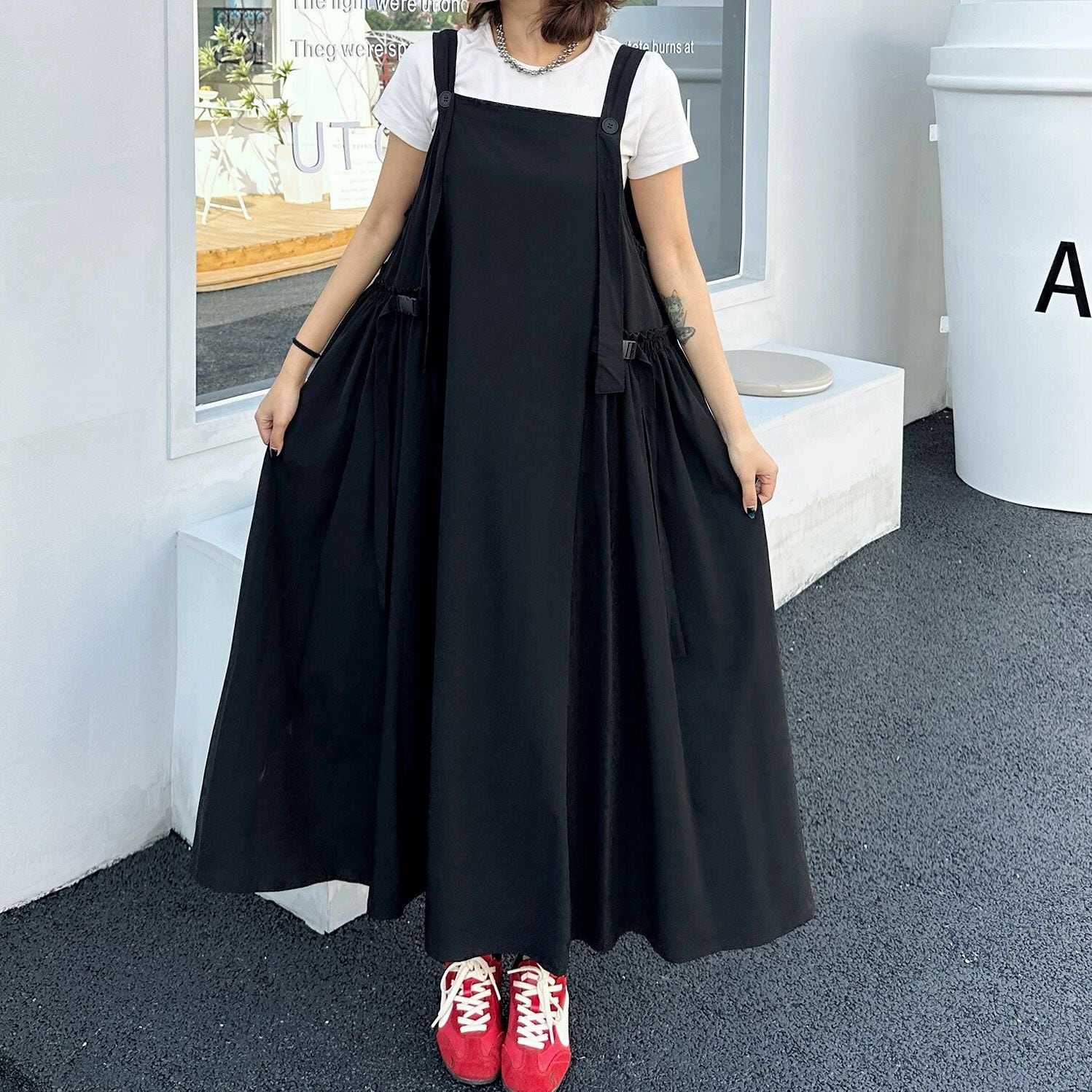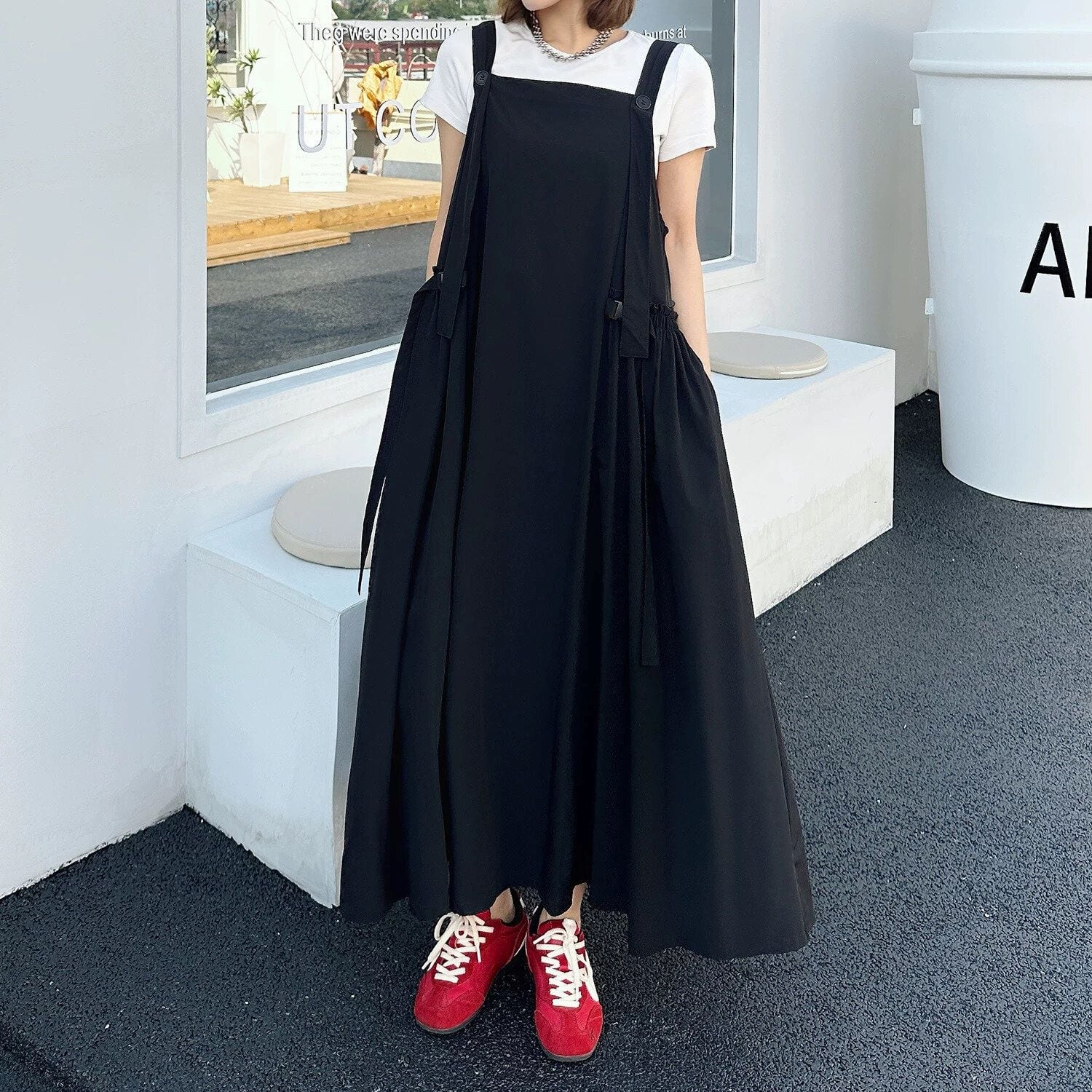 大きく広がるAラインのシルエットが魅力的な、単色・ロング丈のジャンパースカートです。ショルダーストラップはボタンで長さを調節できます。バックルのついたサイドのデザインがおしゃれな、コーディネートしやすいカジュアルアイテムです。ブラックとアーミーグリーンの2色から選べます。