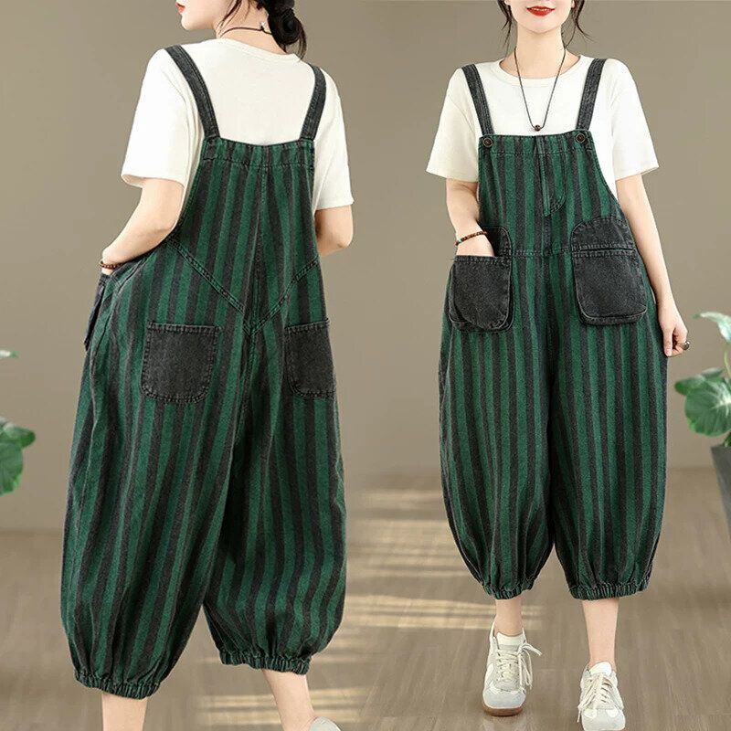 GREEN STRIPE DENIM WIDE LEG CROPPED OVERALL 1color M-16346