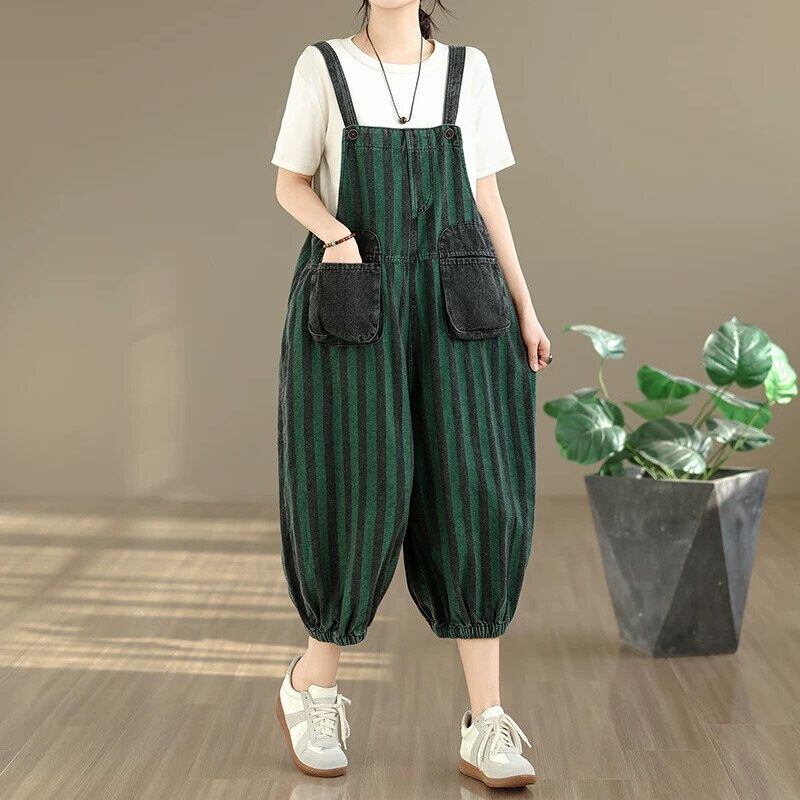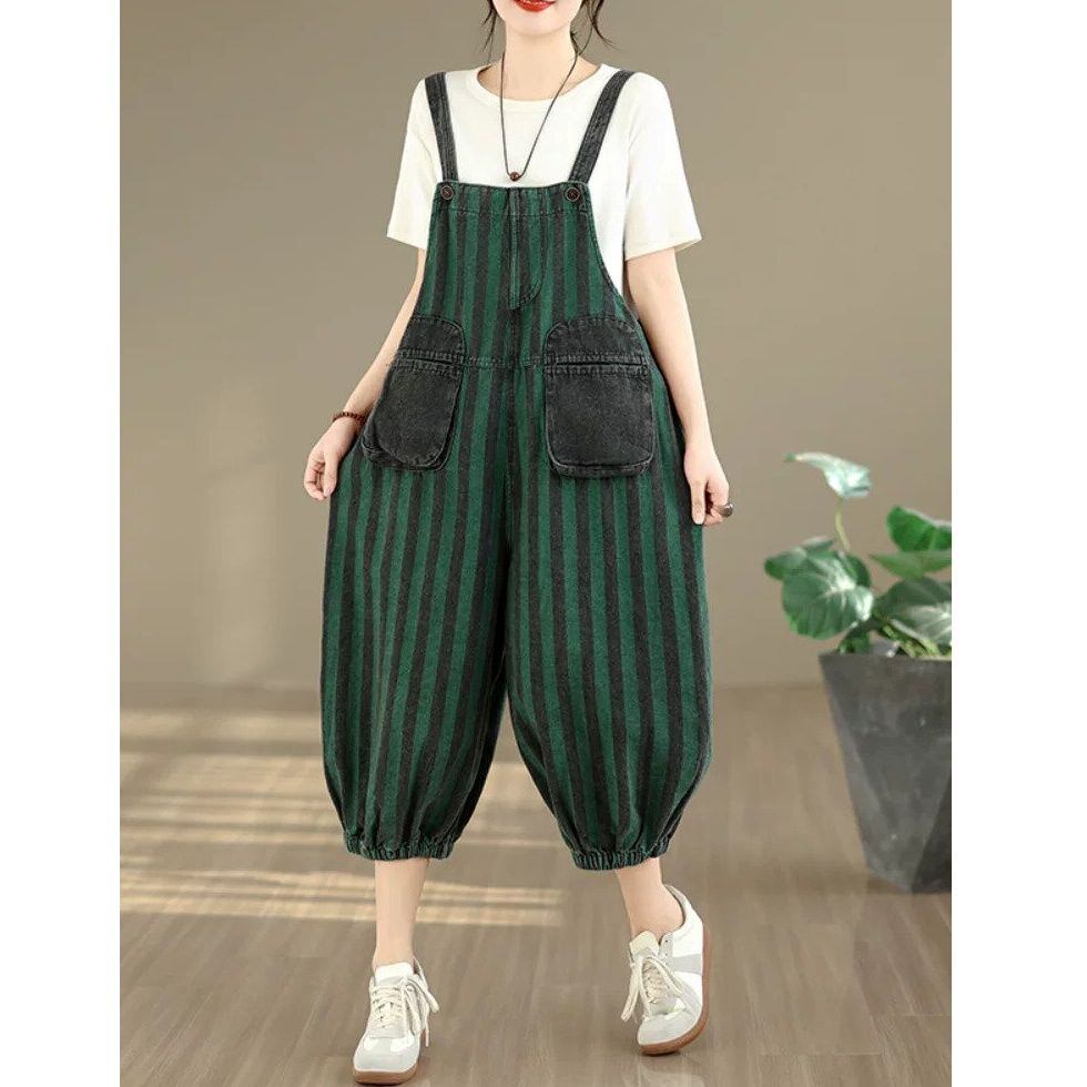 ブラックとグリーンのストライプのデニム素材が目を惹く、ワイドレッグ・クロップド・オーバーオールです。7分丈の裾はゴムが入って、丸みのあるシルエットがキュートです。デザインポケットがおしゃれな、コーディネートの主役になる目を惹くカジュアルアイテムです。