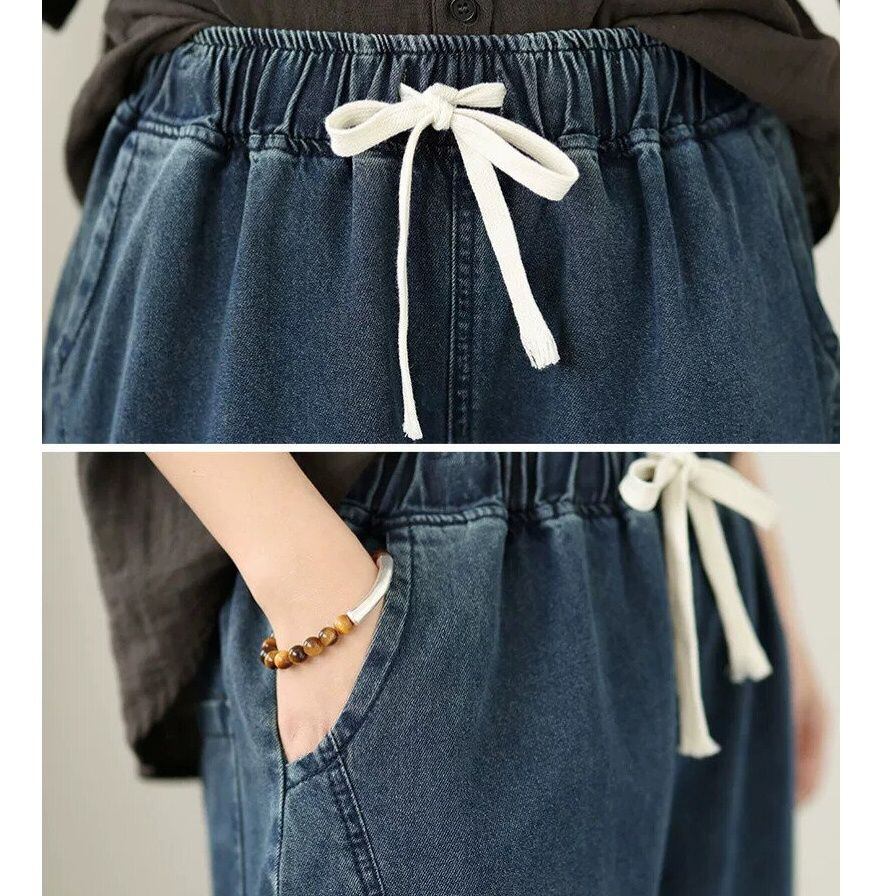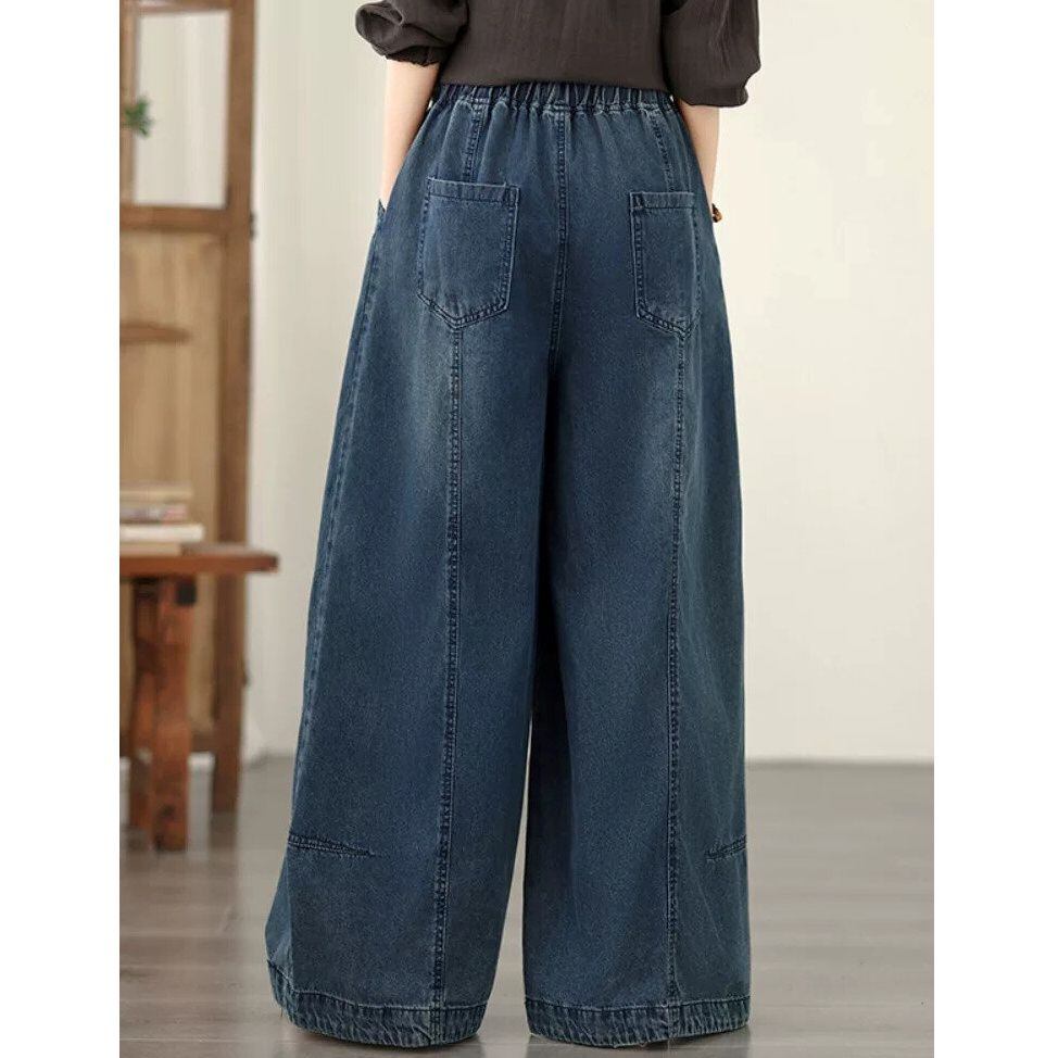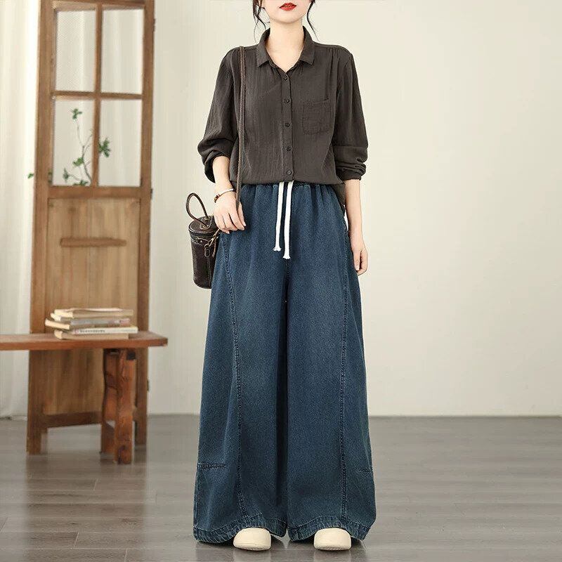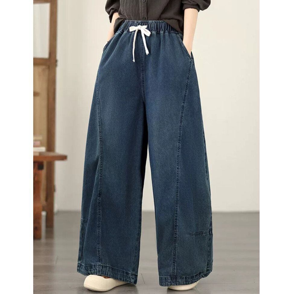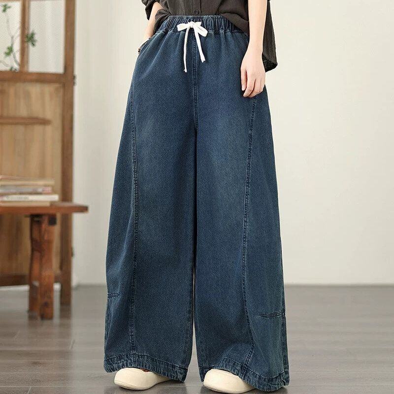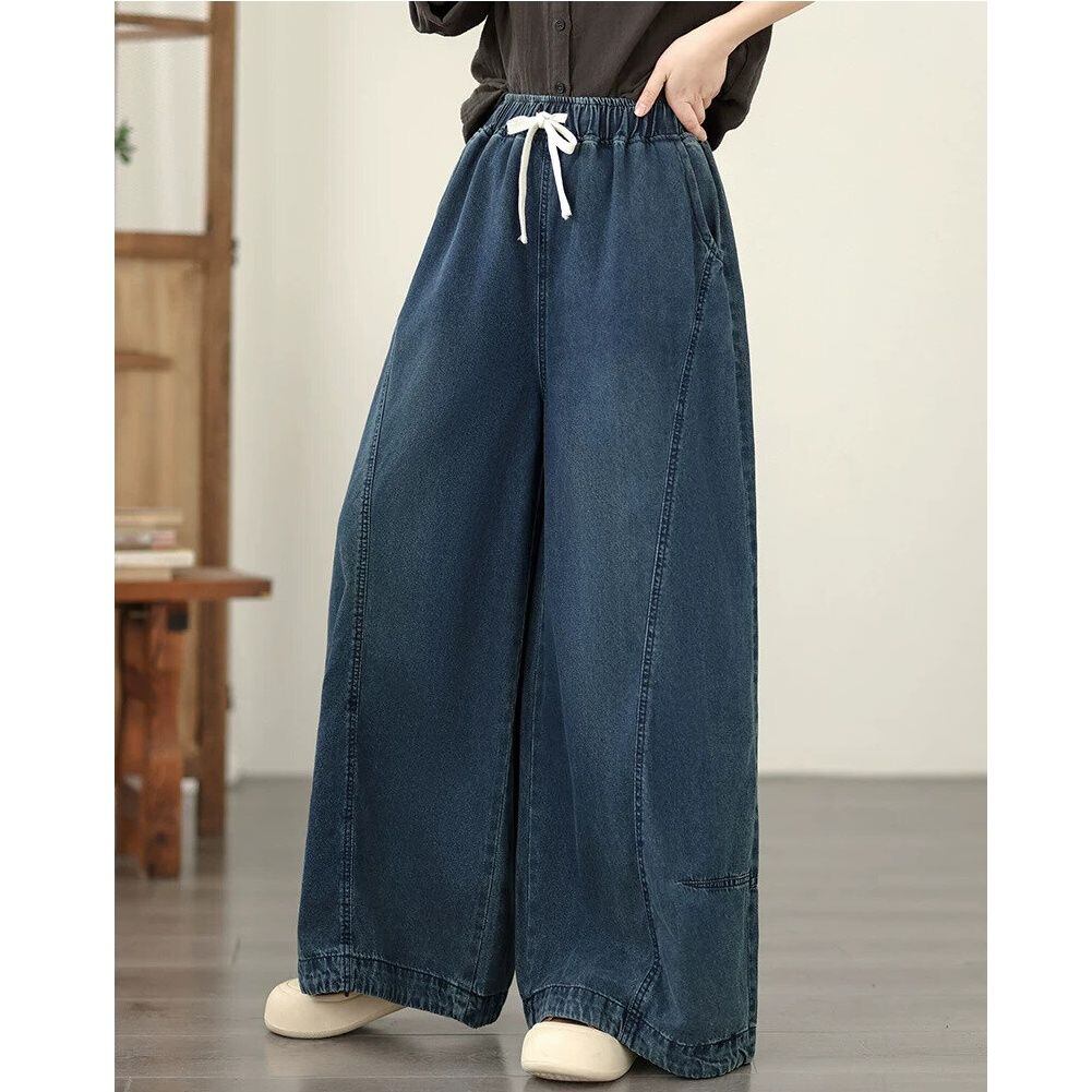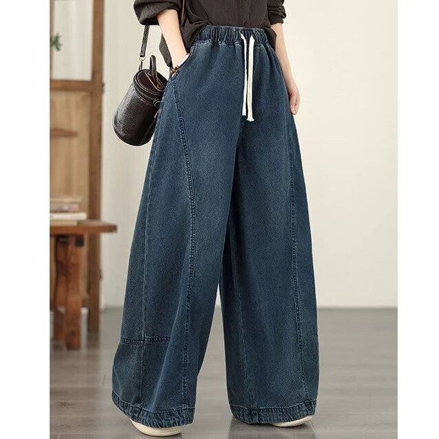 DRAWSTRING WAIST A-LINE WIDE LEG DENIM PANTS 1color M-16347