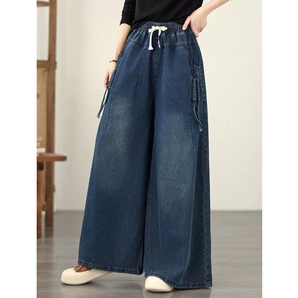 DRAWSTRING WAIST A-LINE WIDE LEG DENIM PANTS 1color M-16348