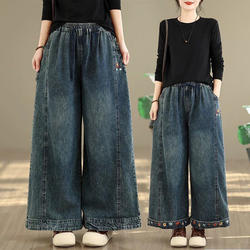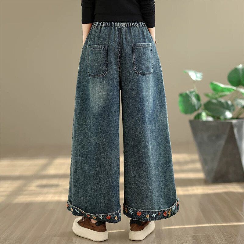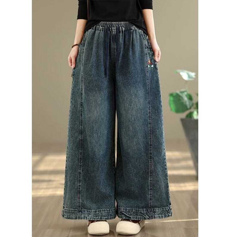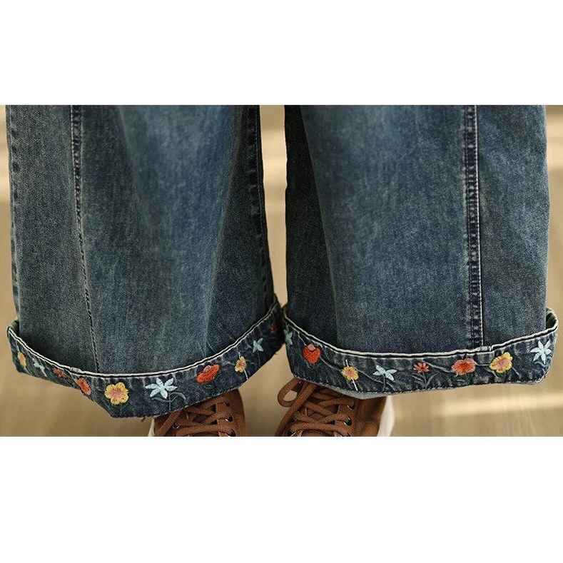 FLOWER EMBROIDERED A-LINE WIDE LEG DENIM PANTS 1color M-16358
