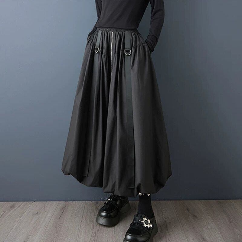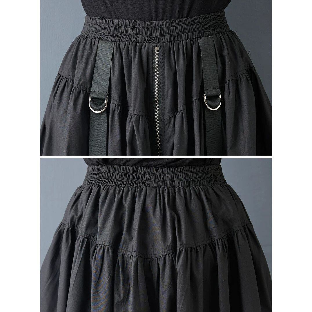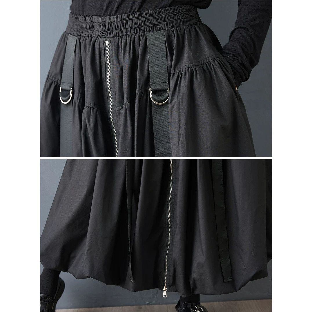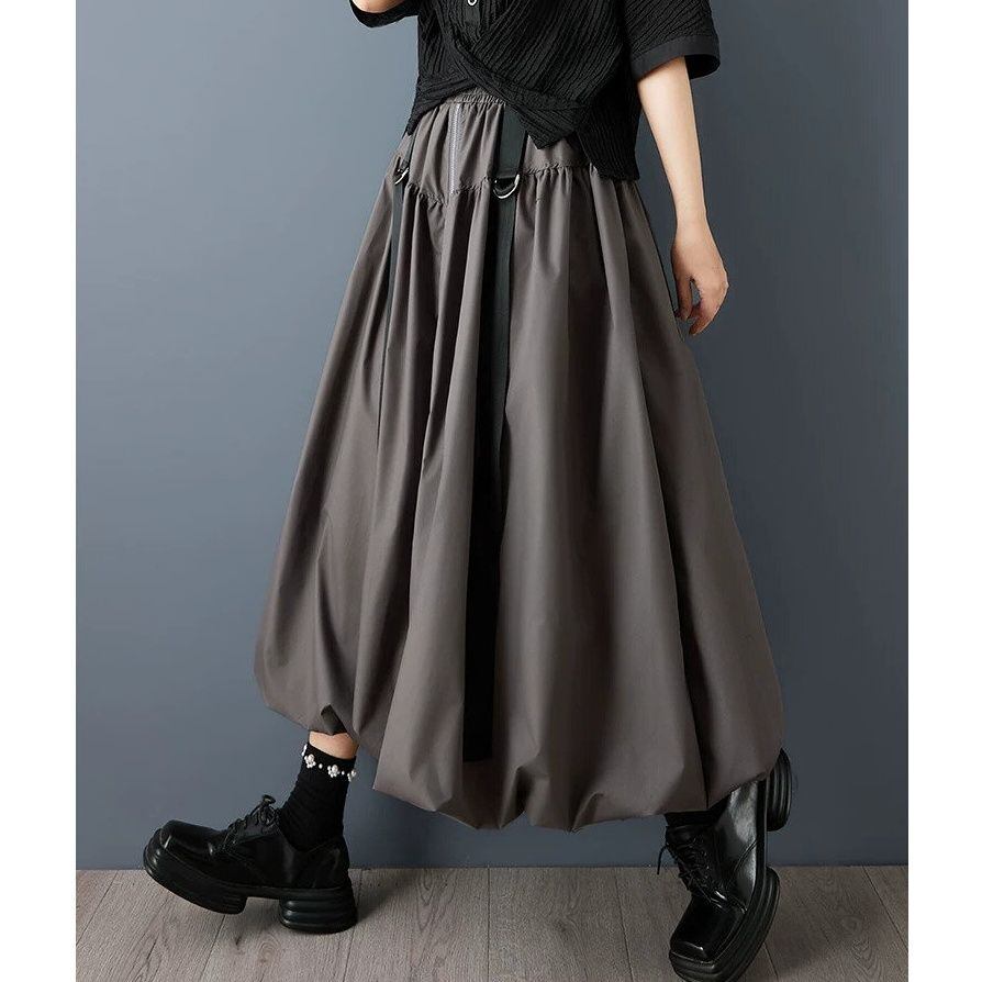 フロントセンターのフルジップやDリング付きのストラップ飾りがクールな、Aライン・ロング丈のカジュアルスカートです。ウエストはゴムなので、着脱が簡単で履き心地が良いです。バルーン上になった裾のシルエットが魅力的な、合わせやすいアイテムです。色は3色から選べます。