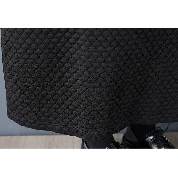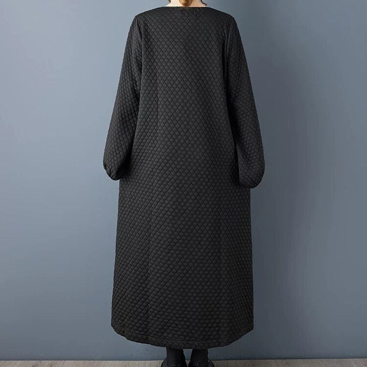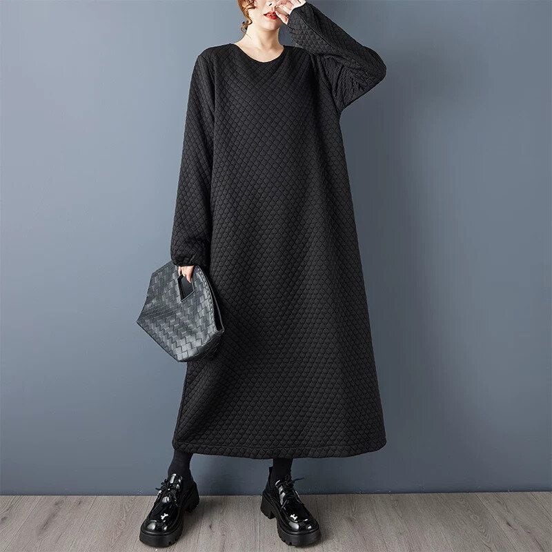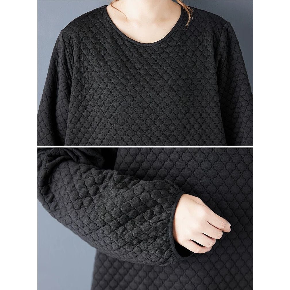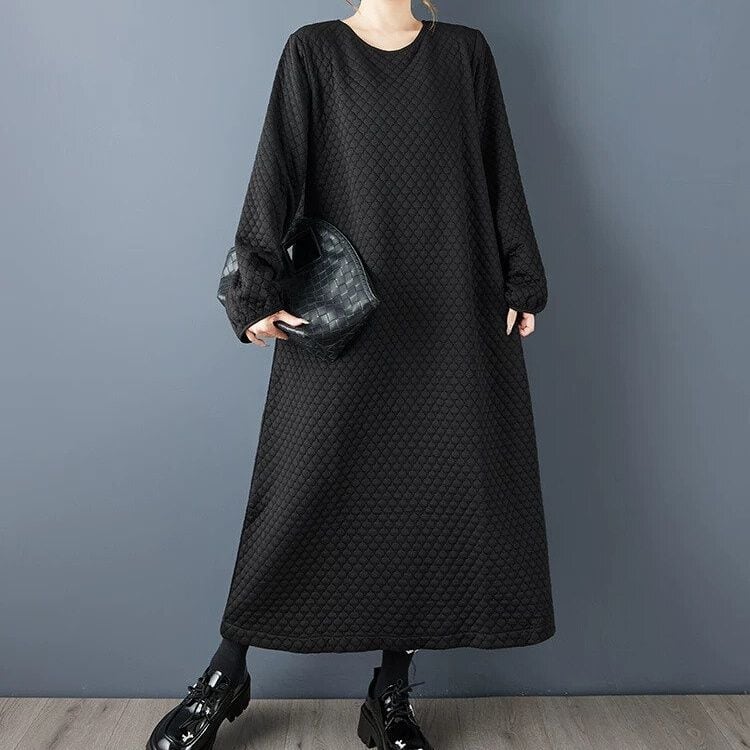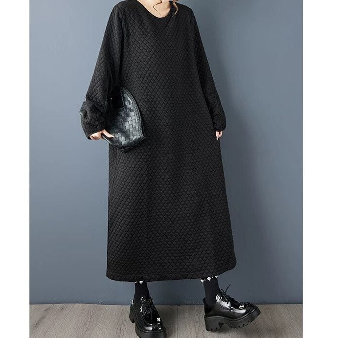 BLACK QUILTING ROUND NECK LONG PULLOVER DRESS 1color M-16366