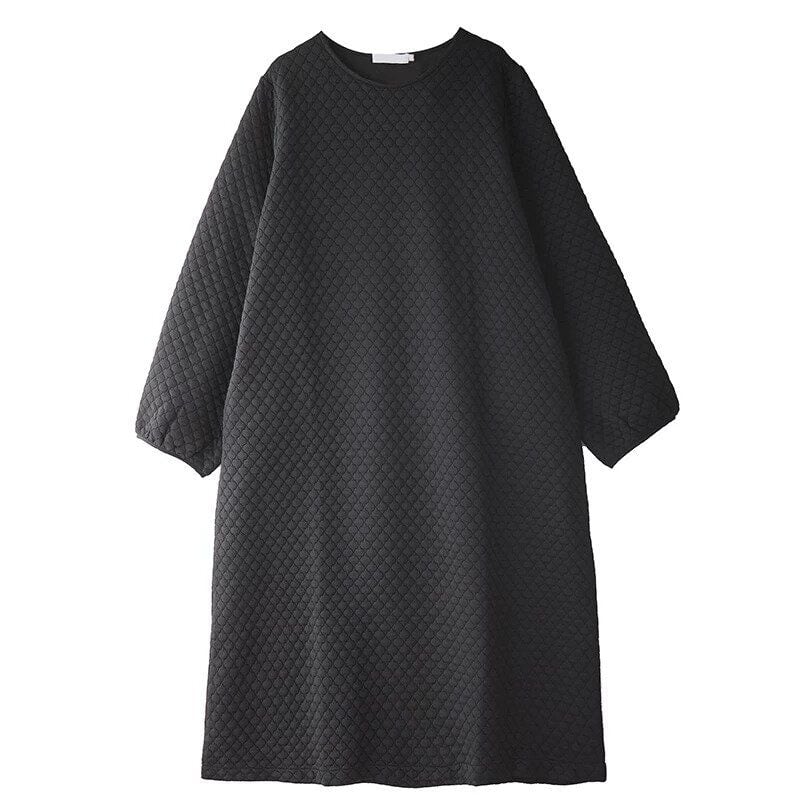 ブラックのキルティング素材でできた、ラウンドネック・長袖・ロング丈のプルオーバーワンピースです。ゆったりとしたAラインのシルエットが、リラックスした雰囲気のカジュアルアイテムです。