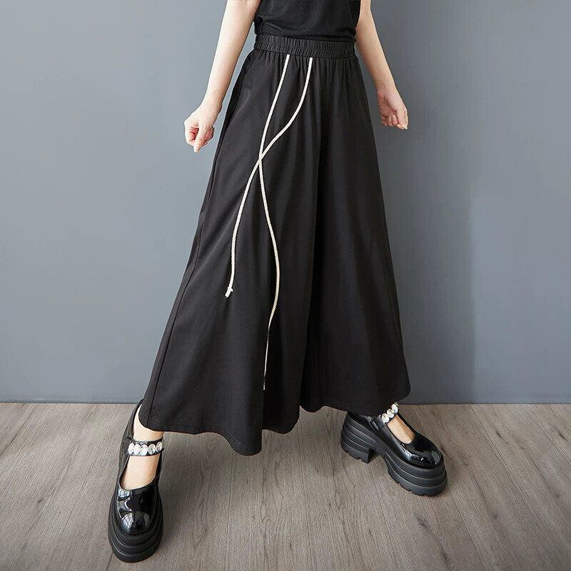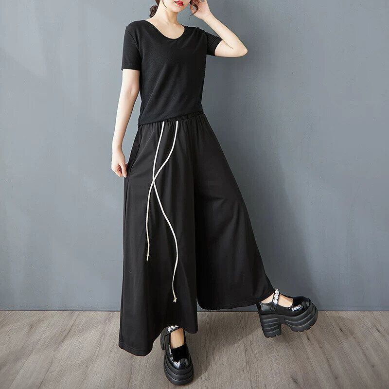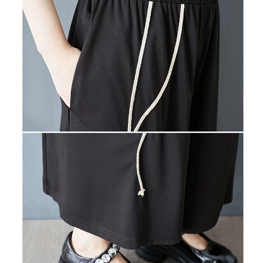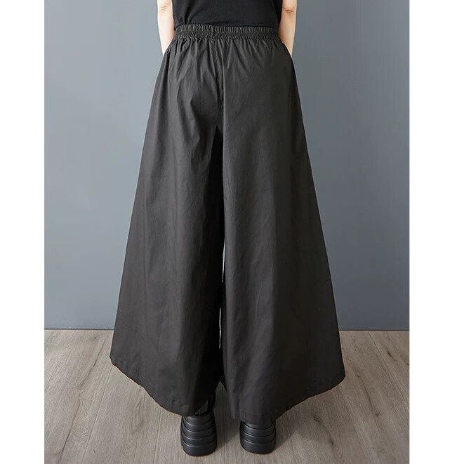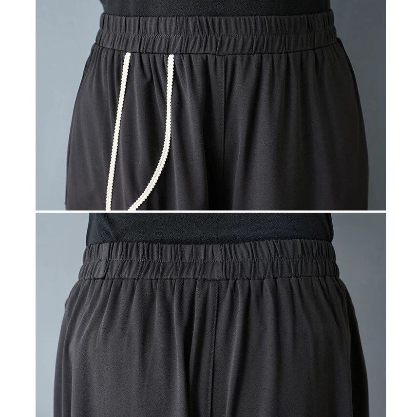 BLACK ELASTIC WAIST A-LINE WIDE LEG CROPPED DESIGN PANTS 1color M-16368