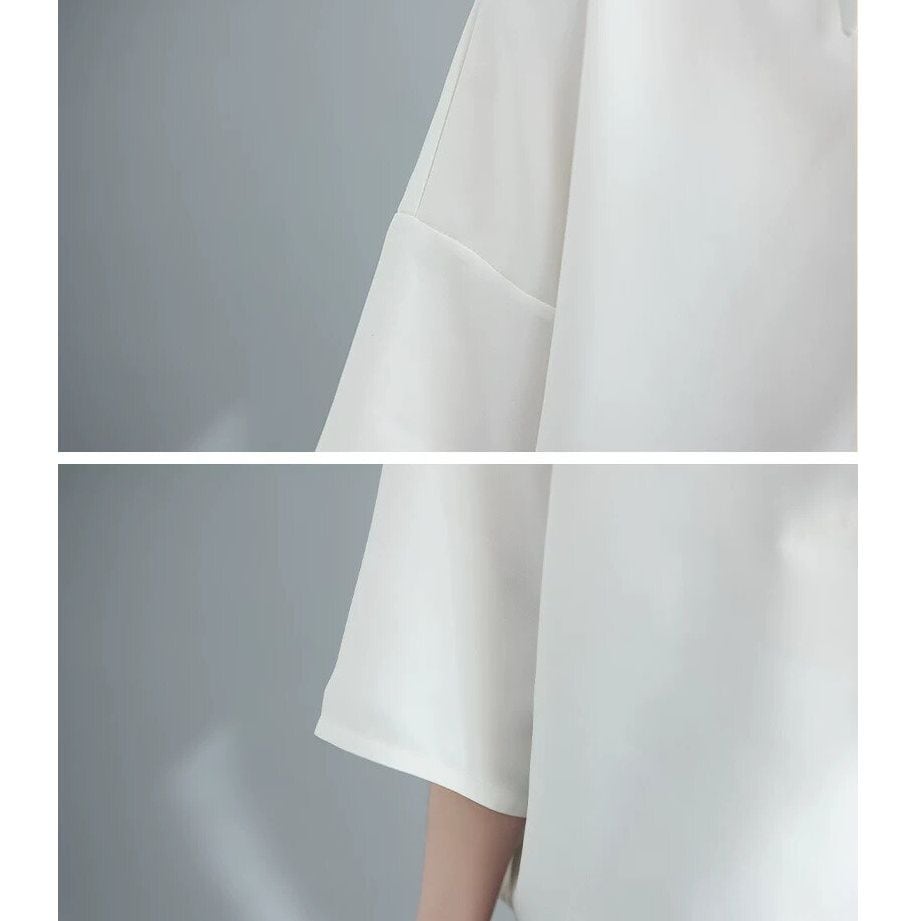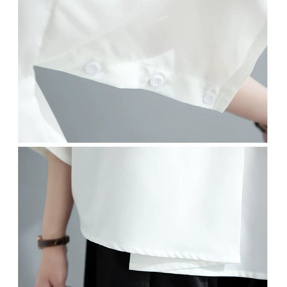 アシンメトリックなデザインがモードな、ポインテッドカラー・ハーフボタン・7分袖のデザインシャツです。単色のシンプルなデザインでコーディネートしやすい、クラシカルな雰囲気のアイテムです。色はブラックとホワイトの2色から選べます。 SIZE:※測り方によって2-3cmの差が生じる場合がございます。 【M】バスト108cm 肩幅49cm 袖丈50cm 着丈65cm 【L】バスト112cm 肩幅50cm 袖丈51cm 着丈66cm 【XL】バスト116cm 肩幅51cm 袖丈52cm 着丈67cm 【2XL】バスト120cm 肩幅52cm 袖丈53cm 着丈68cm 【3XL】バスト124cm 肩幅53cm 袖丈54cm 着丈70cm COLOR:White、Black 素材:ポリエステル、その他 モデル着用サイズ:L モデル情報:身長161cm 体重49kg お届けについて こちらの商品は海外店舗より直接発送となる為、 ご決済から到着までは、多くの場合【10日-2週間前後】でお届けしております。 ※在庫状況や輸送の混雑により、4週間前後かかる場合がございます。 注意事項 ・商品在庫切れにより注文キャンセルとさせていただく恐れもございますので、予めご了承くださいませ。 ・仕入れ工場を変えることがあるため、記載サイズと若干異なる場合がございます。 ・商品の色味は、お手持ちのスマートフォンの画面によって実物と若干異なる場合がございます。 ・イメージ違いやサイズ交換等、お客さまご都合による交換・返品はご遠慮ください。 送料について 全国一律580円(沖縄県は1,500円) ※10,000円以上のご注文で沖縄県を含む全国送料無料。 お支払い方法について ・クレジットカード決済(VISA/Mastercard/JCB/アメリカン・エクスプレス/ Diners Club) ・Amazon Pay ・PayPay ・コンビニ決済/Pay-easy ※前払いのお支払い方法 ・Pay ID あと払い(コンビニ払い、口座振替) ※あと払いのお支払い方法 ・キャリア決済(d払い/au PAY(auかんたん決済)/ソフトバンク・ワイモバイルまとめて支払い) 管理番号:M-16369