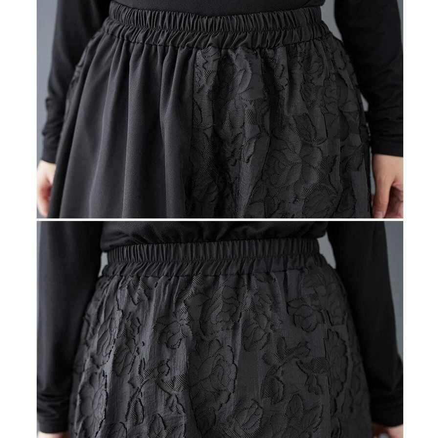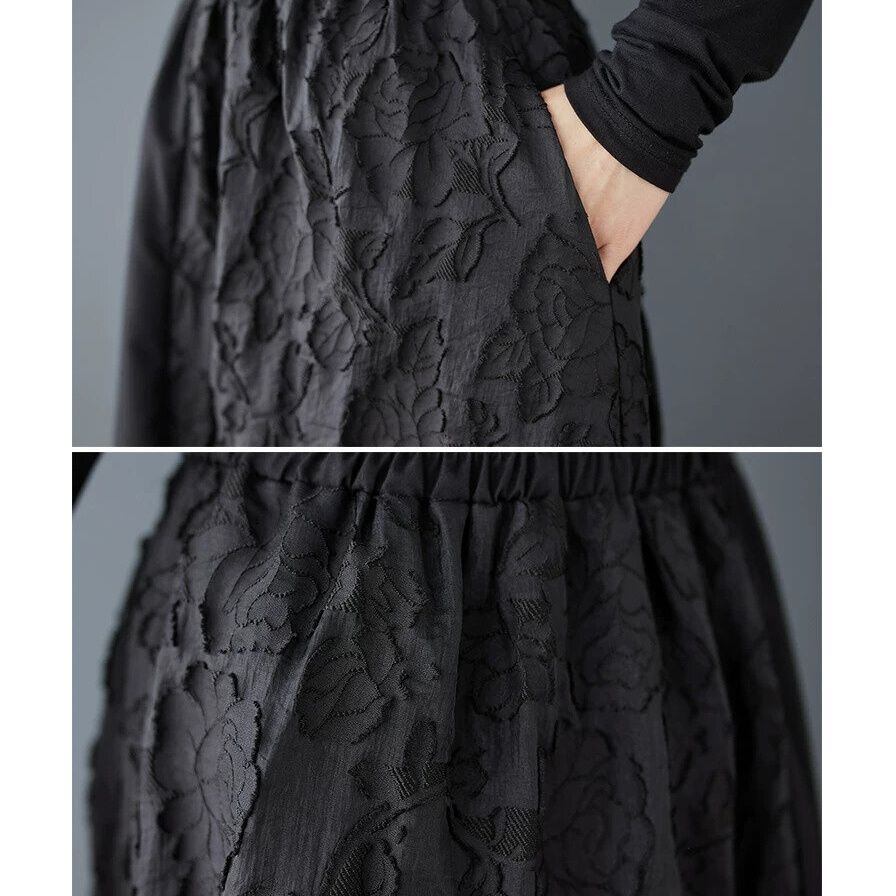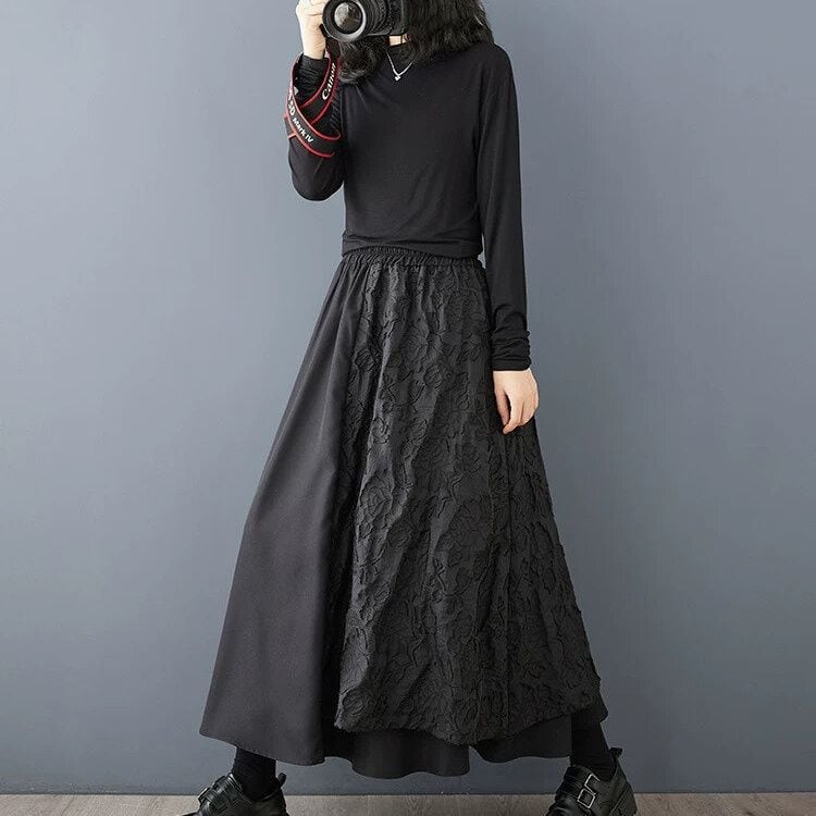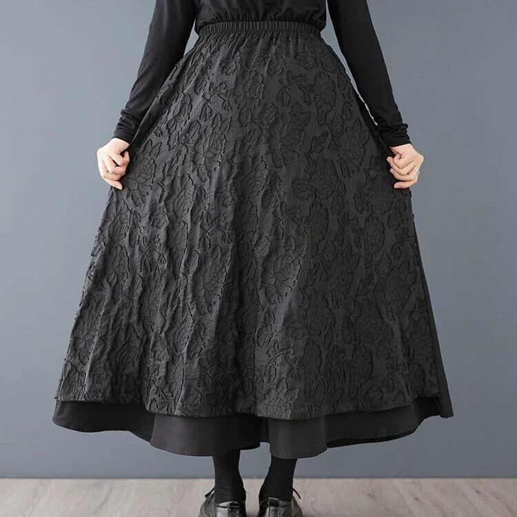凹凸柄素材の同色のレイヤーがおしゃれな、Aライン・ロング丈のデザインスカートです。ウエストはゴムなので、着脱が簡単で履き心地が良いです。大きく広がるAラインのシルエットが美しい、クラシカルな雰囲気のカジュアルアイテムです。