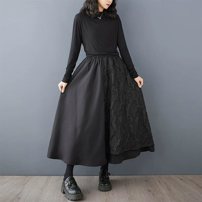 BLACK ELASTIC WAIST A-LINE LONG DESIGN SKIRT 1color M-16400