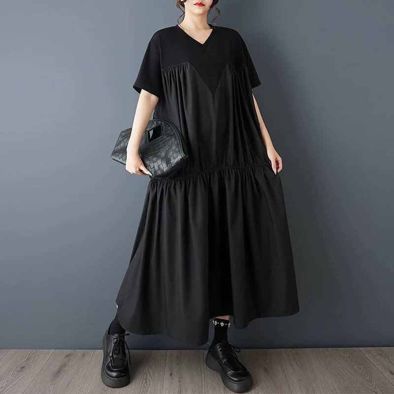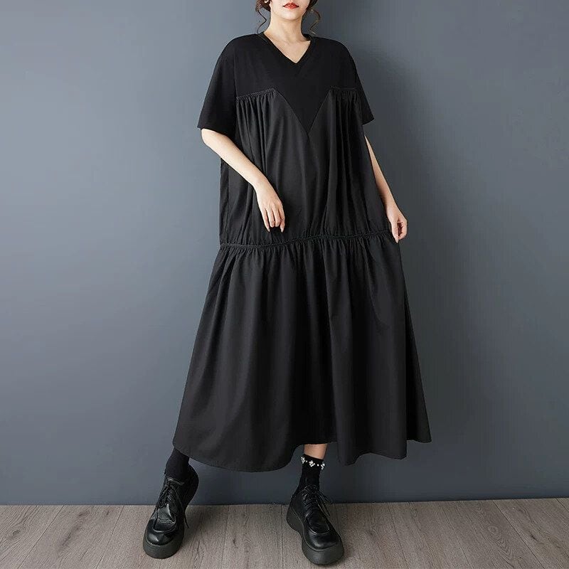 BLACK V-NECK HALF SLEEVES LONG PULLVER DESIGN DRESS 1color M-16401