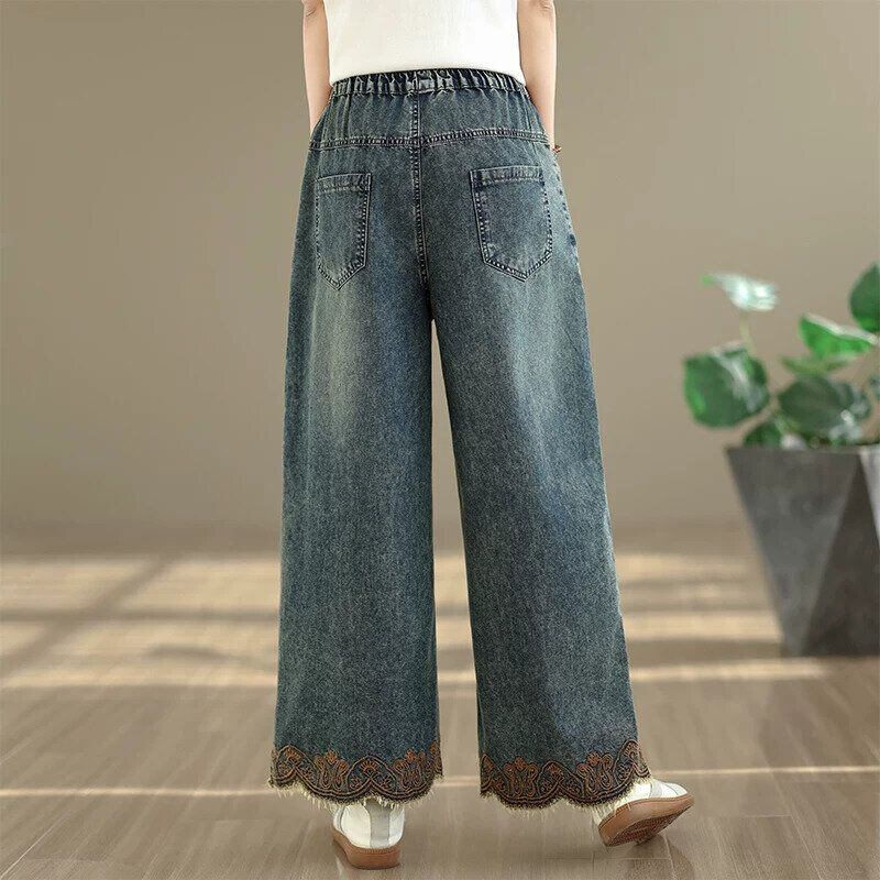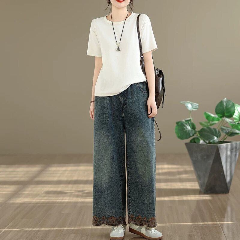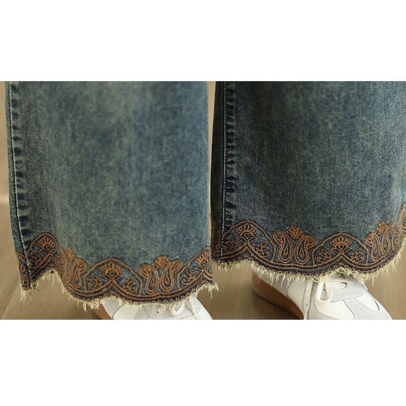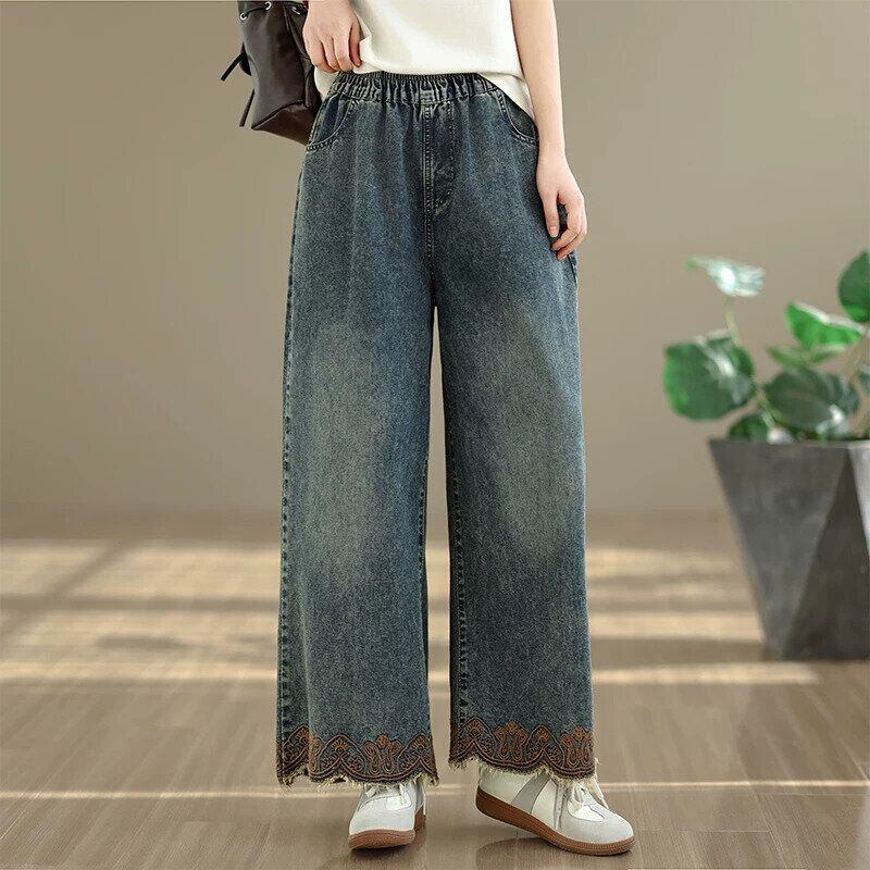 EMBROIDERED WAVY HEM ELASTIC WAIST DENIM PANTS 1color M-16404