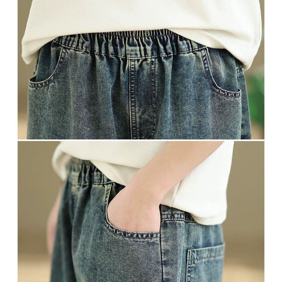 ウェイビーにカットされた裾にブラウンのレースのような刺繍がキュートな、ワイドレッグ・デニムパンツです。ウエストはゴムなので、着脱が簡単で履き心地が良いです。シンプルなデザインでコーディネートしやすい、カジュアルなアイテムです。