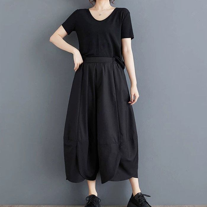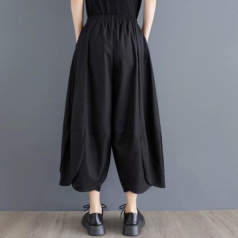BLACK ELASTIC WAIST CROPPED LANTERN PANTS 1color M-16406