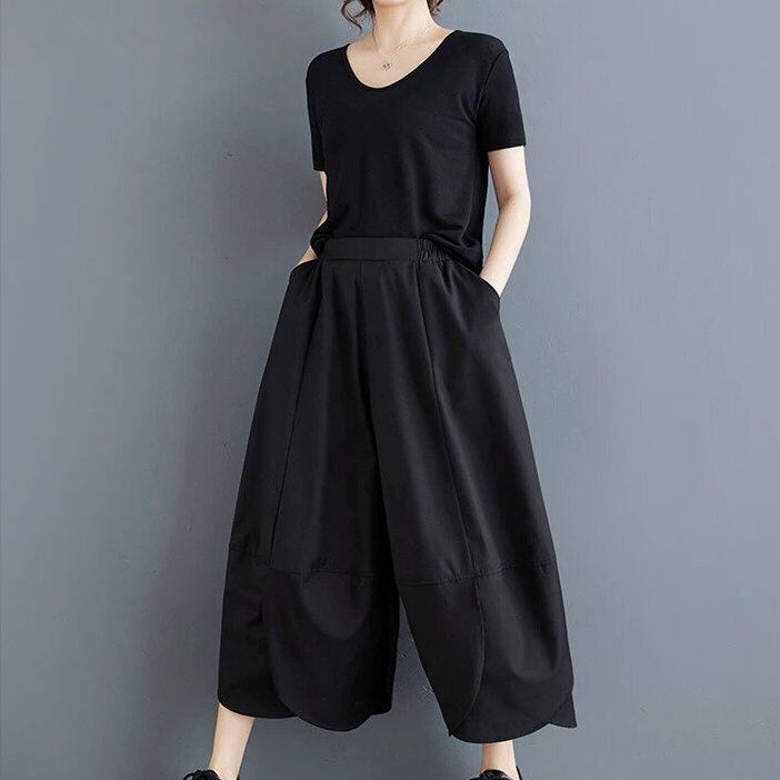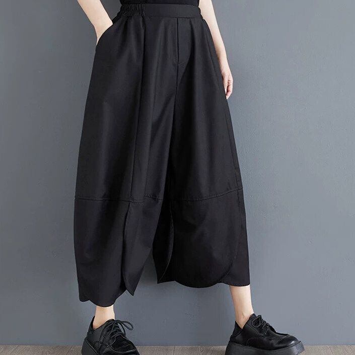 ブラックの単色素材でできた、ワイドレッグ・クロップドパンツです。ウエストは後ろ半分がゴムなので、すっきりとした見た目なのに着脱が簡単で履き心地が良いです。チューリップのような裾のデザインがおしゃれな、モードな印象のアイテムです。
