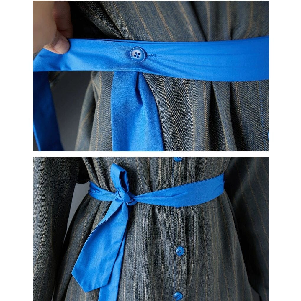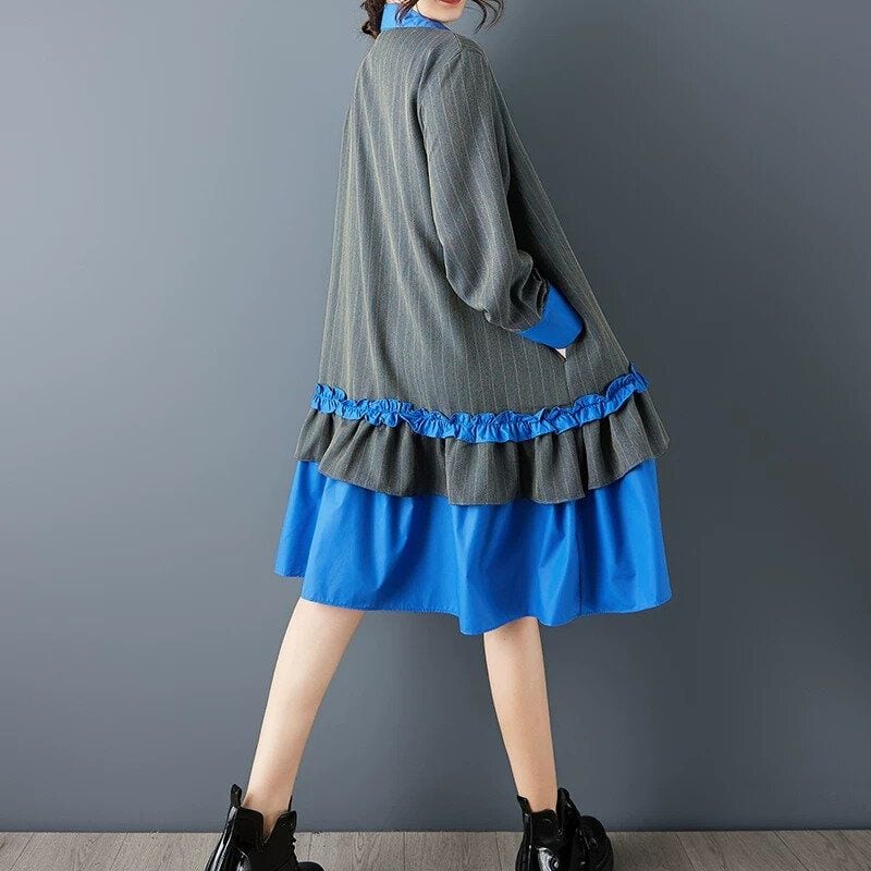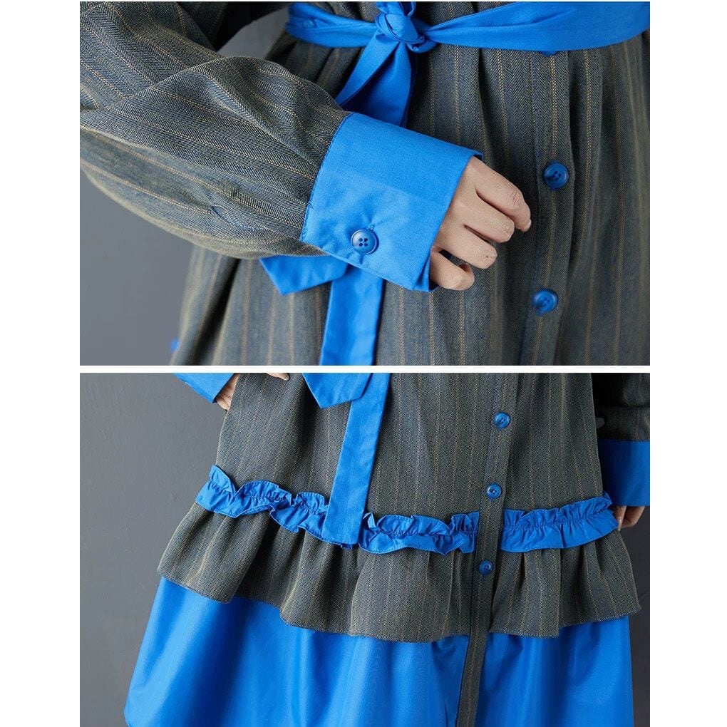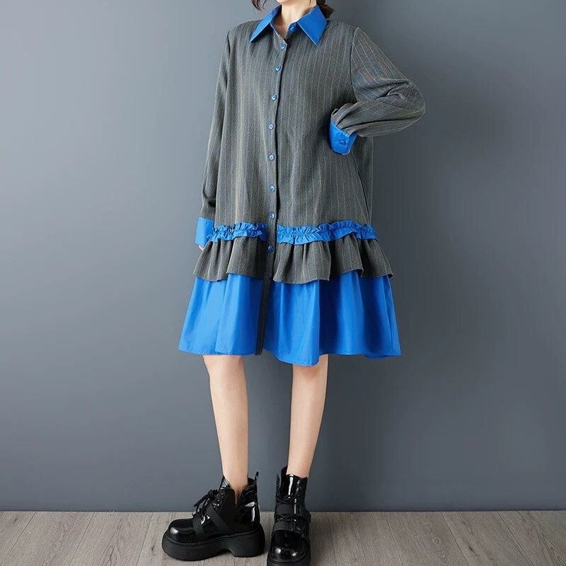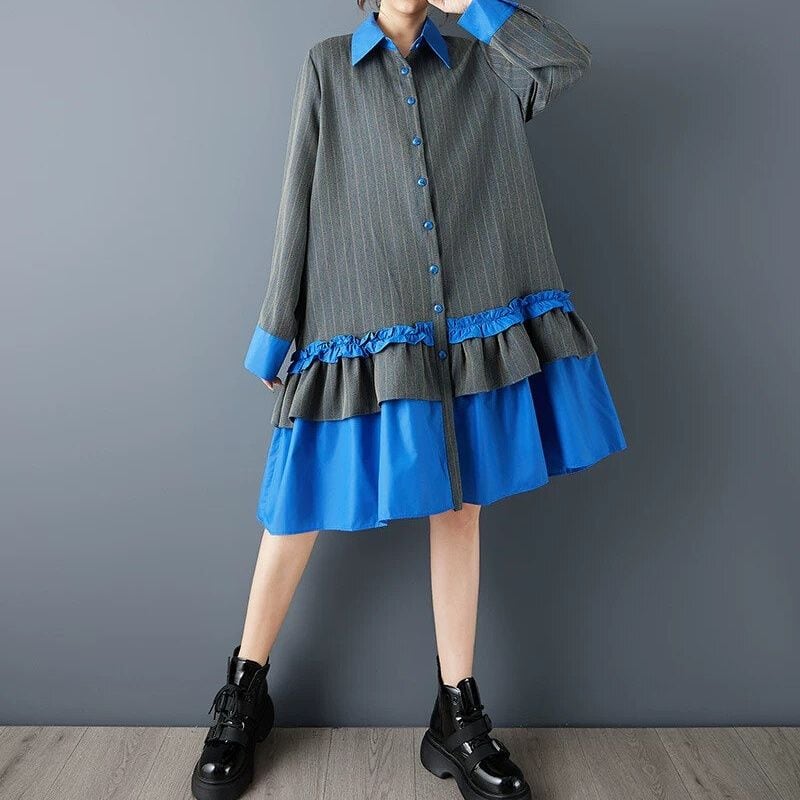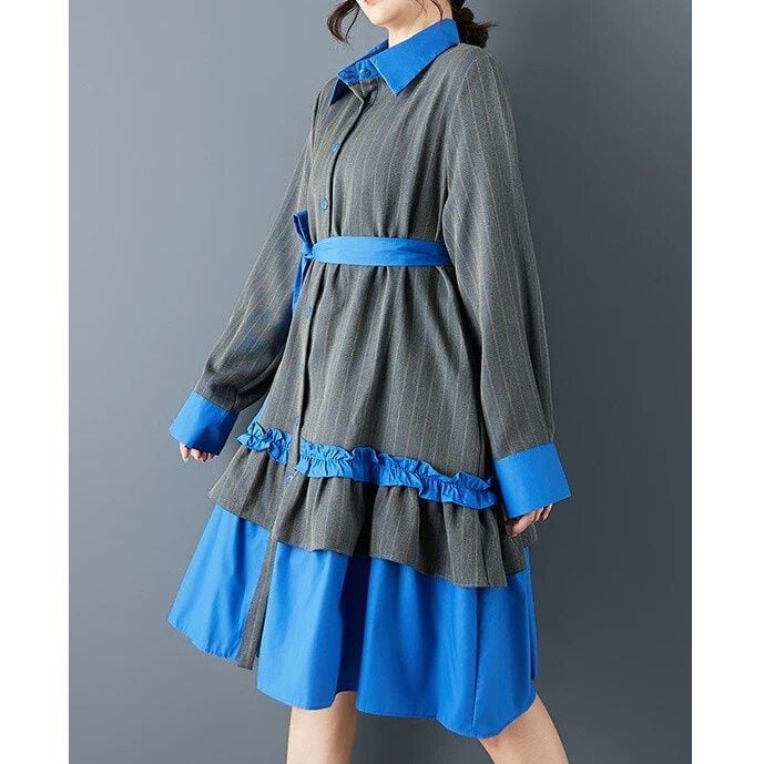 グレーとブルーのコントラストが目を惹く、ポロ襟・長袖・ミドル丈のシャツワンピースです。ゆったりとしたAラインのシルエットは、リボンベルトでアレンジすると印象が変わります。襟・袖口・ボタン・フリルリボンの鮮やかなブルーがアクセントになった、クールさとガーリーさがミックスされたアイテムです。