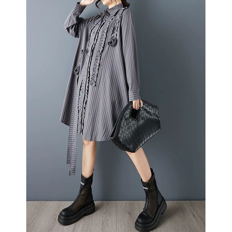 グレーのデザインストライプがおしゃれな、ポロ襟・長袖・ひざ丈のシャツワンピースです。同素材のフリルリボンや立体フラワーモチーフ、裾よりも長く垂れるリボンがあしらわれた、クールさとガーリーさが混在したアイテムです。