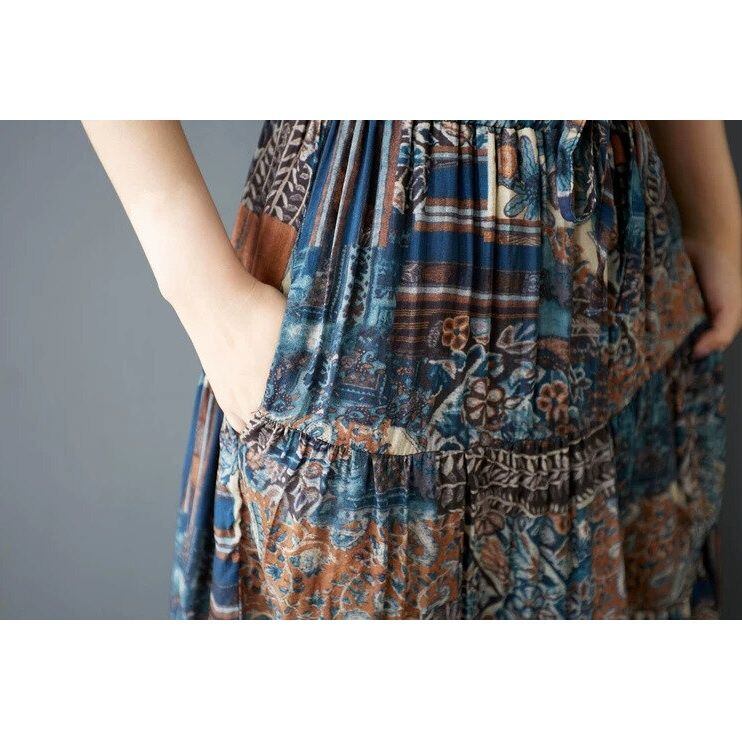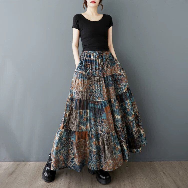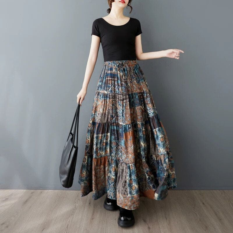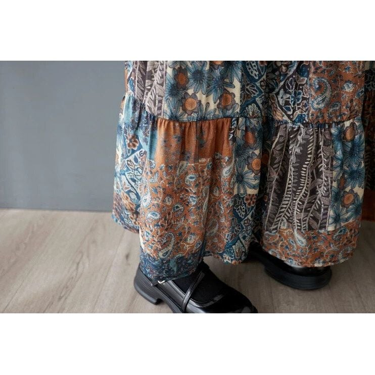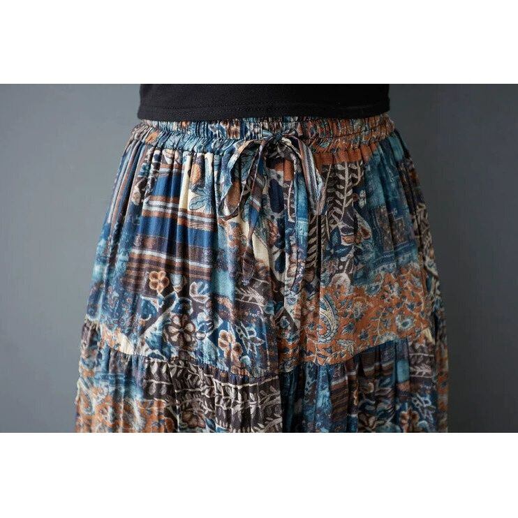 レトロでエスニックな柄生地がおしゃれな、Aライン・マキシ丈のデザインスカートです。ウエストはゴム+ドローストリングで、履き心地がいいです。軽く滑らかな素材のティアードデザインで、シルエットが美しいエレガントな印象のアイテムです。