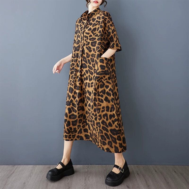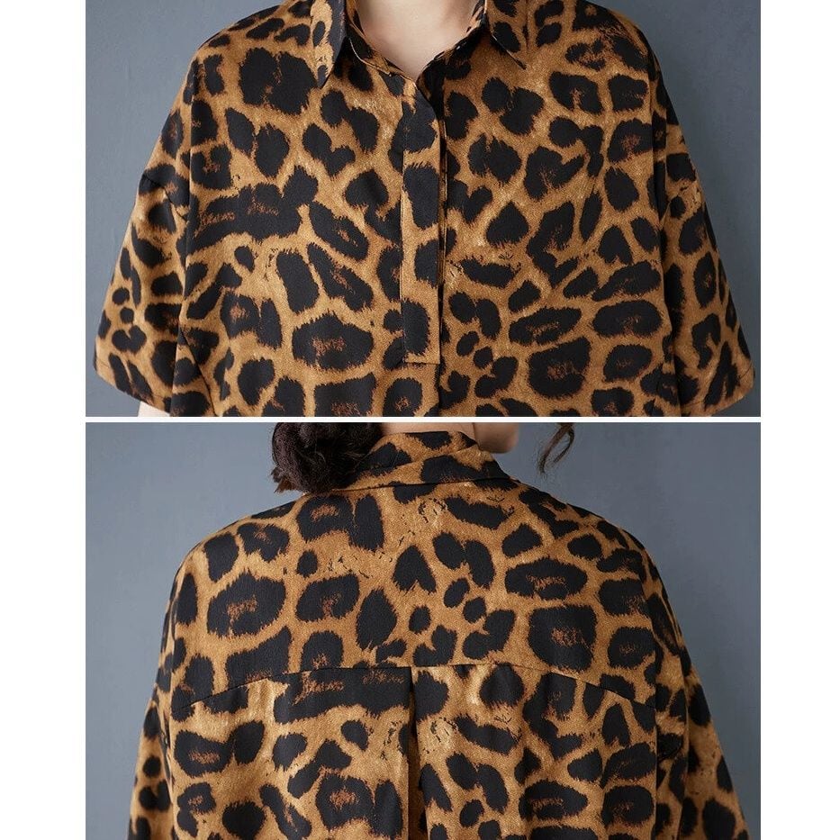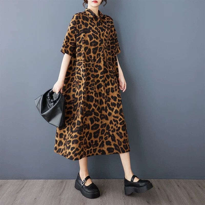 LEOPARD HALF SLEEVES MIDI A-LINE SHIRT DRESS 1color M-16430