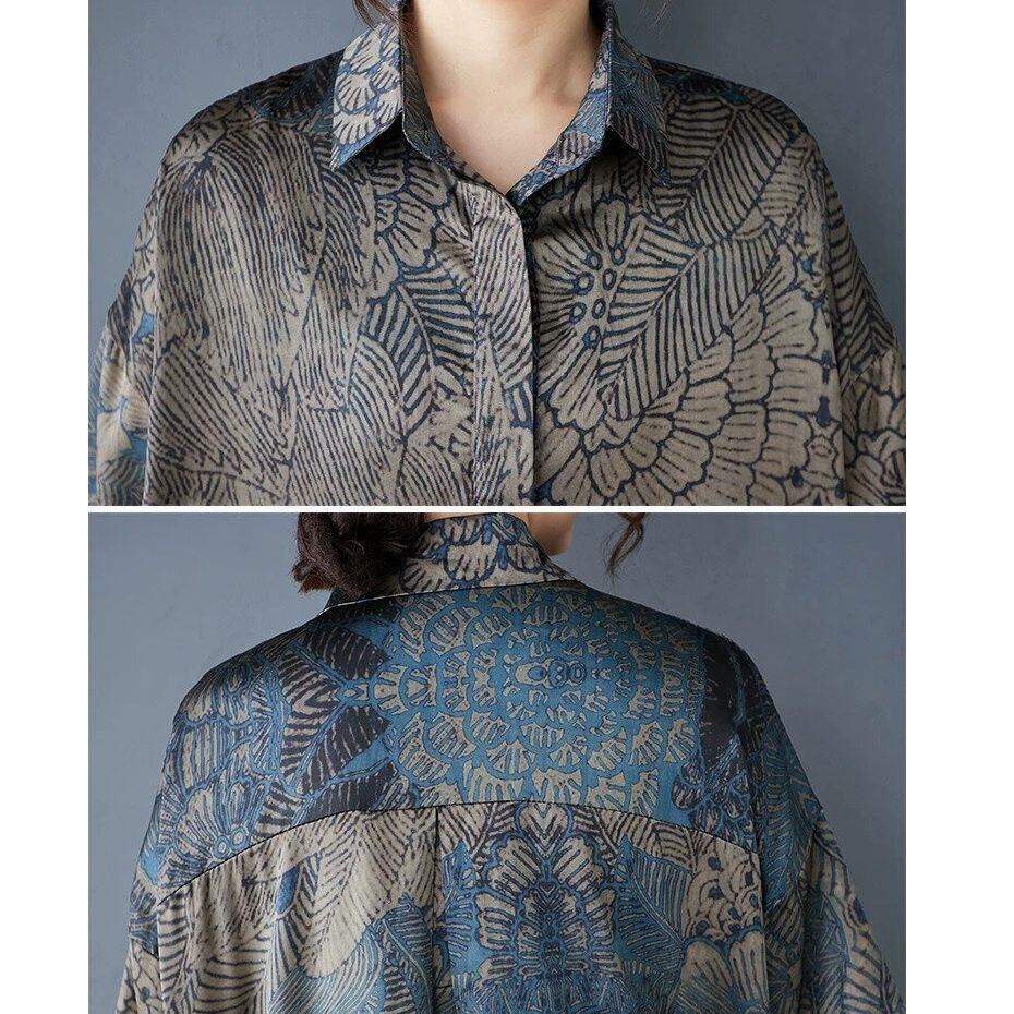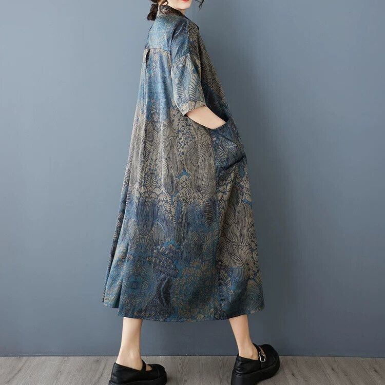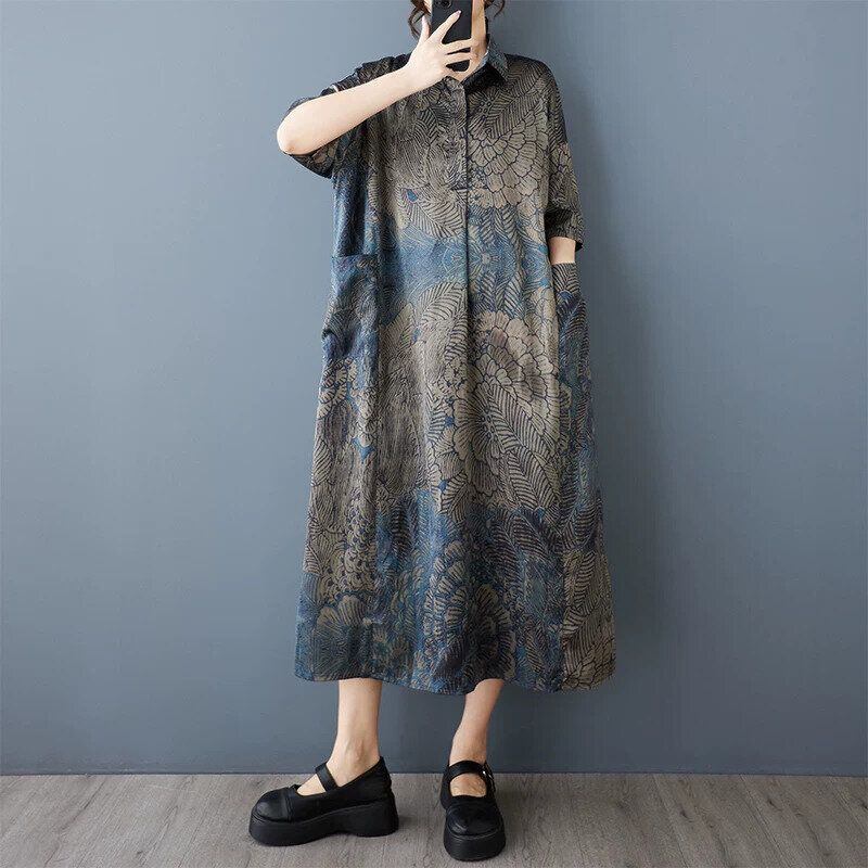ブルーやグレーのアーティスティックなプリント生地が目を惹く、ポロ襟・ハーフボタン・半そで・ひざ下丈のシャツワンピースです。柔らかく滑らかな素材のゆったりとしたAラインで、リラックスした印象のカジュアルアイテムです。