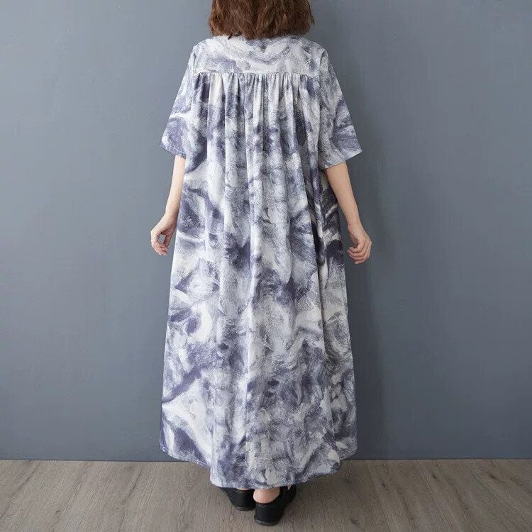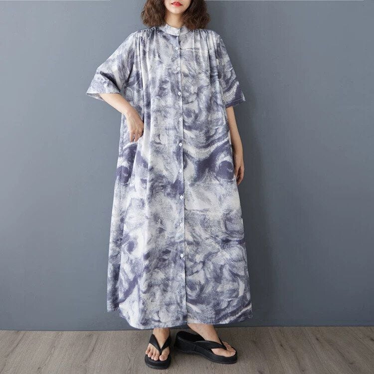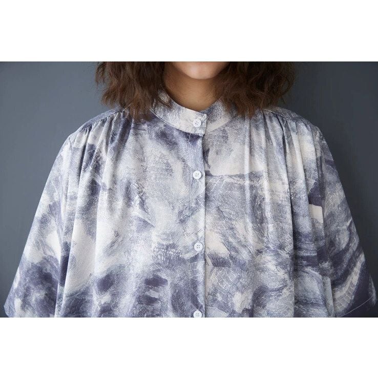 アーティスティックなマーブル柄が美しい、スタンドカラー・半袖・ロング丈のシャツワンピースです。ゆったりとしたAラインのシルエットが魅力的な、リラックスした印象のカジュアルアイテムです。
