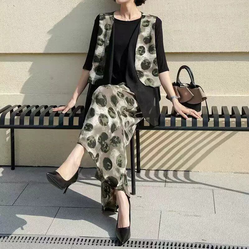 ※こちらの商品はトップスとボトムスのツーピース(セットアップ)商品になります。 柄生地でできたデザインベストとワイドレッグパンツに、インナー用のブラックシャツがついた3点セットです。インナーシャツは、ボートネック・7分袖のシンプルなデザインで、他アイテムとも合わせやすいです。パンツはスカートのようなAラインシルエットが魅力的で、エレガントな印象のアイテムです。 SIZE:※測り方によって2-3cmの差が生じる場合がございます。 <VEST> 【M】バスト118cm 肩幅38cm 着丈(前/後)58/78cm 【L】バスト120cm 肩幅39cm 着丈(前/後)59/79cm 【XL】バスト122cm 肩幅40cm 着丈(前/後)60/80cm 【2XL】バスト124cm 肩幅41cm 着丈(前/後)61/81cm <BOTTOMS> 【M】ウエスト64-98cm ヒップ136cm 裾幅100cm 着丈92cm 【L】ウエスト66-100cm ヒップ138cm 裾幅101cm 着丈93cm 【XL】ウエスト68-102cm ヒップ140cm 裾幅102cm 着丈94cm 【2XL】ウエスト70-104cm ヒップ142cm 裾幅103cm 着丈95cm <TOPS> 【M】バスト90cm 肩幅37cm 着丈(前/後)56/52cm 【L】バスト92cm 肩幅38cm 着丈(前/後)57/53cm 【XL】バスト94cm 肩幅39cm 着丈(前/後)58/54cm 【2XL】バスト96cm 肩幅40cm 着丈(前/後)59/55cm COLOR:Red Flower、 Polka Dots、Green Flower 素材:ポリエステル、その他 モデル着用サイズ:L モデル情報:身長161cm 体重49kg STYLE CALENDAR:春◎ 夏◎ 秋〇 冬△ お届けについて こちらの商品は海外店舗より直接発送となる為、 ご決済から到着までは、多くの場合【10日-2週間前後】でお届けしております。 ※在庫状況や輸送の混雑により、4週間前後かかる場合がございます。 注意事項 ・商品在庫切れにより注文キャンセルとさせていただく恐れもございますので、予めご了承くださいませ。 ・仕入れ工場を変えることがあるため、記載サイズと若干異なる場合がございます。 ・商品の色味は、お手持ちのスマートフォンの画面によって実物と若干異なる場合がございます。 ・イメージ違いやサイズ交換等、お客さまご都合による交換・返品はご遠慮ください。 送料について 全国一律580円(沖縄県は1,500円) ※10,000円以上のご注文で沖縄県を含む全国送料無料。 お支払い方法について ・クレジットカード決済(VISA/Mastercard/JCB/アメリカン・エクスプレス/ Diners Club) ・Amazon Pay ・PayPay ・コンビニ決済/Pay-easy ※前払いのお支払い方法 ・Pay ID あと払い(コンビニ払い、口座振替) ※あと払いのお支払い方法 ・キャリア決済(d払い/au PAY(auかんたん決済)/ソフトバンク・ワイモバイルまとめて支払い) 管理番号:M-16440