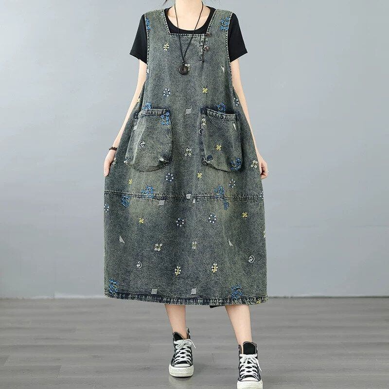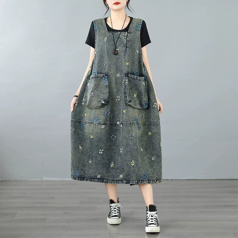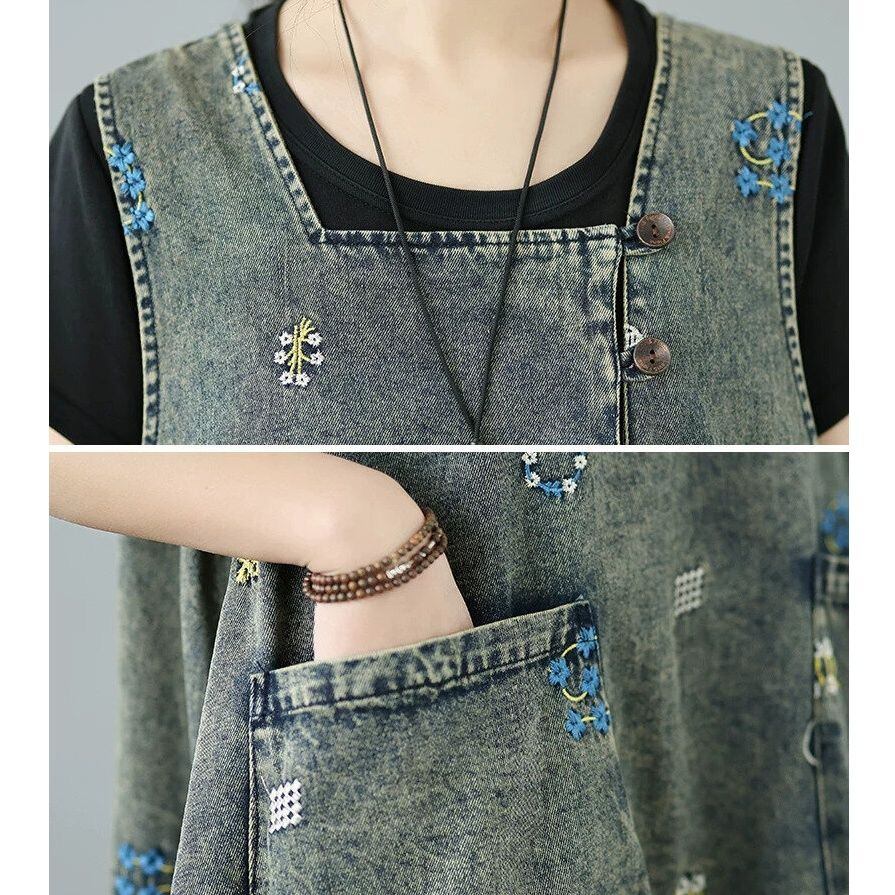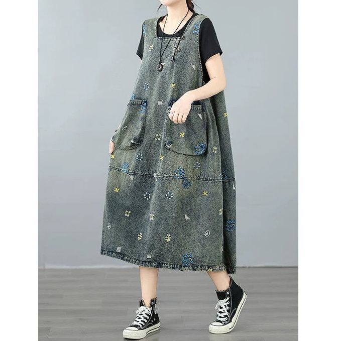 EMBROIDERED SQUARE NECK SLEEEESS MIDI DENIM JUMPER DRESS 1color M-16447
