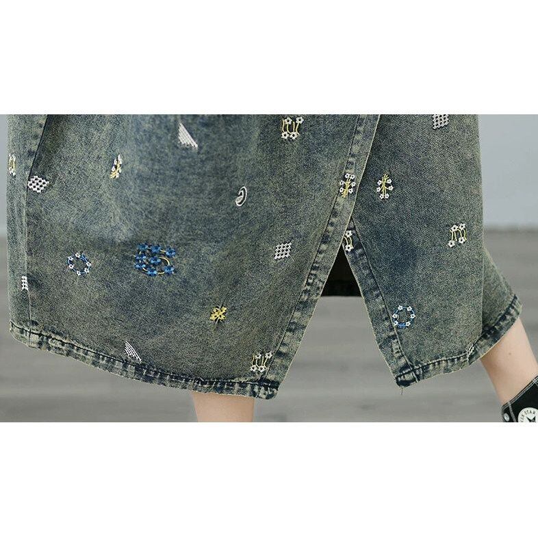 刺繍で作られた柄がキュートな、スクエアネック・ノースリーブ・ミドル丈のデニムジャンパースカートです。ゆったりとしたAラインのシルエットで、裾はバックのセンターにスリットが入って歩きやすいです。立体的なポケットやボタン飾りがおしゃれな、コーディネートの主役になるカジュアルアイテムです。