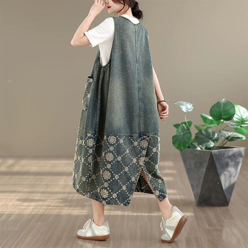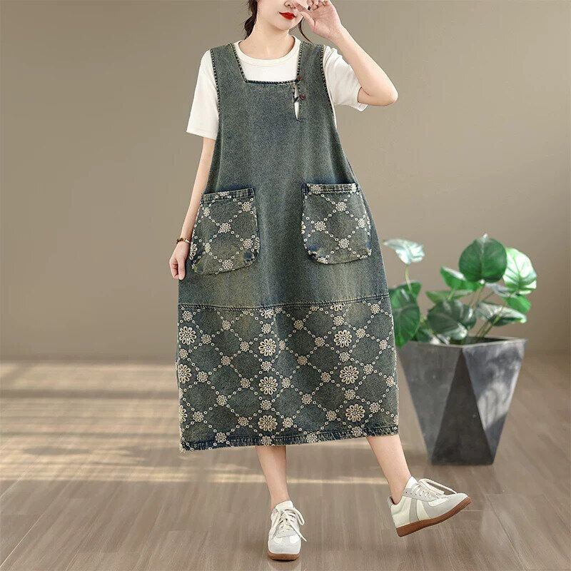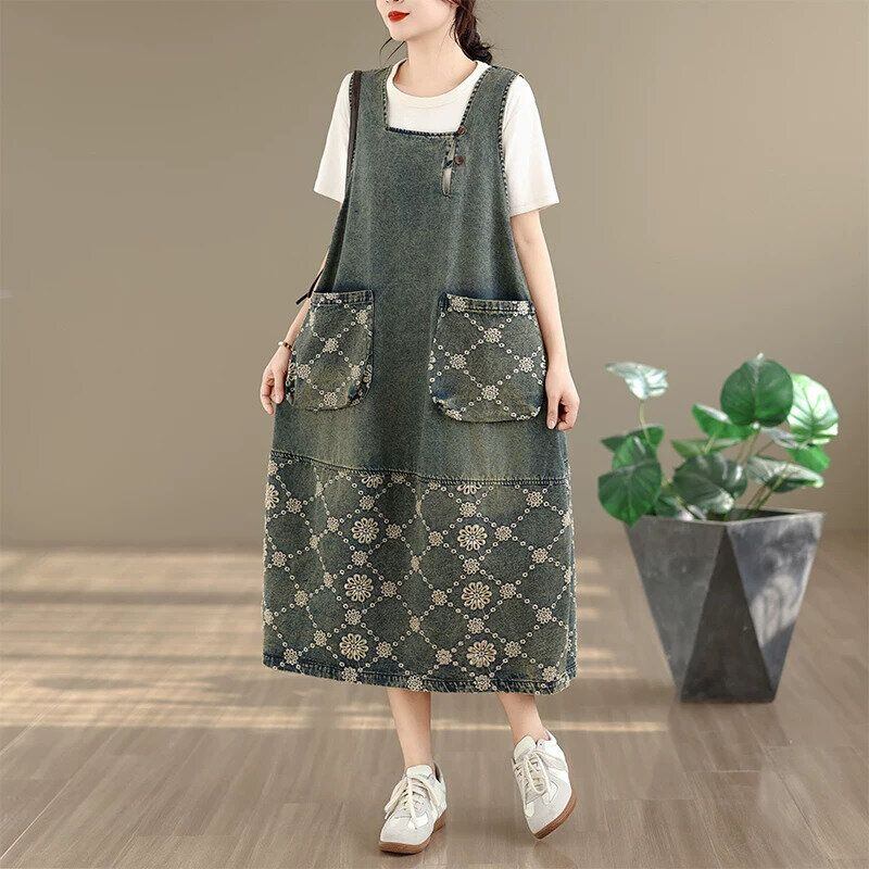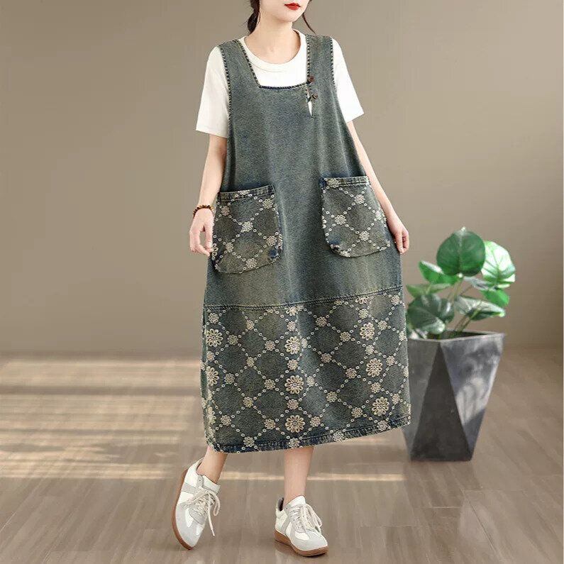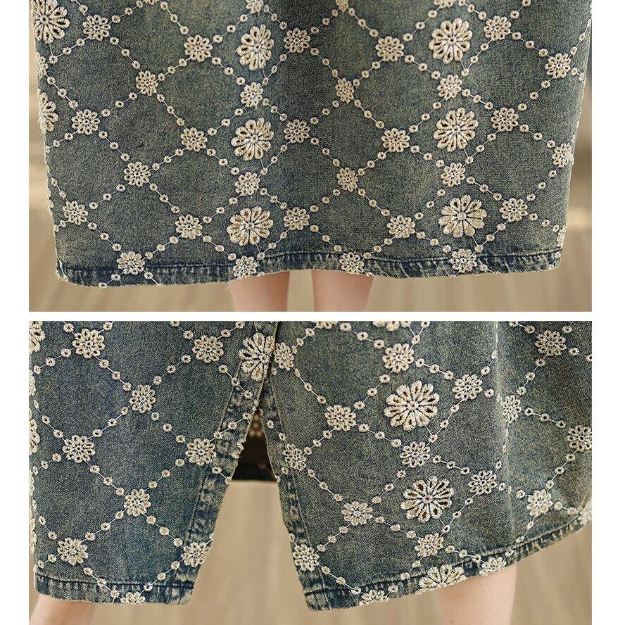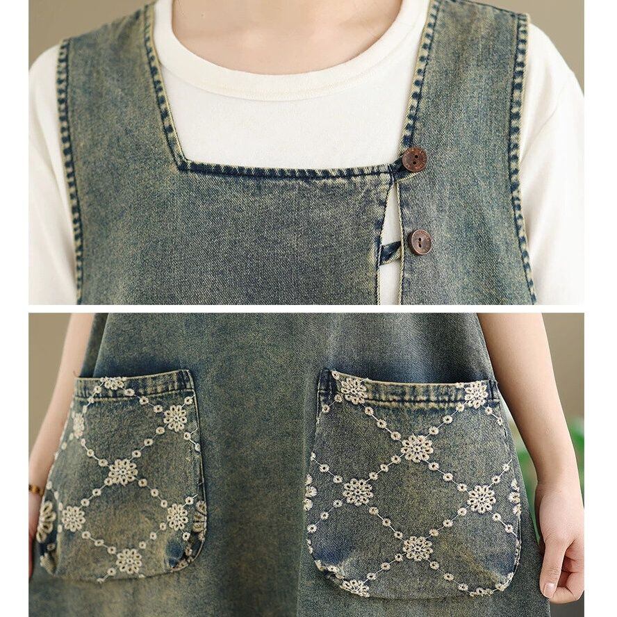 EMBROIDERED STITCHED SQUARE NECK MIDI DENIM JUMPER DRESS 1color M-16453