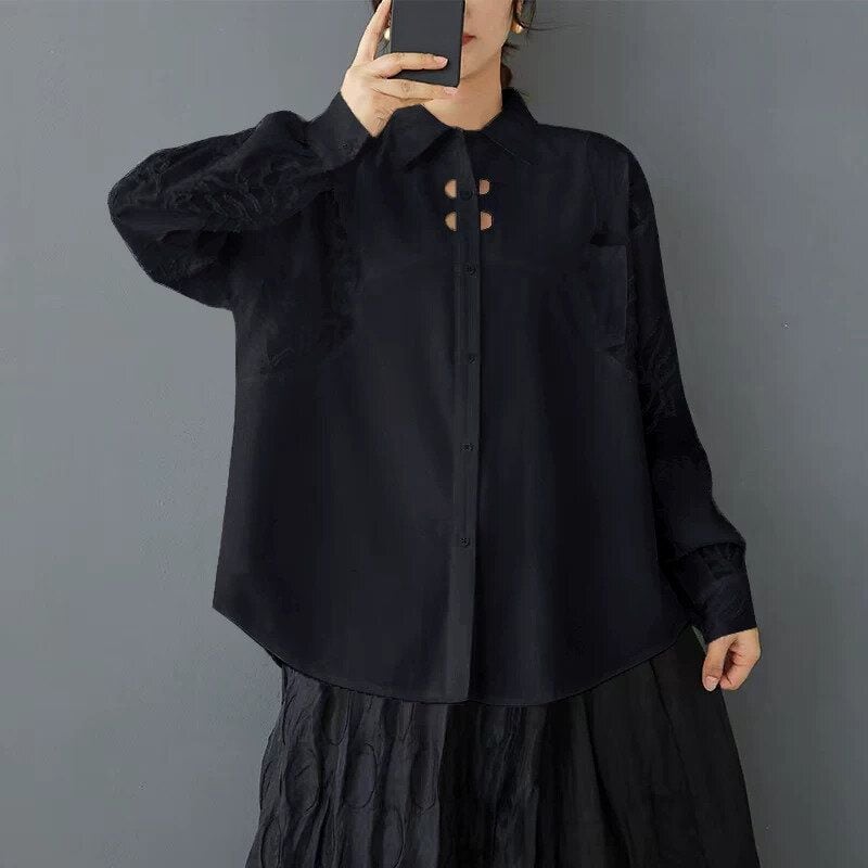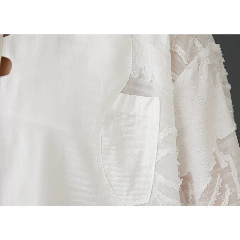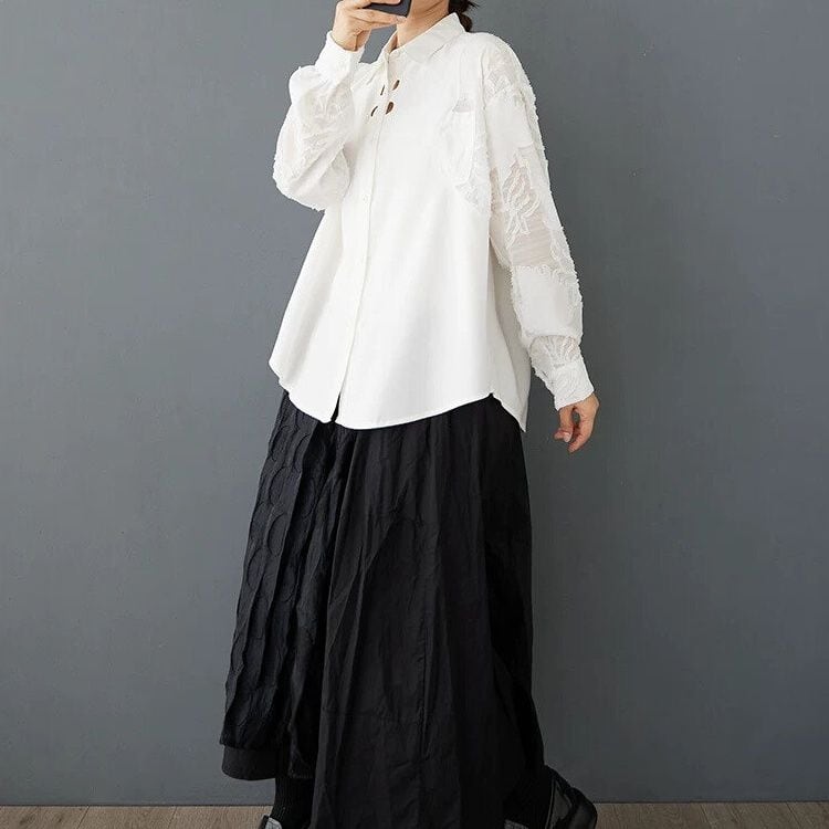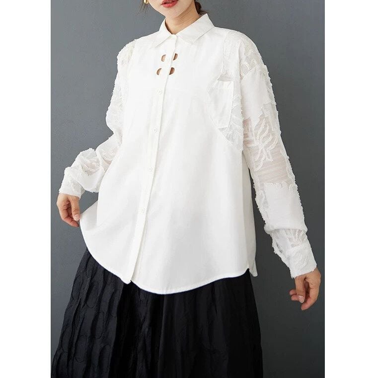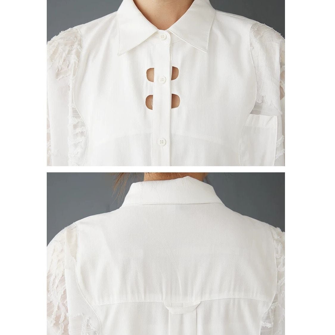 レースのように透け感のある凹凸柄の素材でできた袖がおしゃれな、ポロ襟・長袖・ラウンドカットのデザインシャツです。2つ目のボタンの周りに施されたホールがアクセントになった、単色で合わせやすいゆったりとしたシルエットのアイテムです。色は2色から選べます。