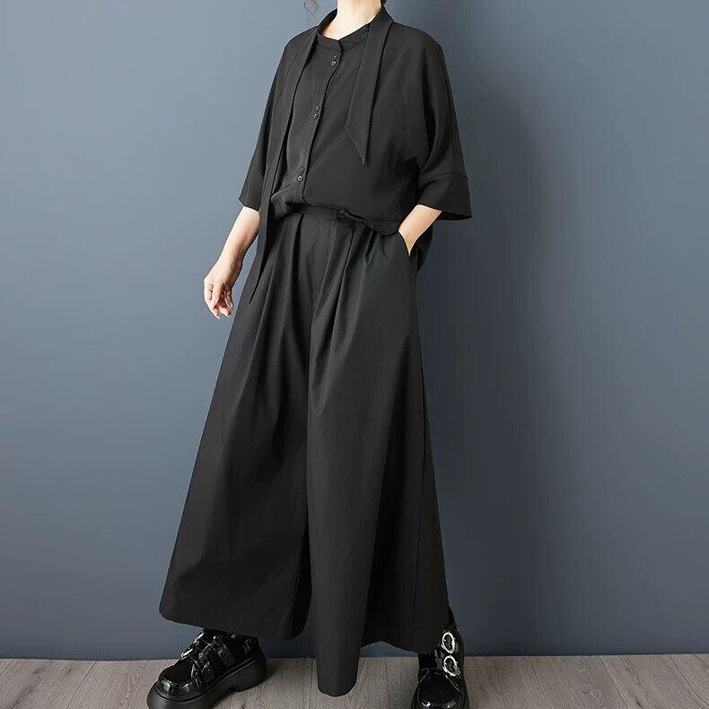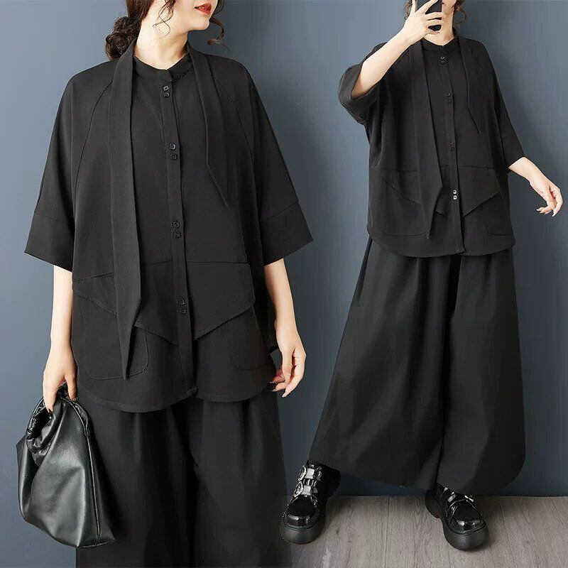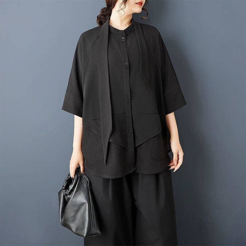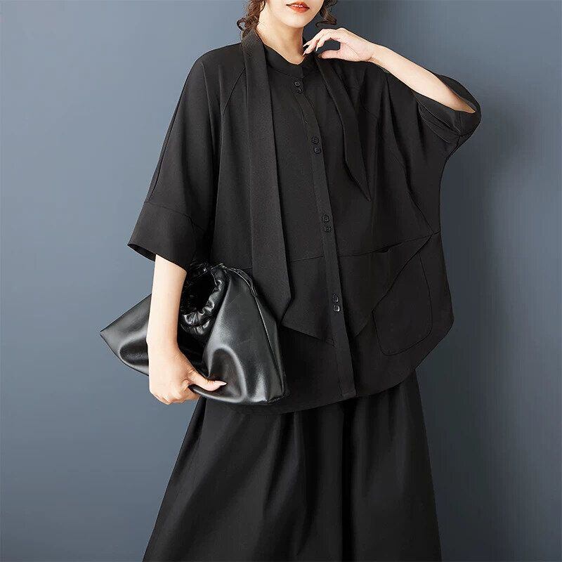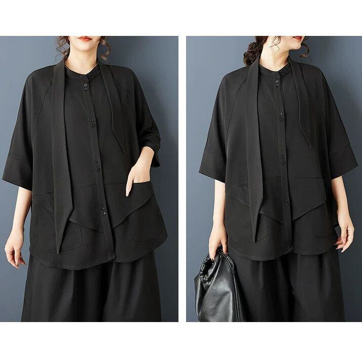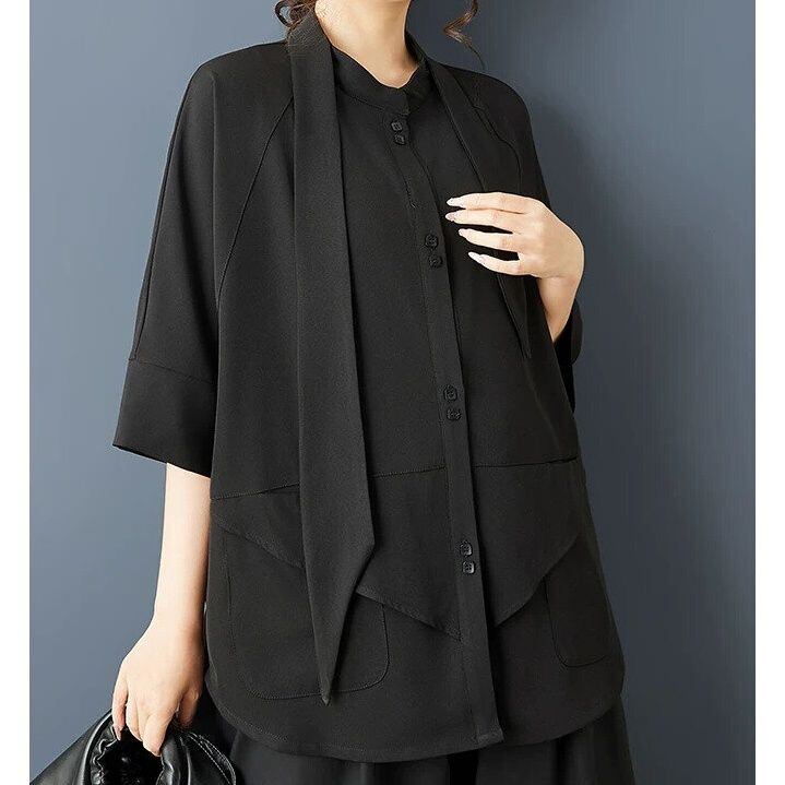 ボウタイのついたスタンドカラーがおしゃれな、ブラックの7分袖・ラウンドカットのシャツジャケットです。ボタンの並びやスティッチラインがユニークな、ゆったりとしたワイド幅のシルエットがエレガントなアイテムです。