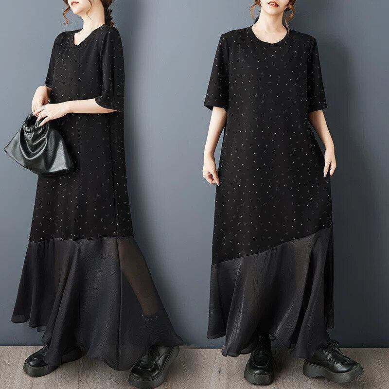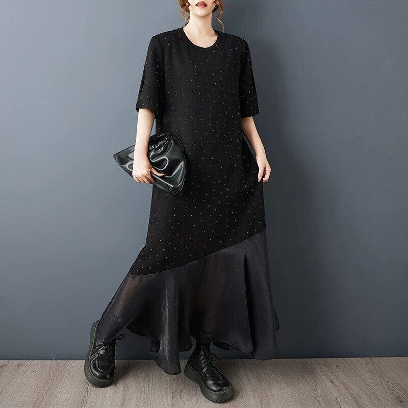 BLACK ROUND NECK HALF SLEEVES LONG MERMAID PULLOVER DRESS 1color M-16471