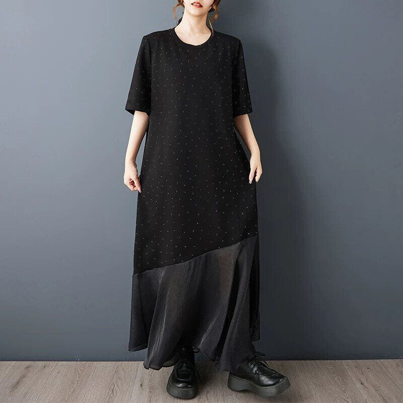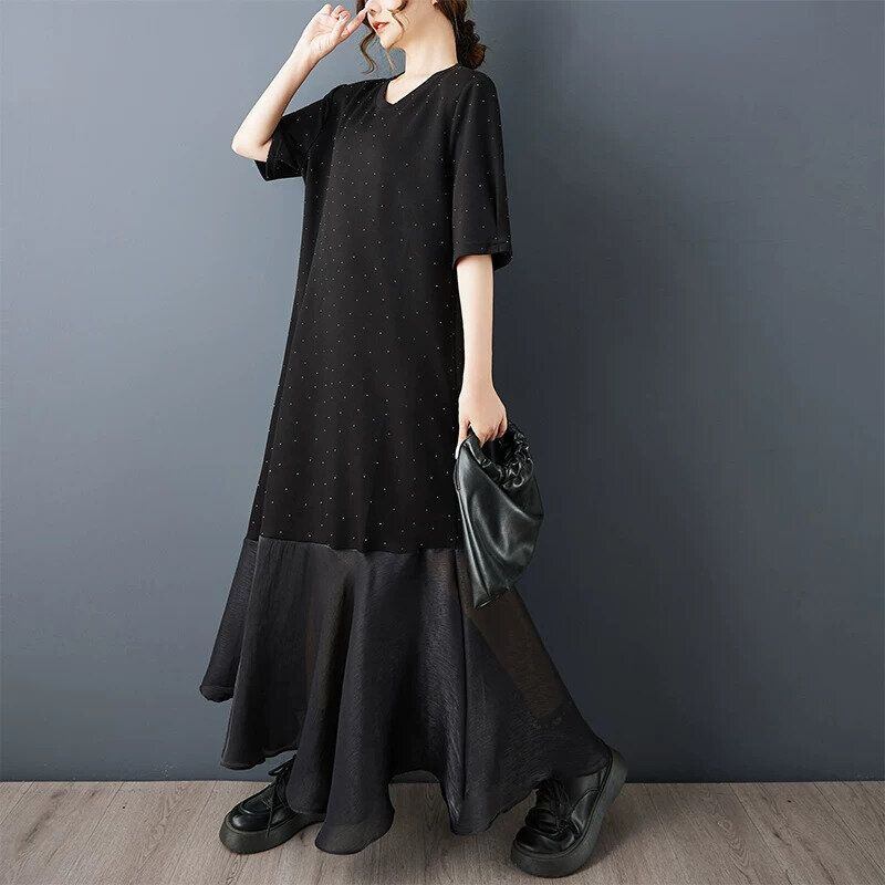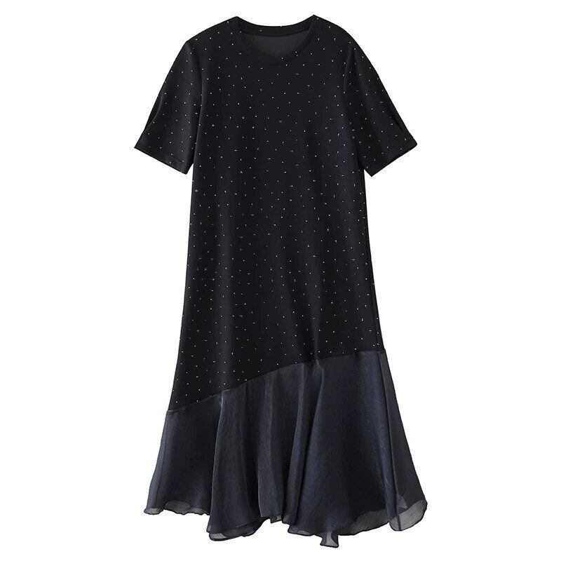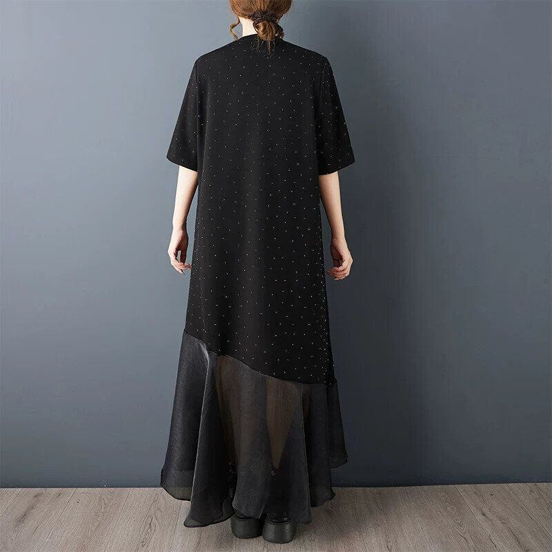 ブラック地にラインストーンが散りばめられた、ラウンドネック・半そで・ロング丈のプルオーバーデザインドレスです。透け感のある大きなフリルのような裾が作る、ゆったりとしたマーメイドシルエットが美しい、エレガントな印象のアイテムです。