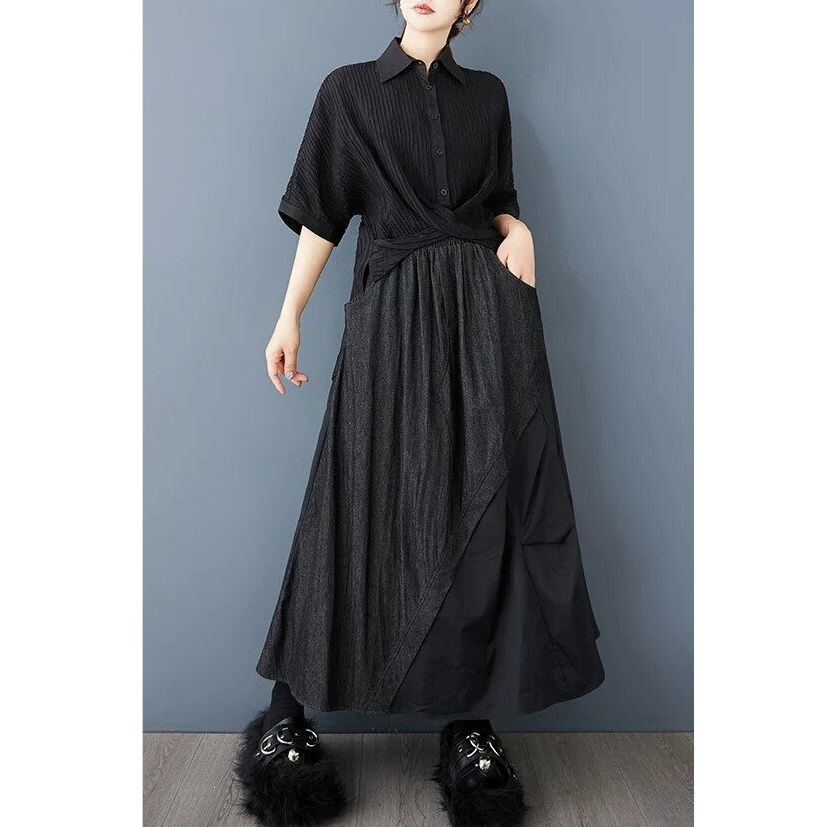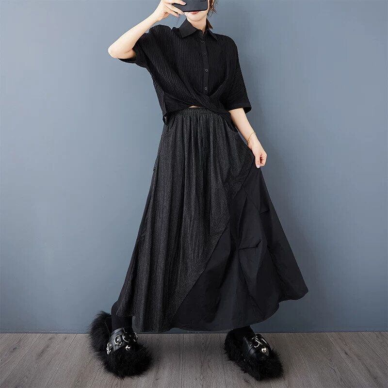 ブラックの三角スティッチが作るいびつなシルエットがおしゃれな、Aライン・ロング丈のデニムスカートです。ウエストはゴムなので、着脱が簡単で履き心地が良いです。オールブラックでコーディネートしやすい、クールでエレガントな印象のカジュアルアイテムです。
