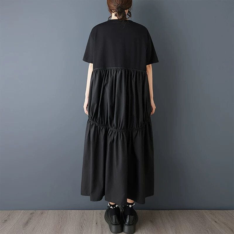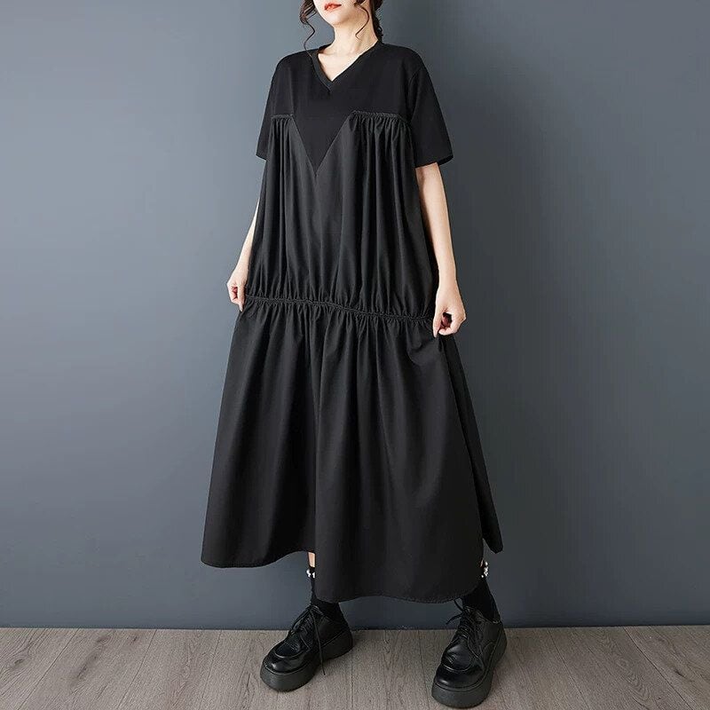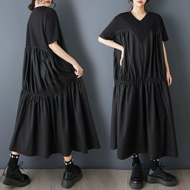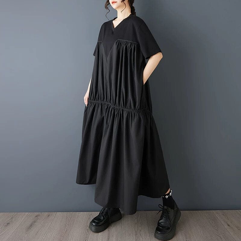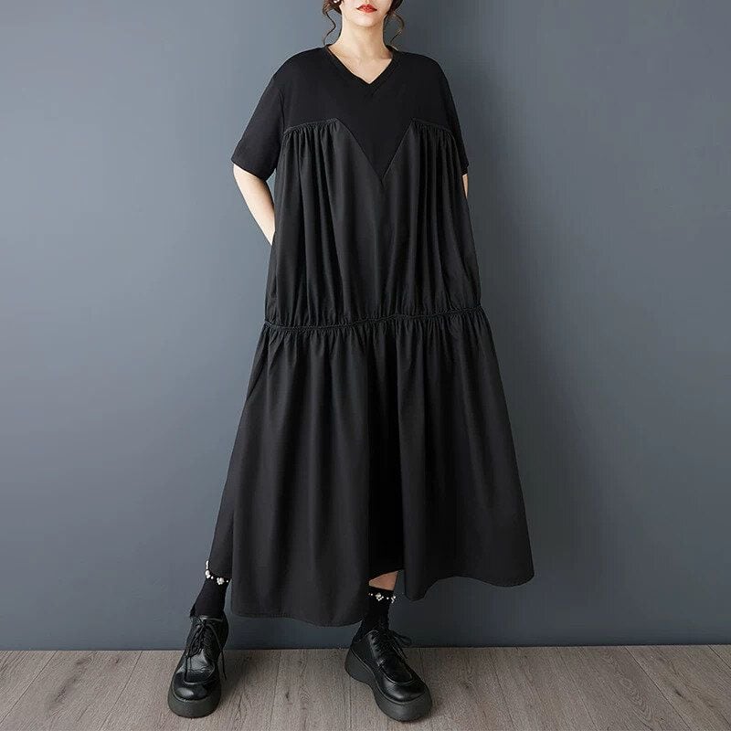 BLACK V-NECK STITCH DESIGN HALF SLEEVES LONG PULLOVER DRESS 1color M-16480