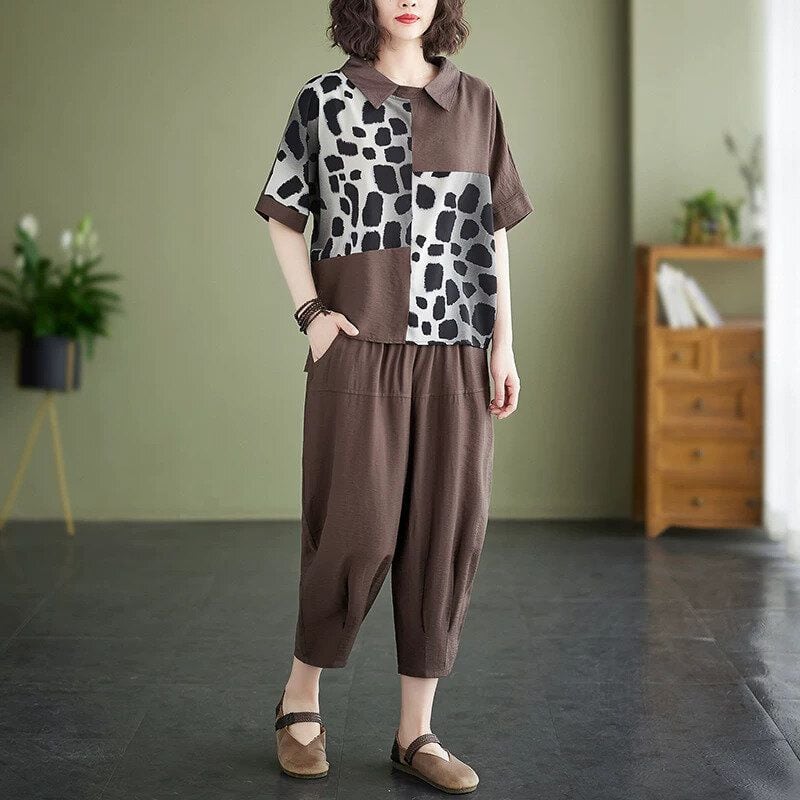 ※こちらの商品はトップスとボトムスのツーピース(セットアップ)商品になります。 柄生地と無地のブロックスティッチがおしゃれな襟付きTシャツと、ハーレムパンツのセットアップです。パンツはウエストがゴムなので、着脱が簡単です。上下ともにゆったりとしたシルエットでリラックスした雰囲気の、着心地がいいカジュアルアイテムです。色は2色から選べます。 SIZE:※測り方によって2-3cmの差が生じる場合がございます。 【M】バスト116cm 裄丈35cm 袖口38cm 着丈58-68cm ヒップ120cm ウエスト65-108cm 裾幅38cm パンツ丈80cm 【L】バスト120cm 裄丈36cm 袖口39cm 着丈59-69cm ヒップ124cm ウエスト68-112cm 裾幅39cm パンツ丈80cm 【XL】バスト124cm 裄丈37cm 袖口40cm 着丈60-70cm ヒップ128cm ウエスト70-116cm 裾幅40cm パンツ丈80cm 【2XL】バスト128cm 裄丈38cm 袖口41cm 着丈61-71cm ヒップ132cm ウエスト72-120cm 裾幅40cm パンツ丈80cm COLOR:Brown、Black 素材:ポリエステル、その他 モデル着用サイズ:L モデル情報:身長161cm 体重49kg STYLE CALENDAR:春〇 夏◎ 秋〇 冬△ お届けについて こちらの商品は海外店舗より直接発送となる為、 ご決済から到着までは、多くの場合【10日-2週間前後】でお届けしております。 ※在庫状況や輸送の混雑により、4週間前後かかる場合がございます。 注意事項 ・商品在庫切れにより注文キャンセルとさせていただく恐れもございますので、予めご了承くださいませ。 ・仕入れ工場を変えることがあるため、記載サイズと若干異なる場合がございます。 ・商品の色味は、お手持ちのスマートフォンの画面によって実物と若干異なる場合がございます。 ・イメージ違いやサイズ交換等、お客さまご都合による交換・返品はご遠慮ください。 送料について 全国一律580円(沖縄県は1,500円) ※10,000円以上のご注文で沖縄県を含む全国送料無料。 お支払い方法について ・クレジットカード決済(VISA/Mastercard/JCB/アメリカン・エクスプレス/ Diners Club) ・Amazon Pay ・PayPay ・コンビニ決済/Pay-easy ※前払いのお支払い方法 ・Pay ID あと払い(コンビニ払い、口座振替) ※あと払いのお支払い方法 ・キャリア決済(d払い/au PAY(auかんたん決済)/ソフトバンク・ワイモバイルまとめて支払い) 管理番号:M-16486